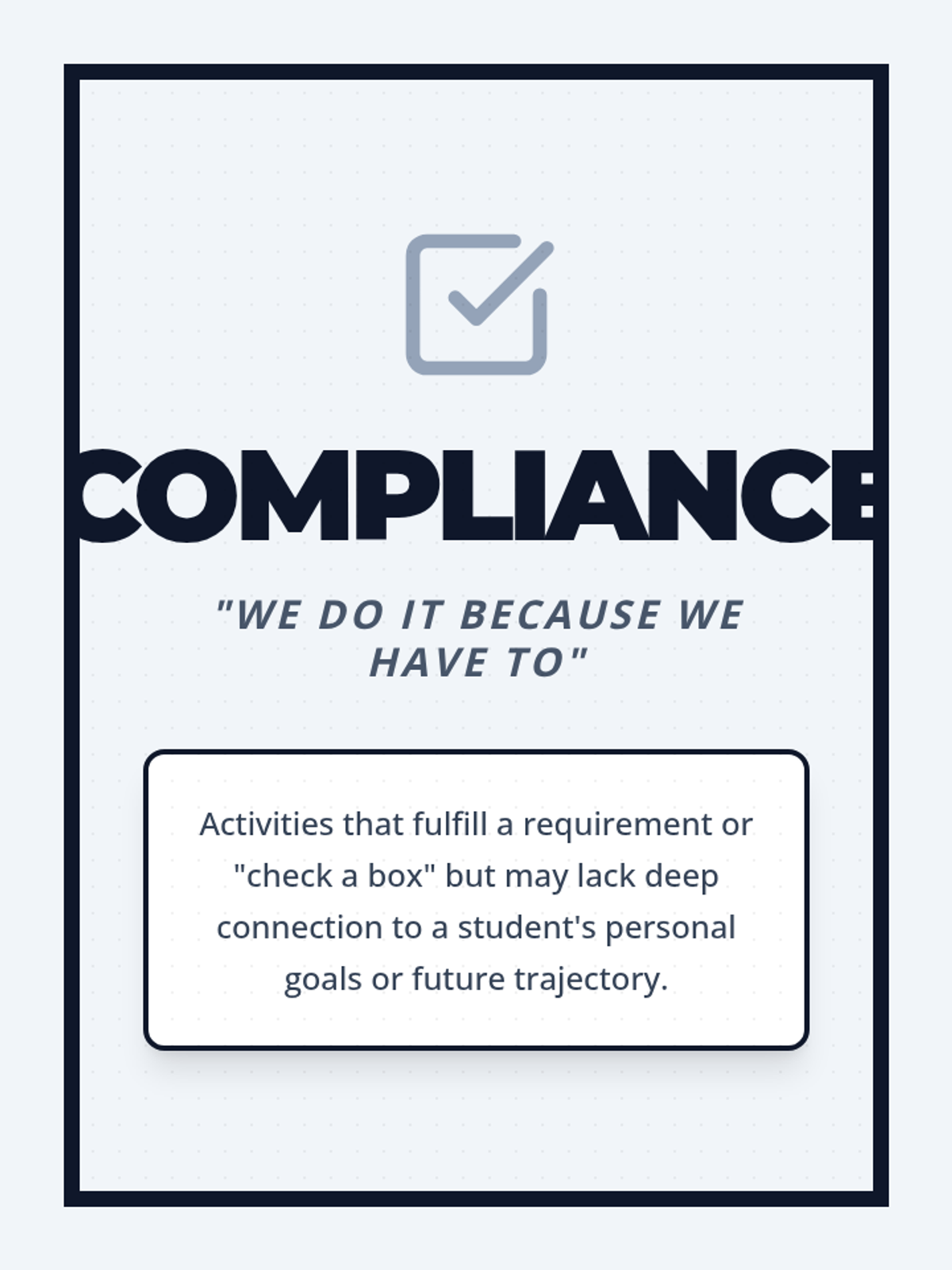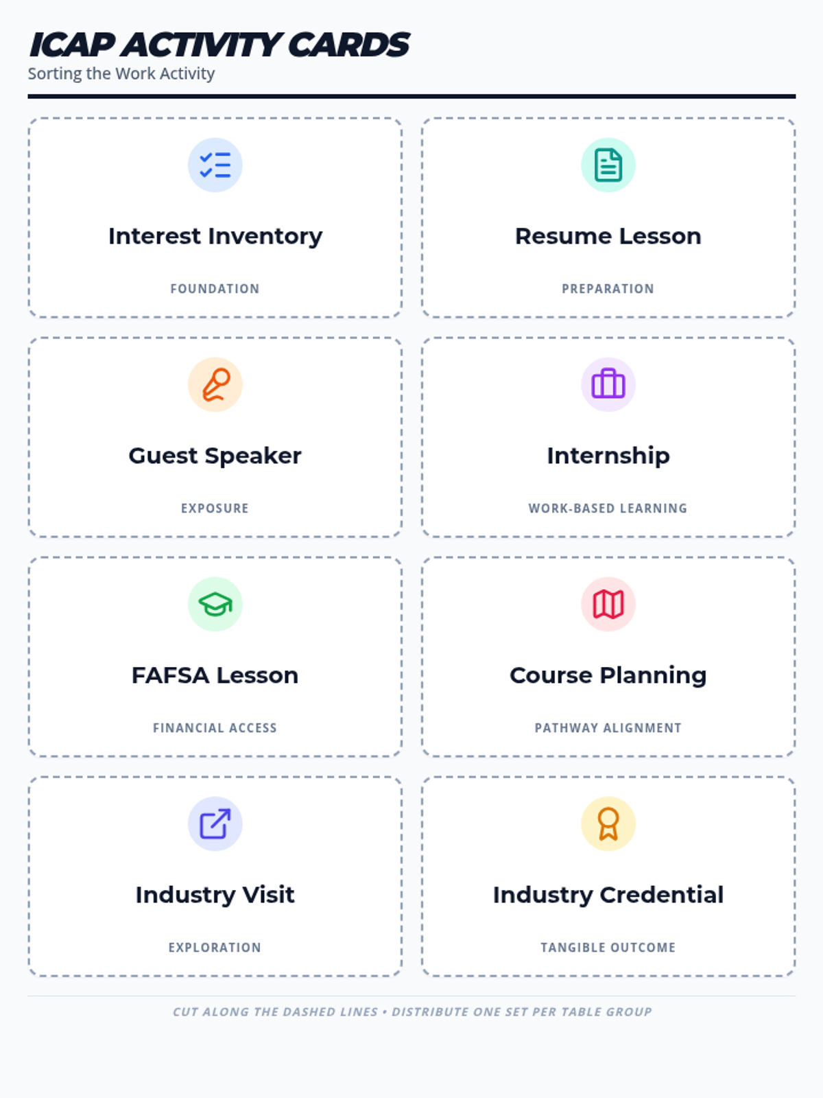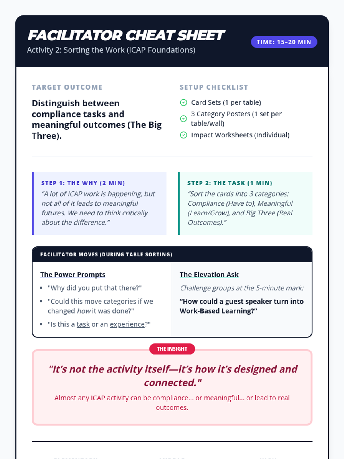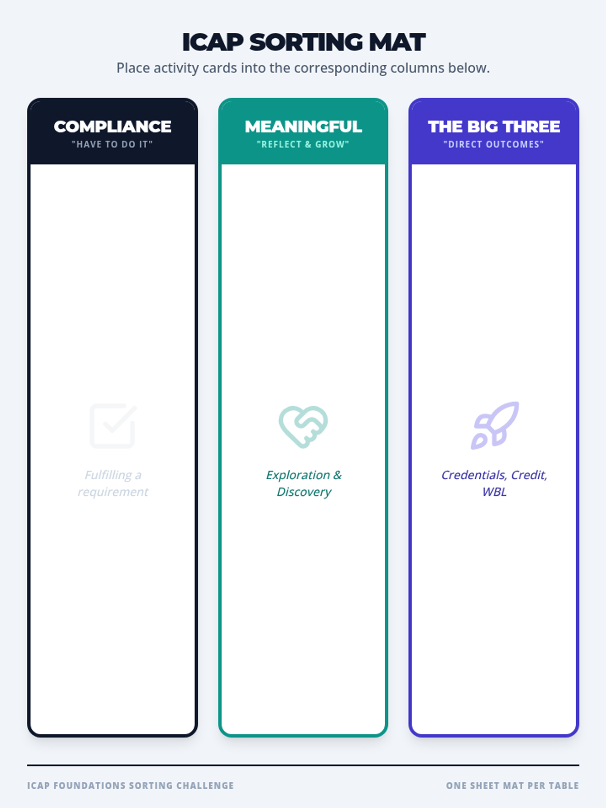 A hands-on professional development activity where participants categorize common ICAP tasks to distinguish between compliance-driven actions and high-impact outcomes that lead to student success.