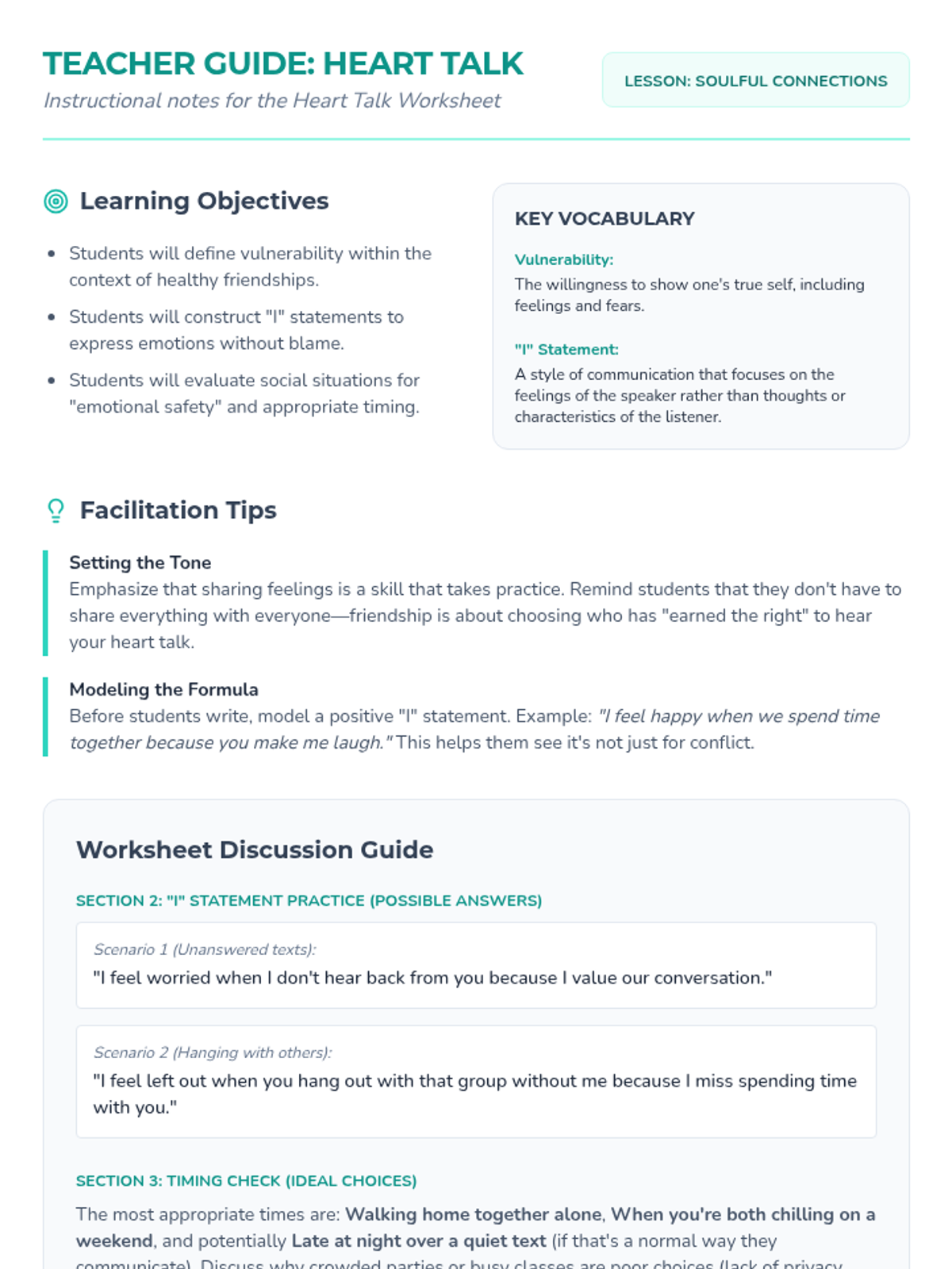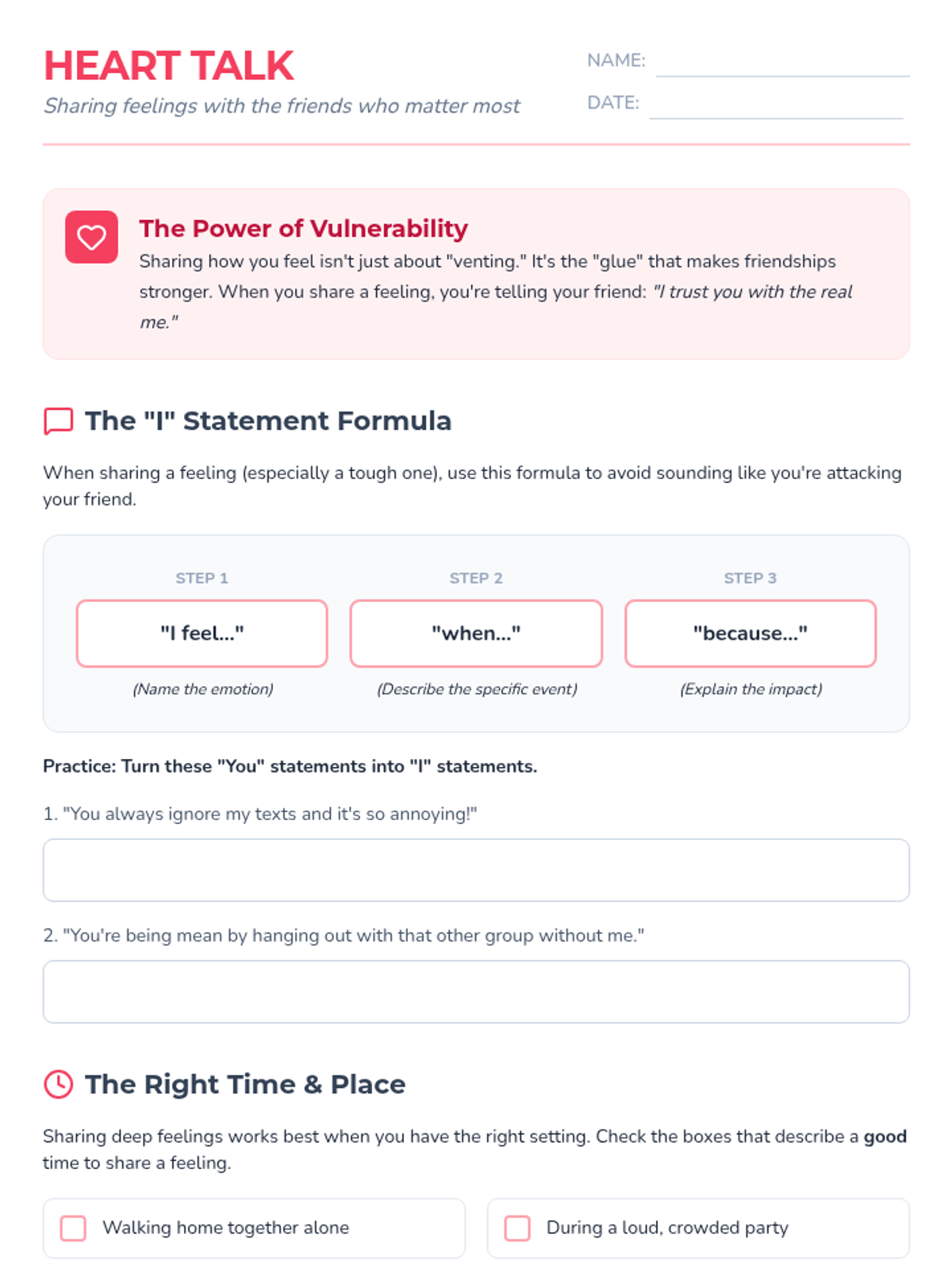 A lesson focused on developing emotional intelligence and communication skills for building deeper, more authentic friendships. Students will learn the "I" statement formula and how to identify appropriate times for sharing personal feelings.