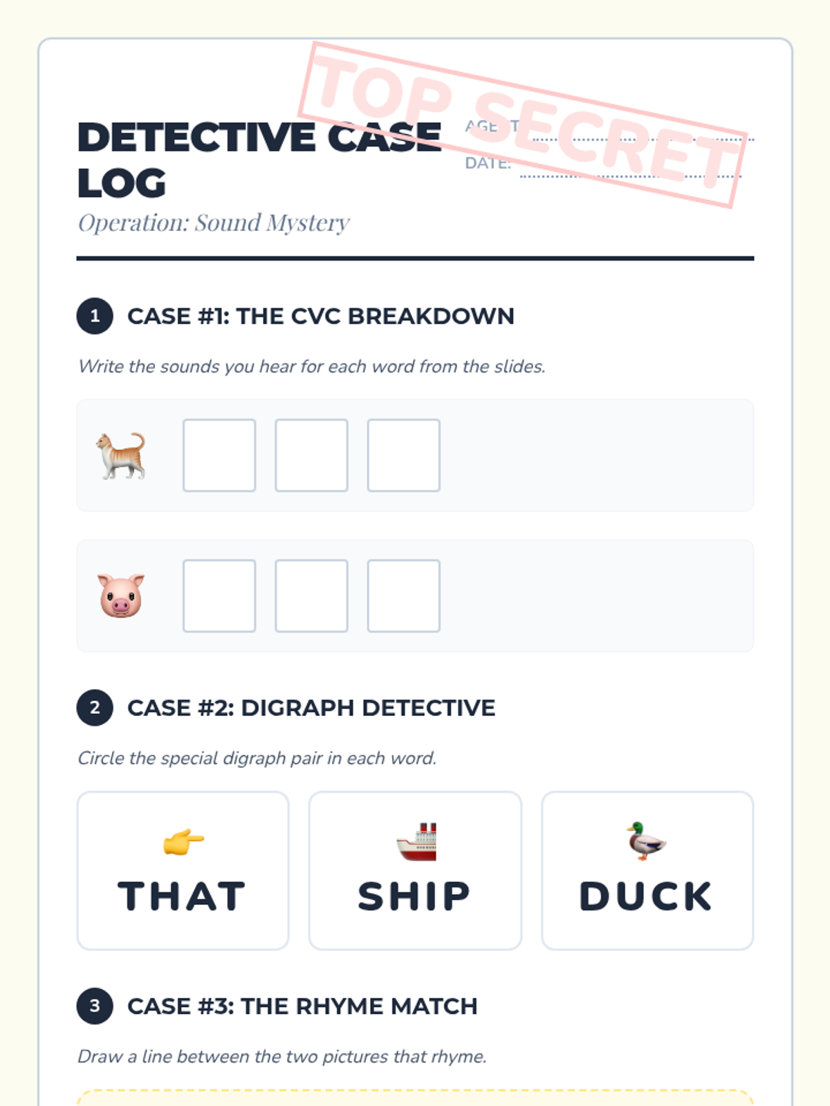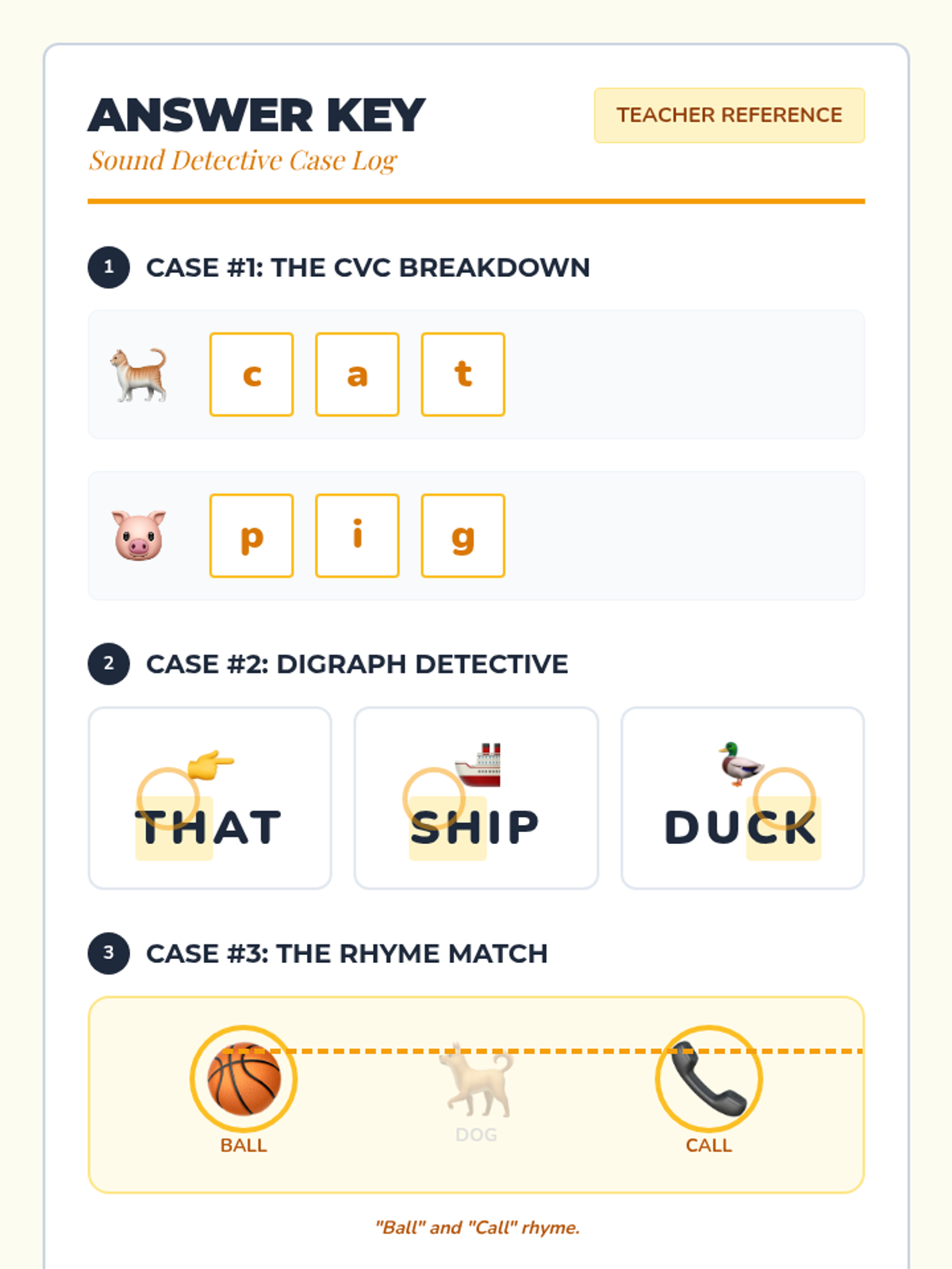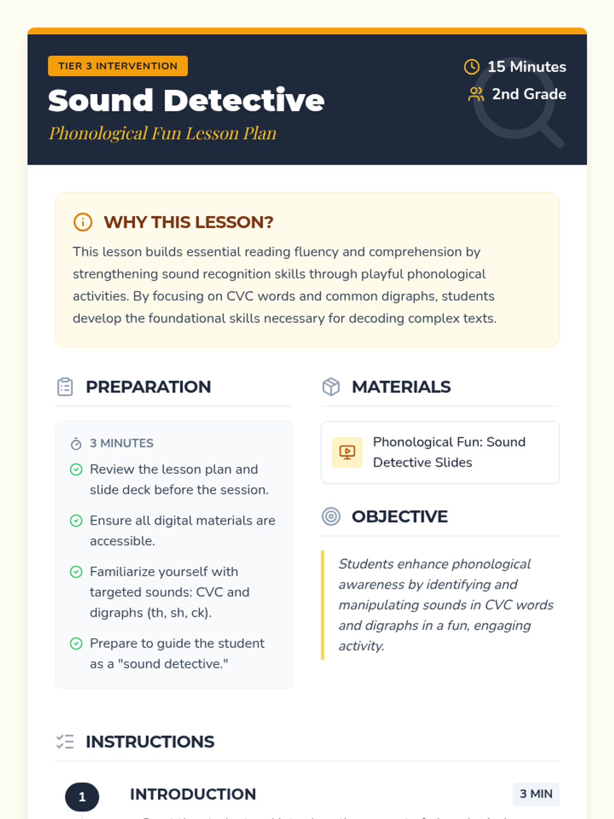 A 15-minute Tier 3 intervention lesson for 2nd graders focusing on phonological awareness through CVC words and digraphs (th, sh, ck). Students take on the role of a 'Sound Detective' to identify and manipulate sounds.