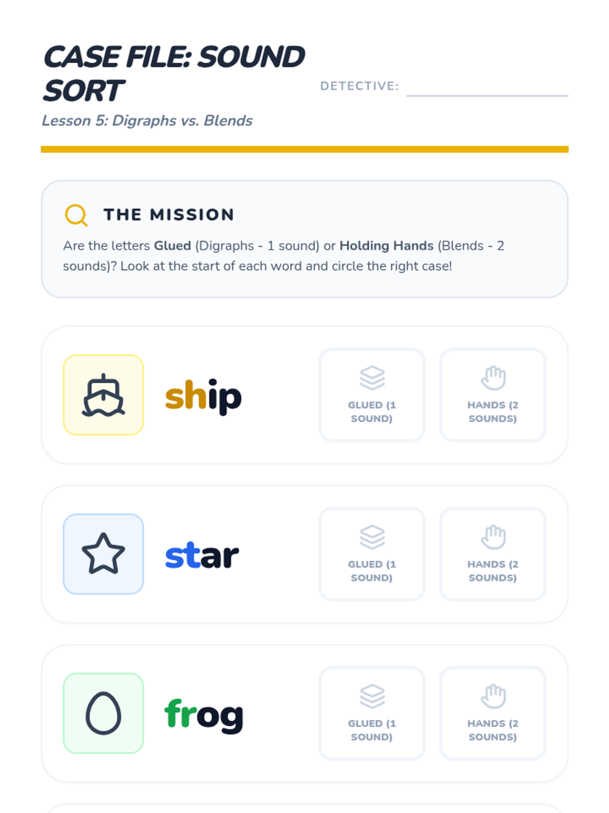 Students compare words with digraphs (one sound) and blends (two or three sounds). Through sorting and oral practice, they solidify the difference between letters that change sound versus letters that work together.