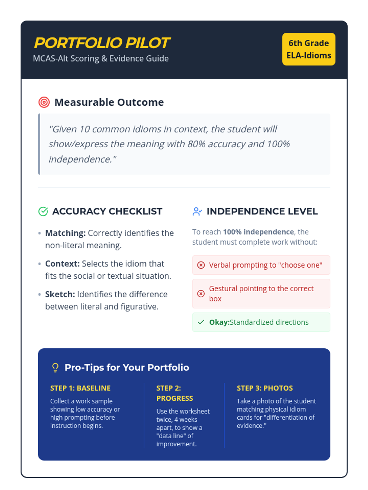 A lesson designed to help 6th-grade students participating in MCAS-Alt master common idioms through visual matching, context clues, and data tracking for independence and accuracy.