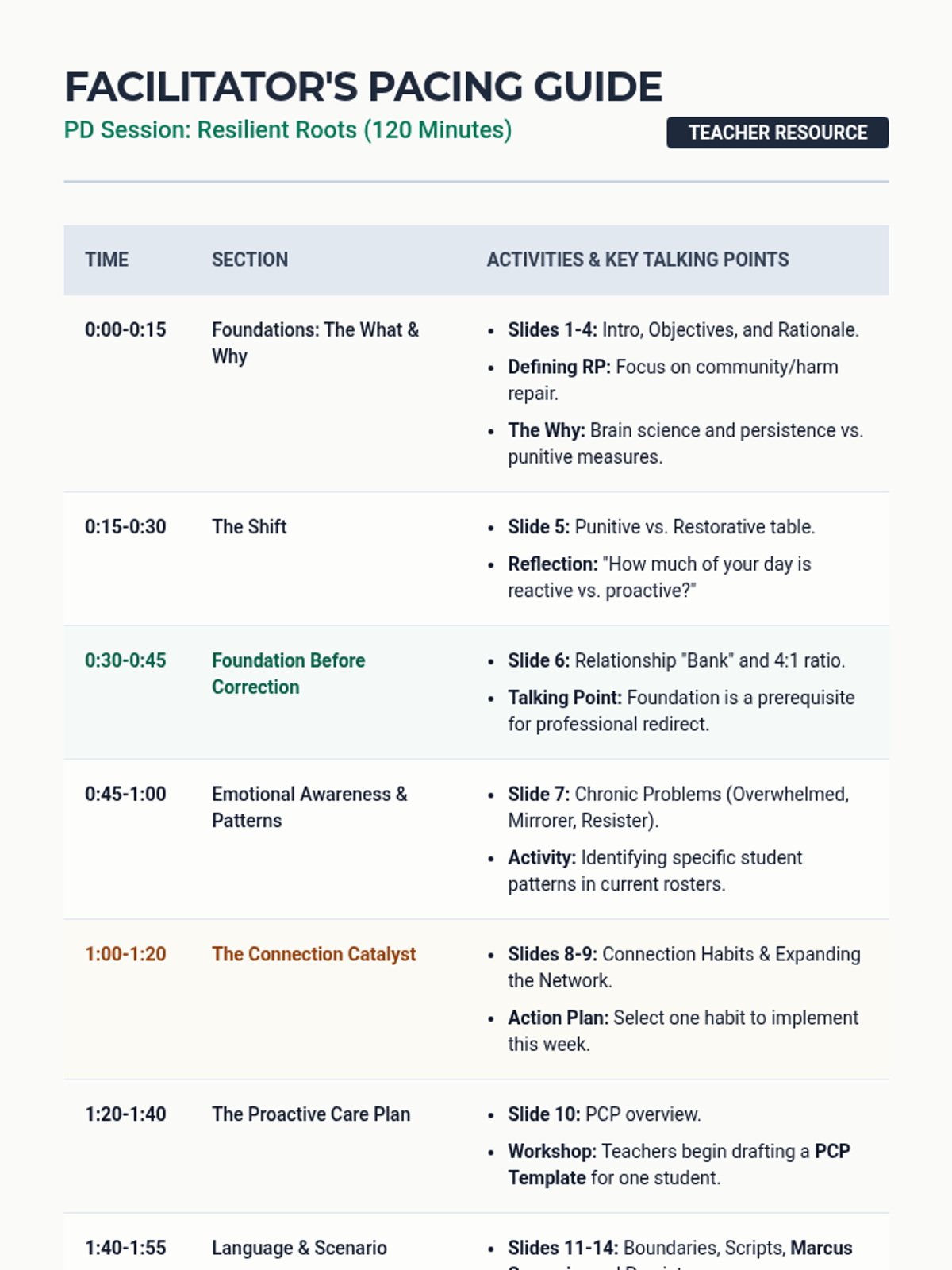 A professional development session for high school teachers focusing on restorative practices, emotional regulation, and the implementation of proactive care plans. This lesson equips educators with the tools to handle chronic emotional challenges and foster deep connection with students in grades 9-12.