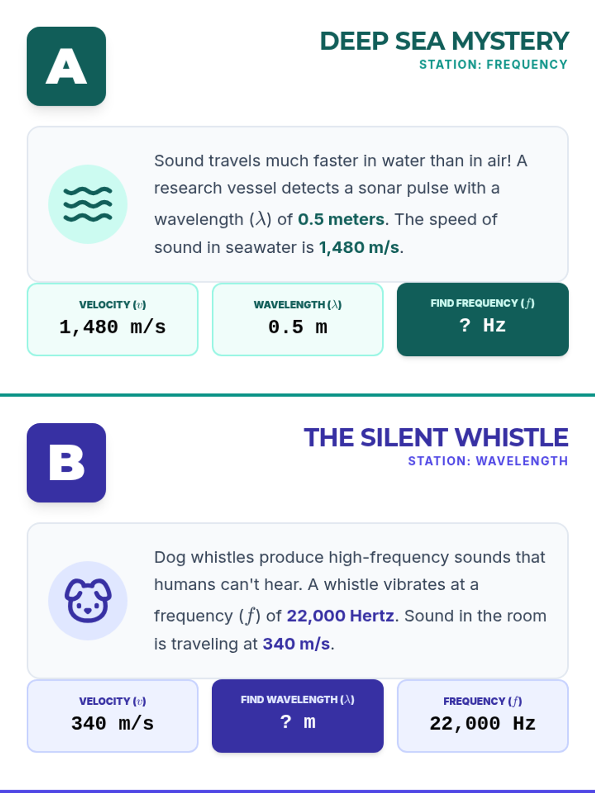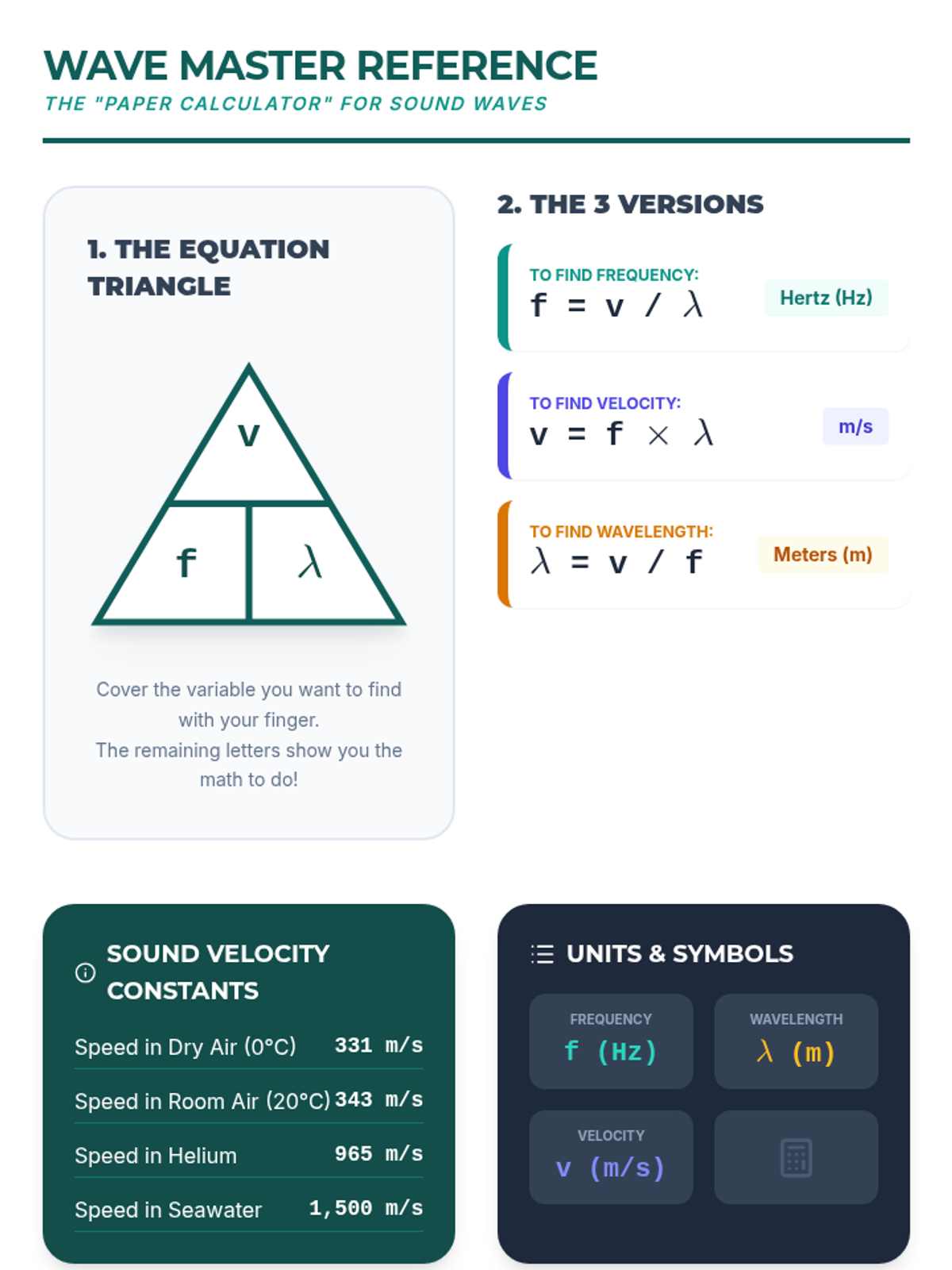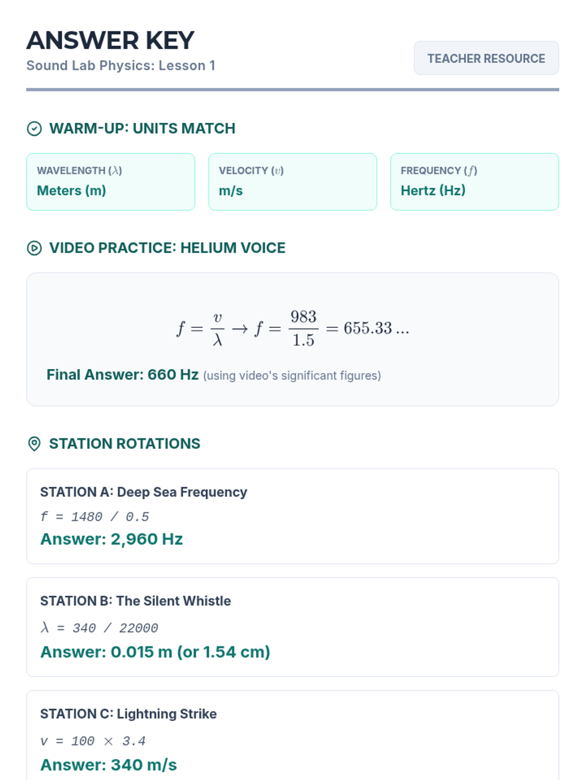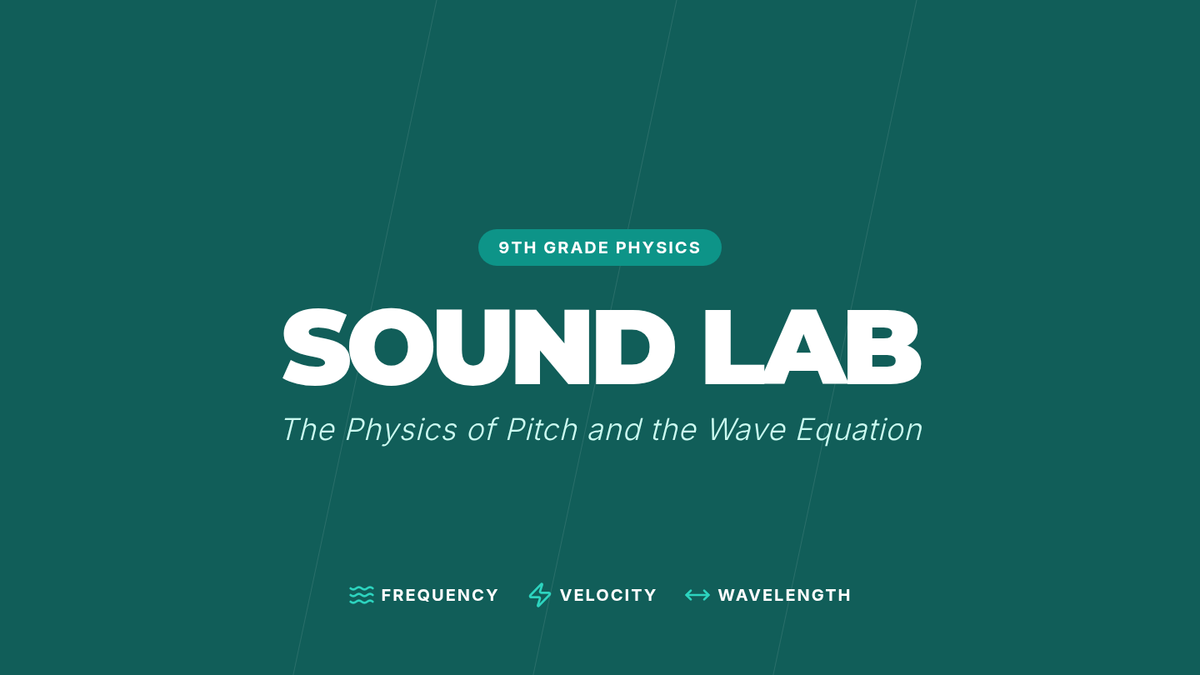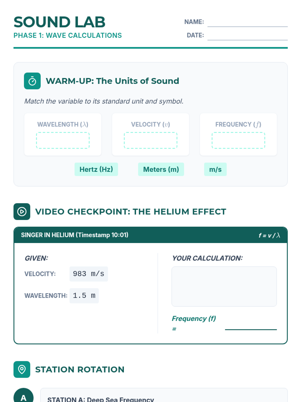 A 9th-grade physics lesson focusing on the wave equation f = v / λ. Students explore the relationship between frequency, velocity, and wavelength through a video analysis of 'helium voice' and hands-on station calculations involving sound in different media.