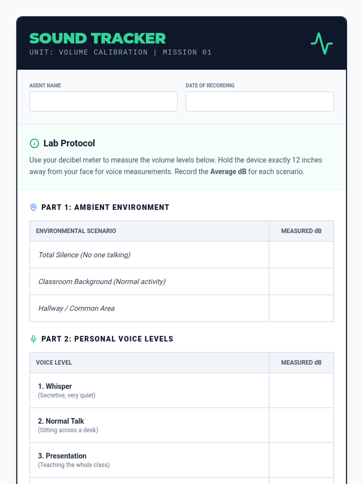 Students use decibel meters to measure ambient sounds and their own voices at various levels. They create a visual chart correlating decibel ranges with social descriptions.