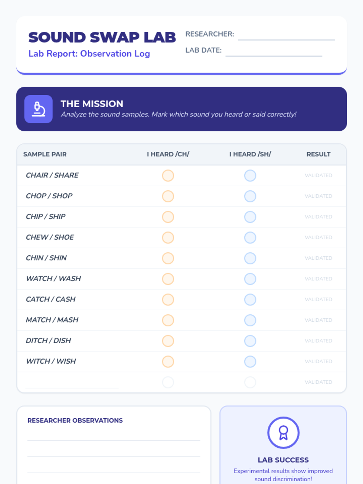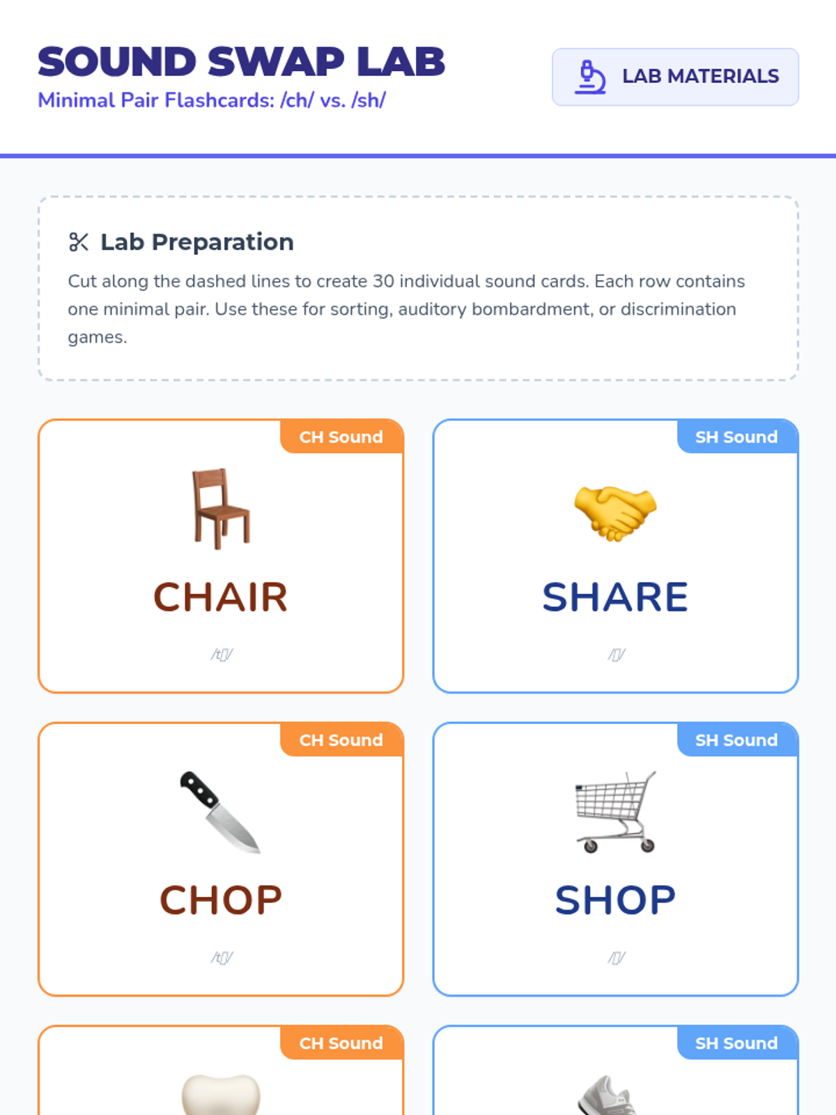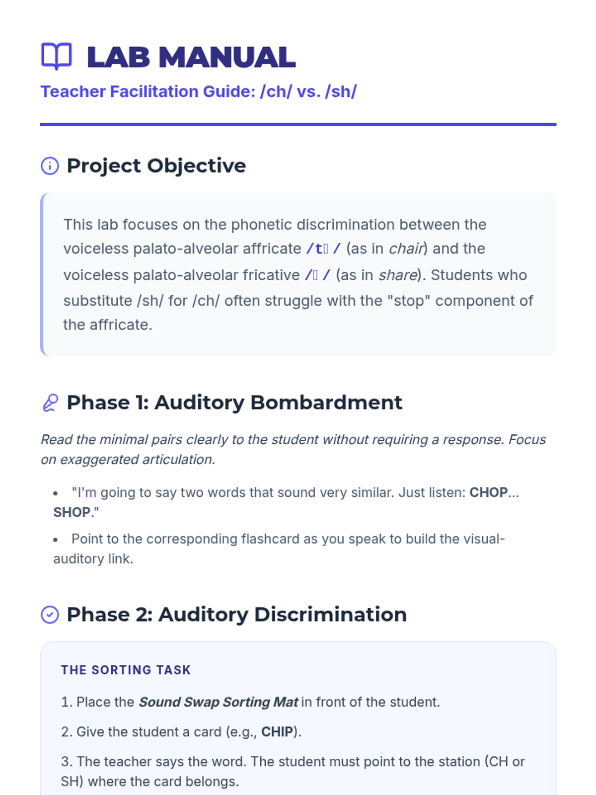 A focused lesson on discriminating between the 'ch' /tʃ/ and 'sh' /ʃ/ sounds using minimal pairs to help students overcome substitution errors.