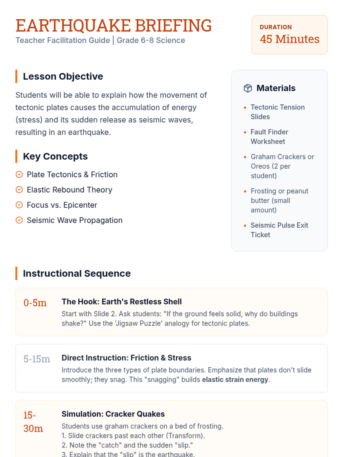 A comprehensive 45-minute lesson exploring the mechanics of earthquakes, tectonic plate movements, and the build-up of seismic energy. Students engage in a hands-on simulation to visualize how stress and friction lead to sudden crustal shifts.