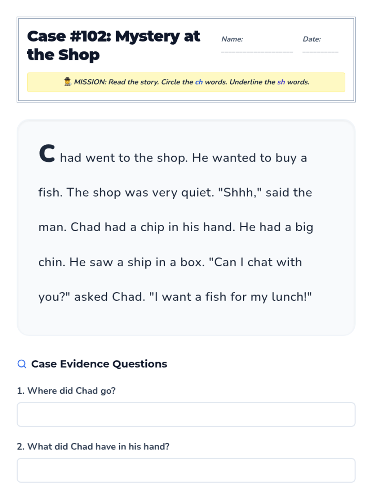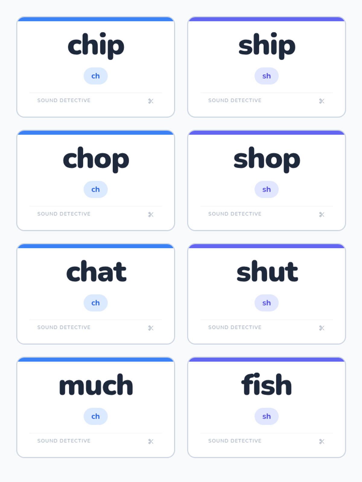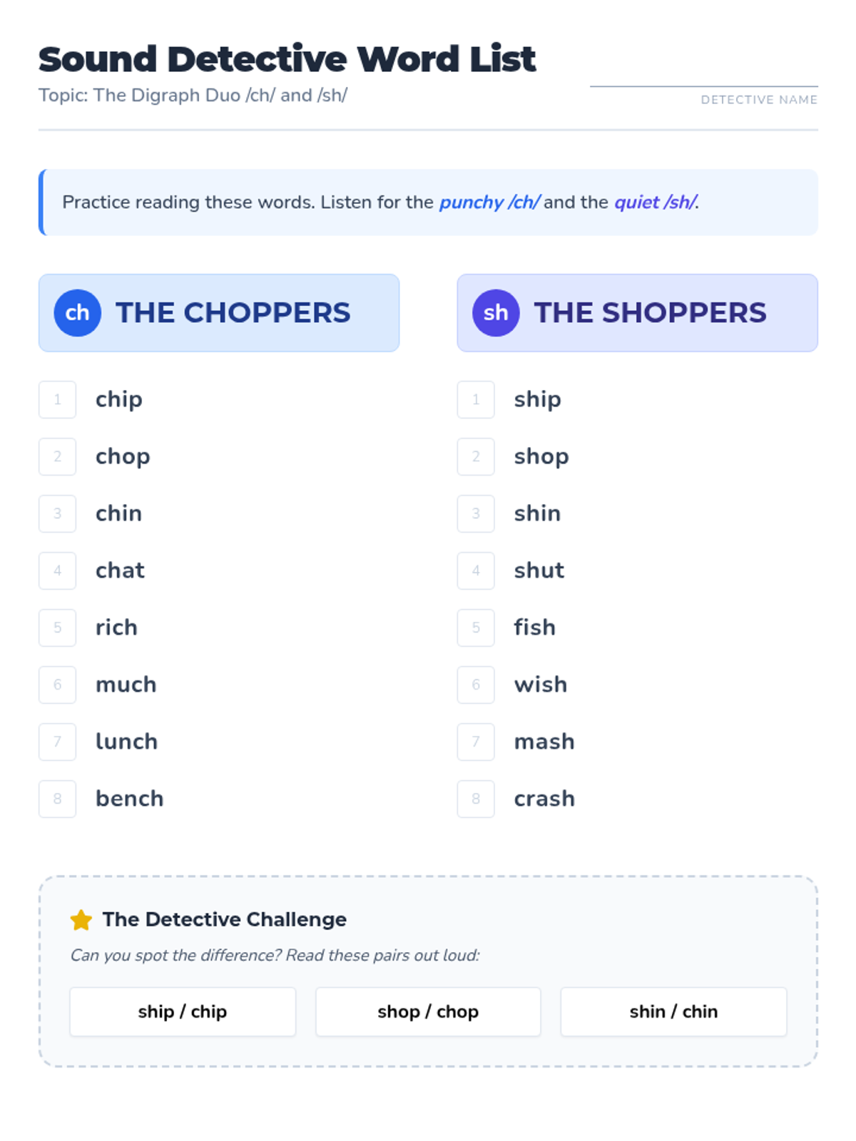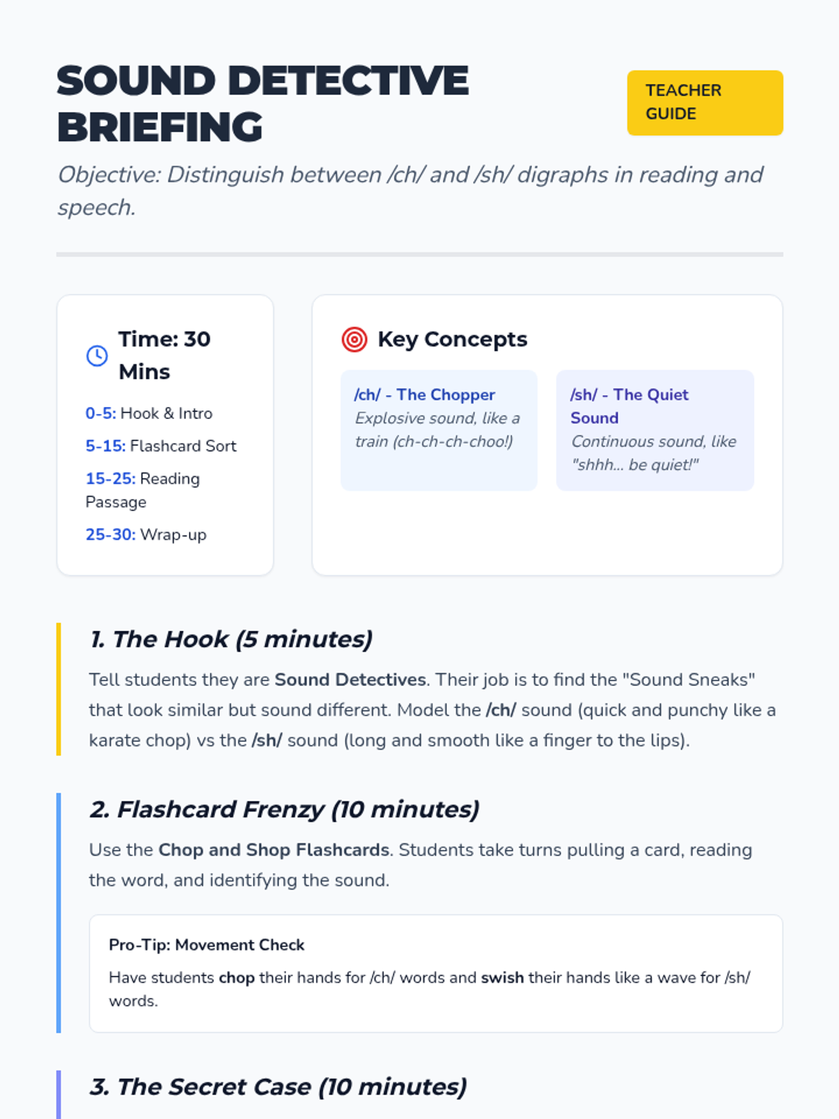 A 30-minute phonics focused lesson helping 1st graders distinguish between the /ch/ and /sh/ digraphs through sorting and reading.