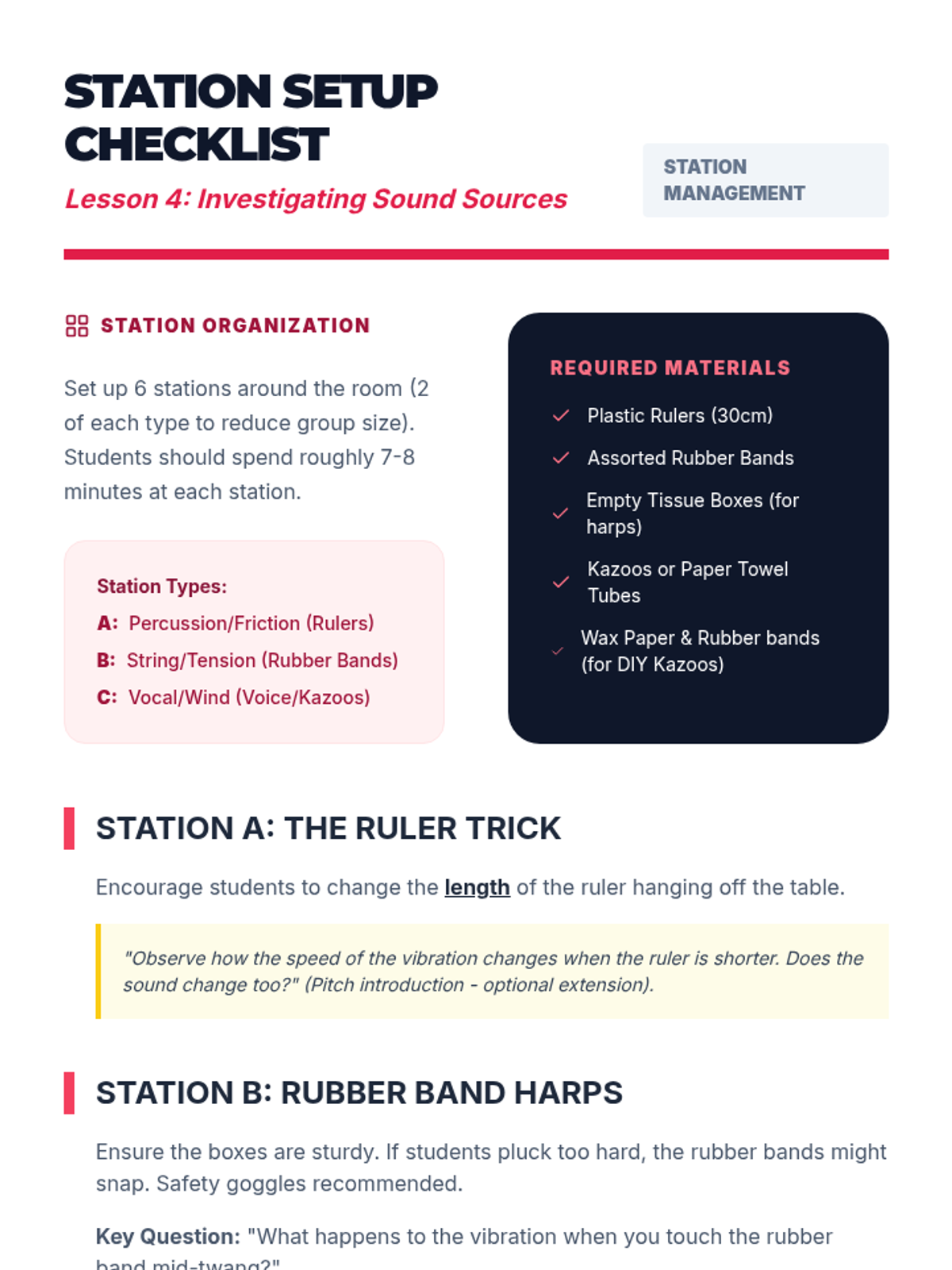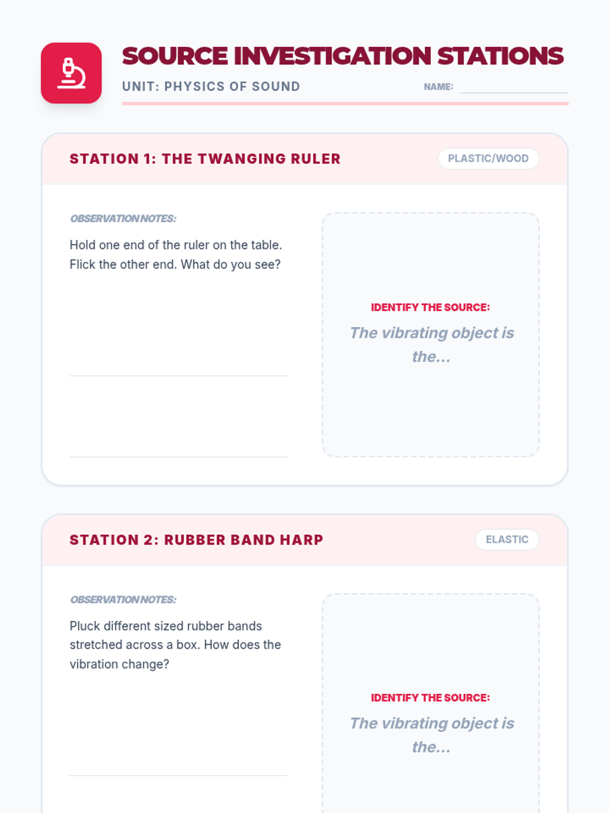 Students rotate through stations to identify the specific vibrating source in various instruments and everyday sounds.