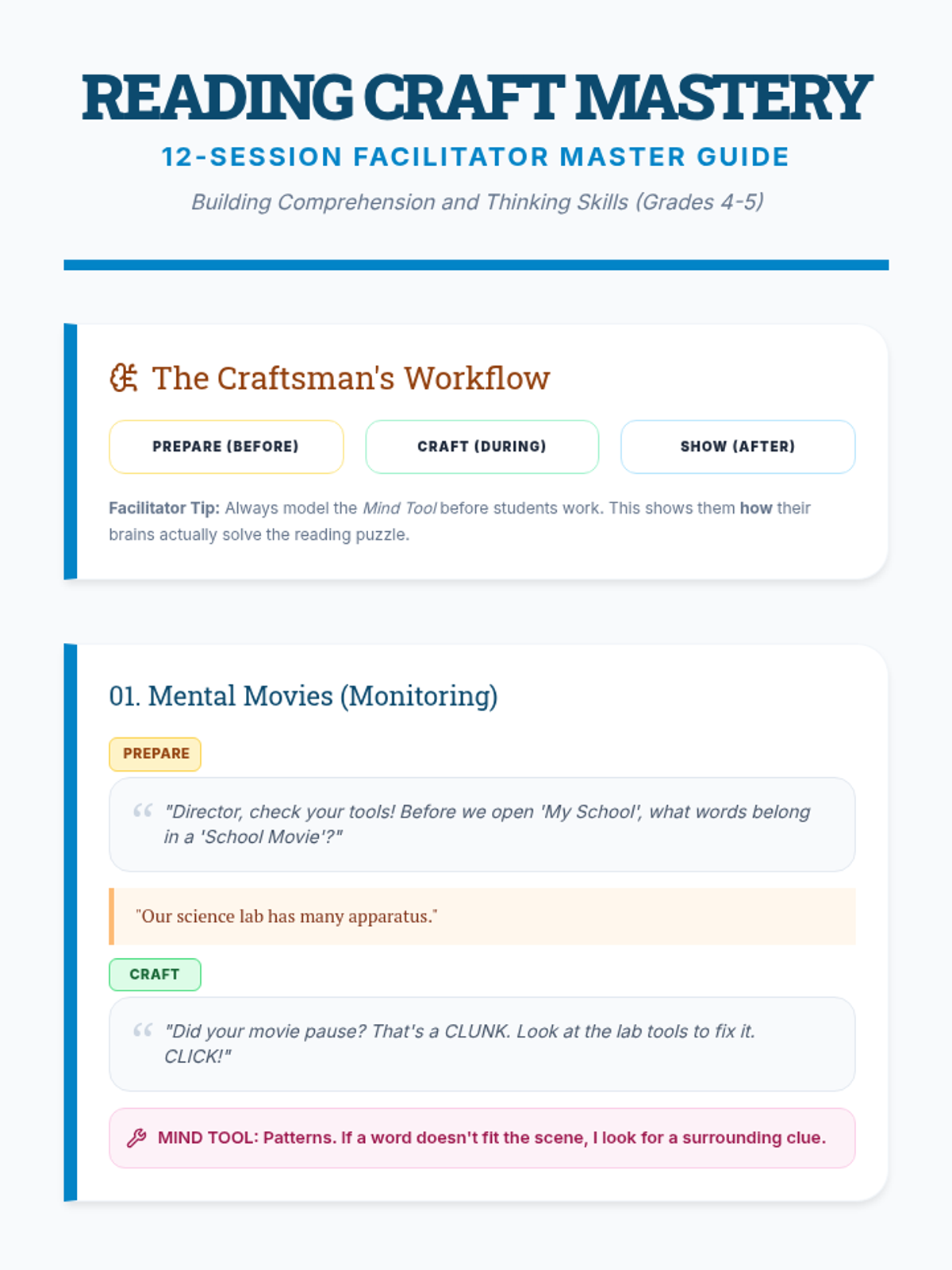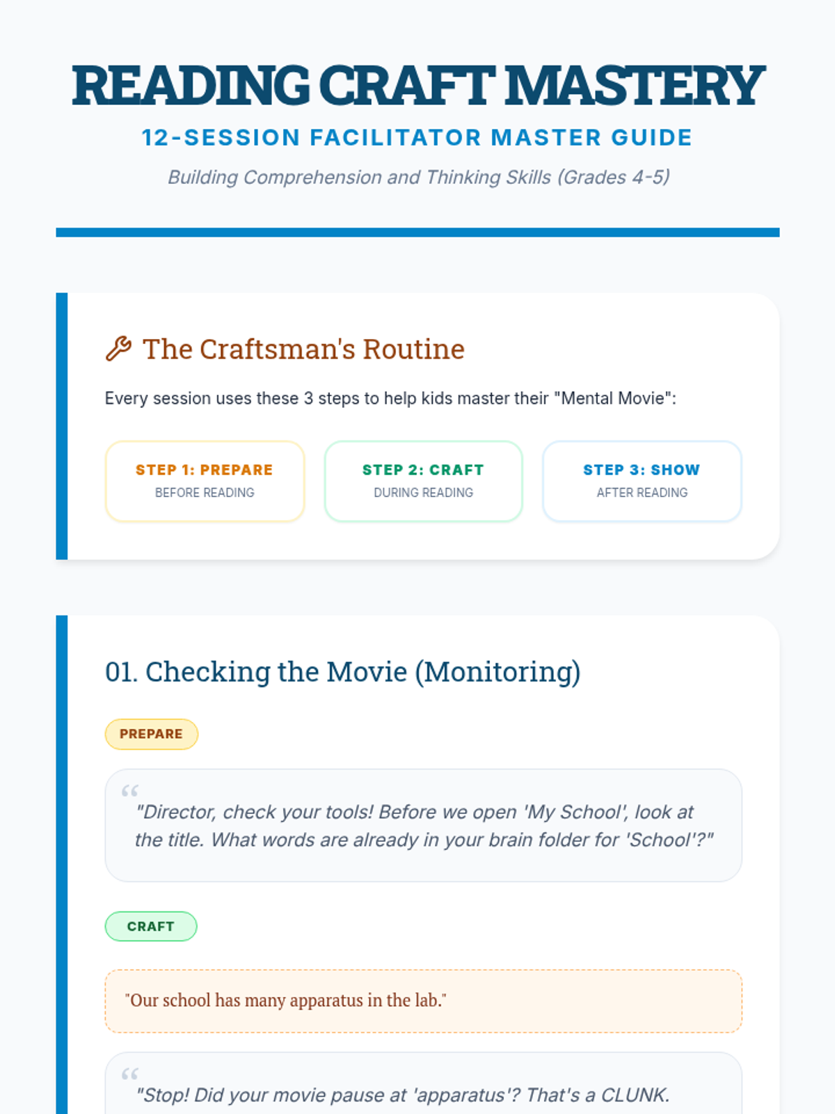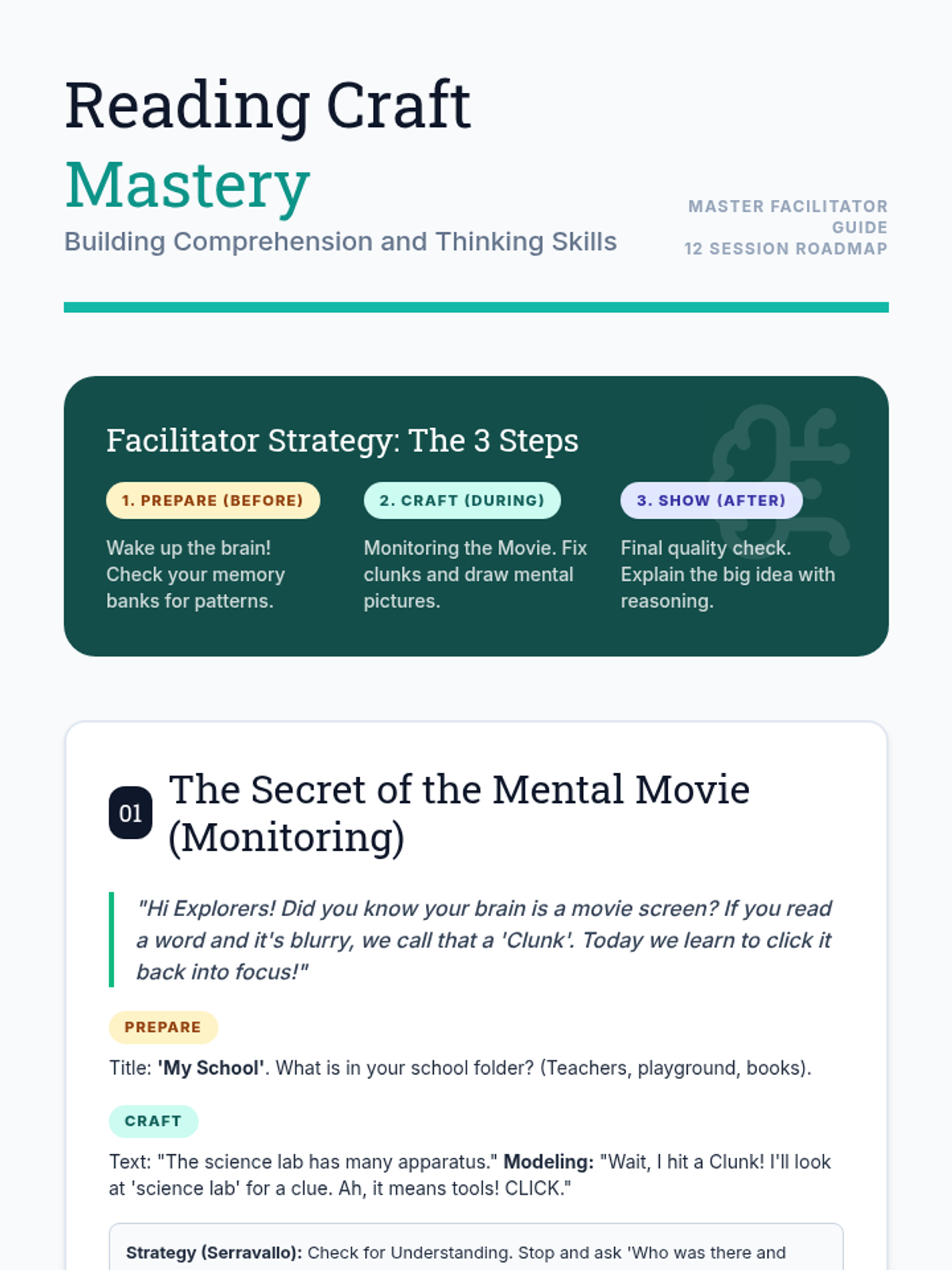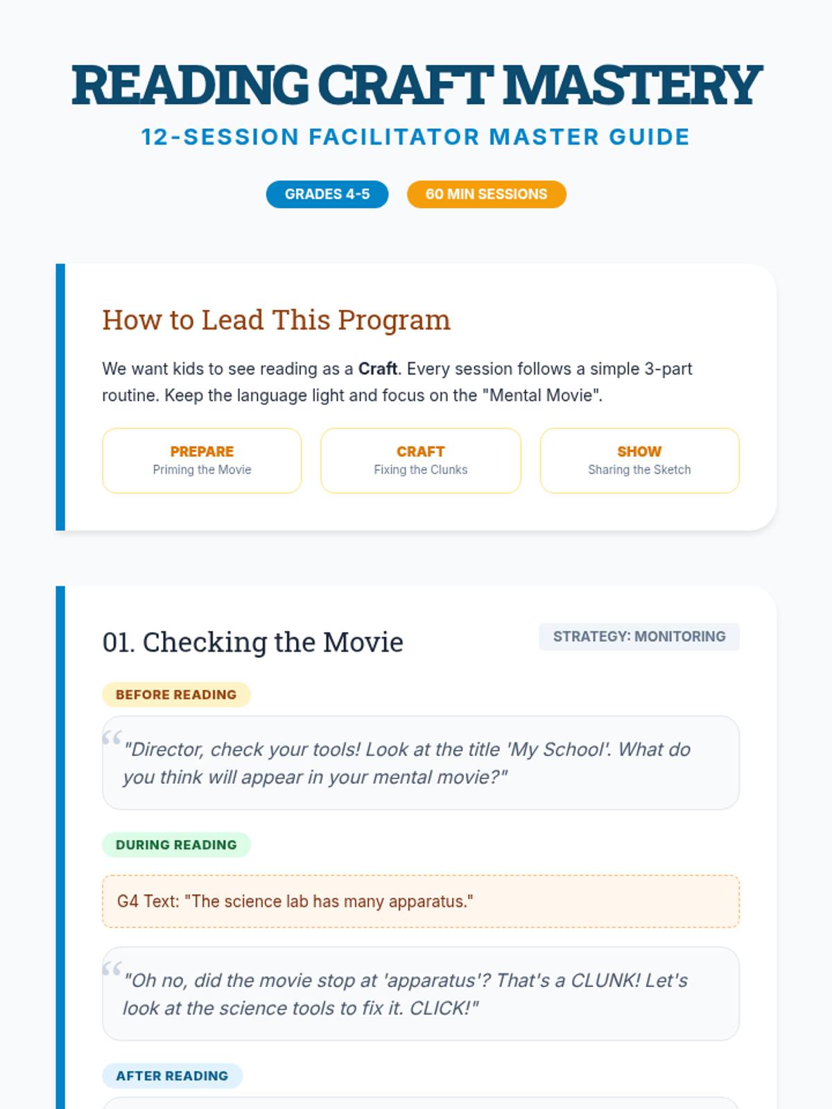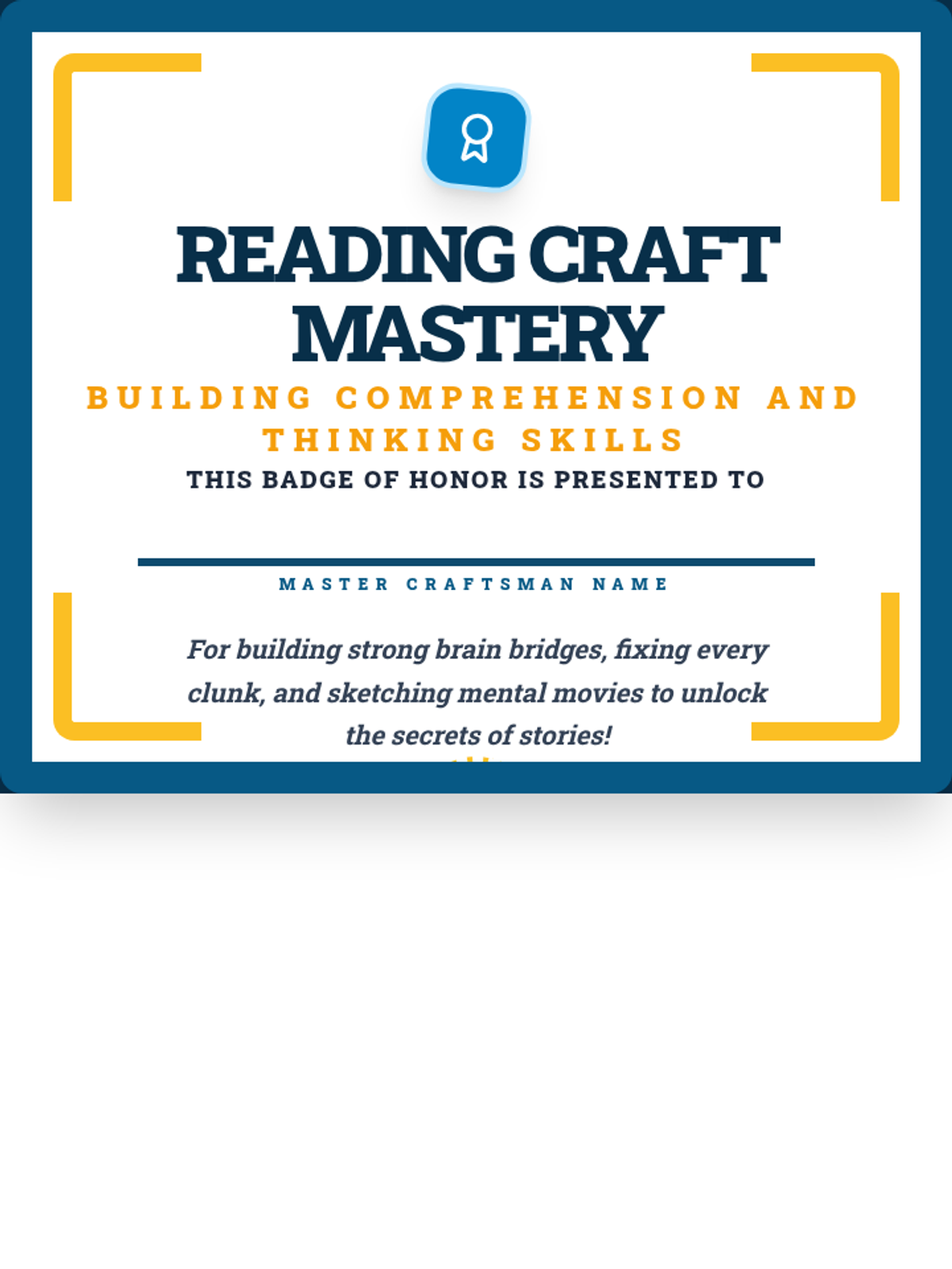 Introduction to the 'Reading Craft Mastery' mindset. Focuses on 'Monitoring for Meaning' by teaching kids to check if their 'mental movie' is clear or blurry using Click and Clunk logic.