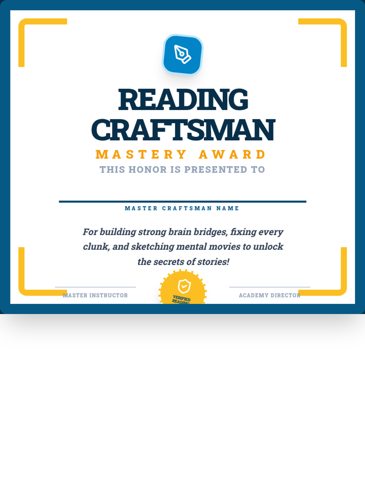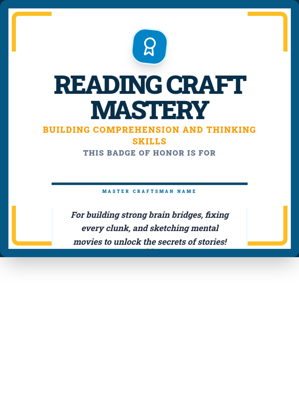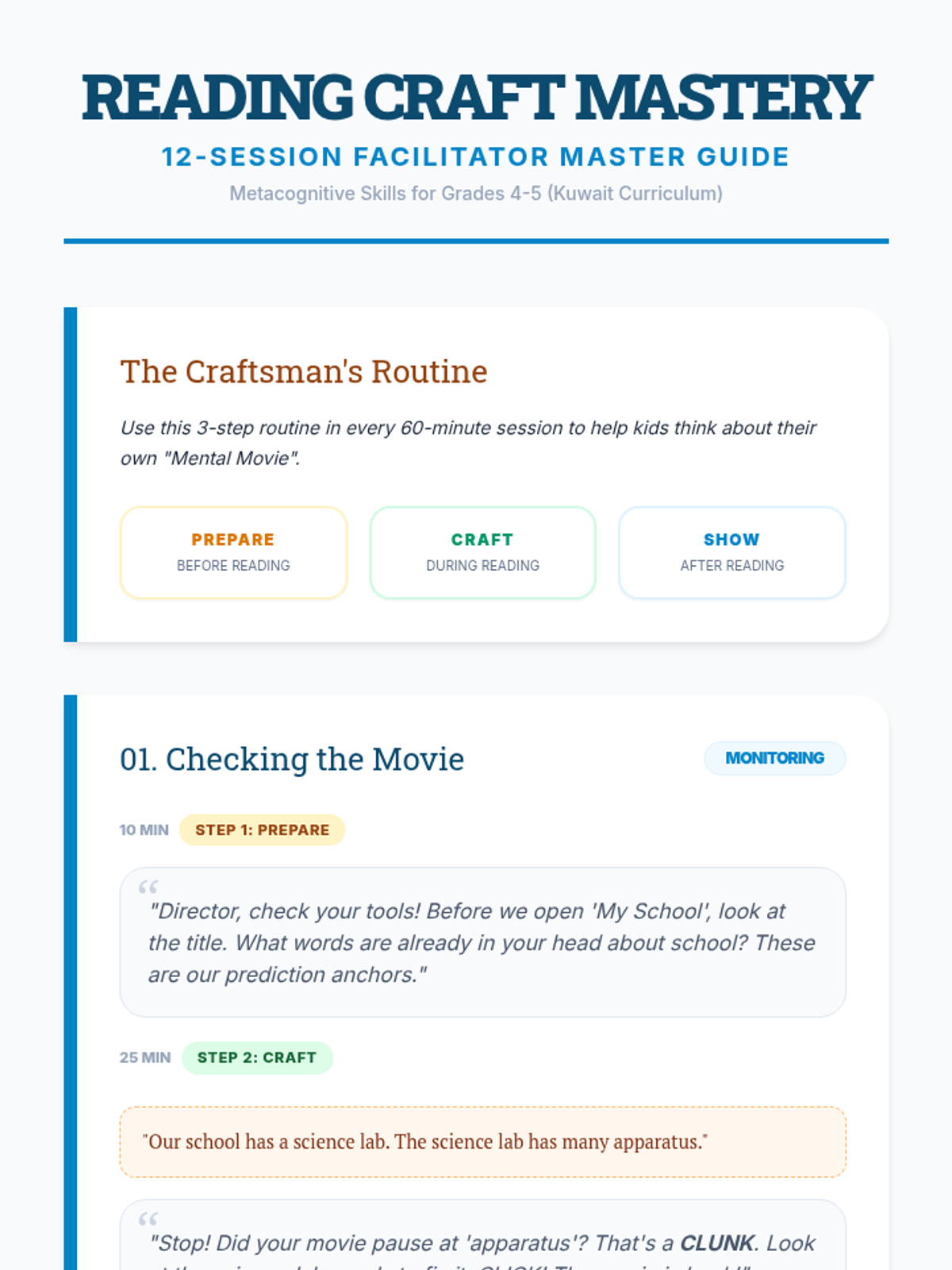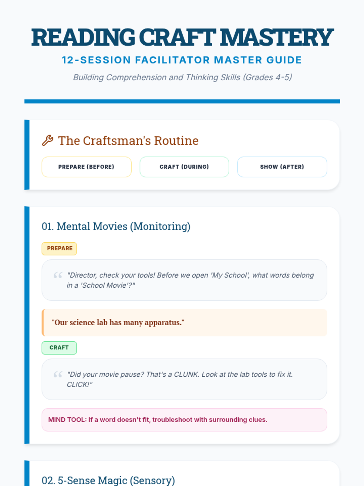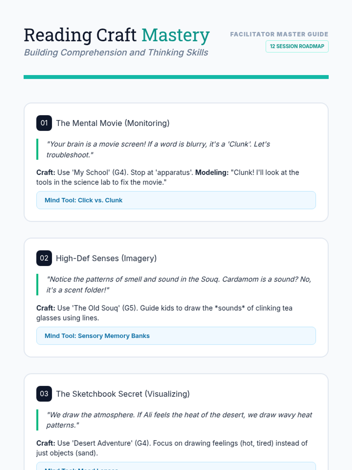 Introduction to the 'Reading Craft Mastery' mindset. Focuses on 'Monitoring for Meaning' by teaching kids to check if their 'mental movie' is clear or blurry using Click and Clunk logic.