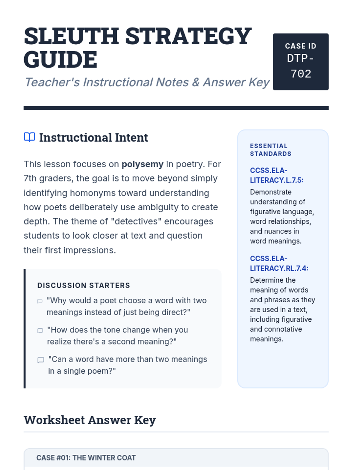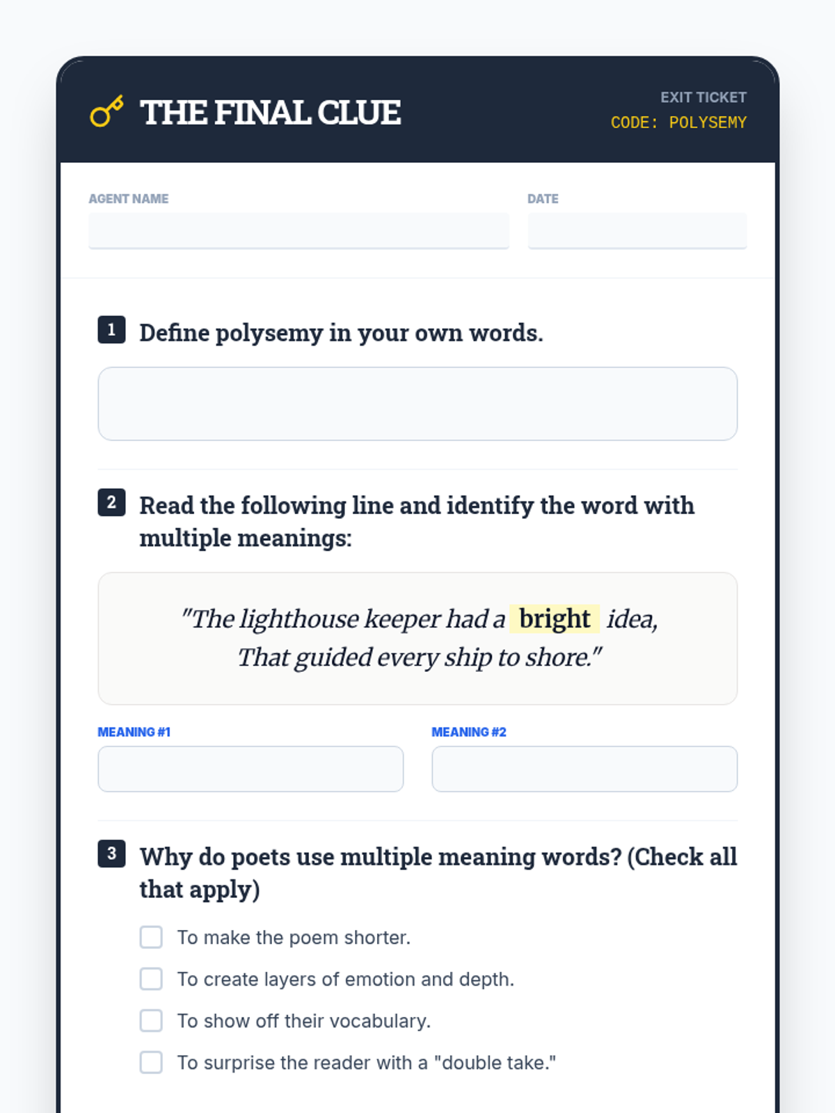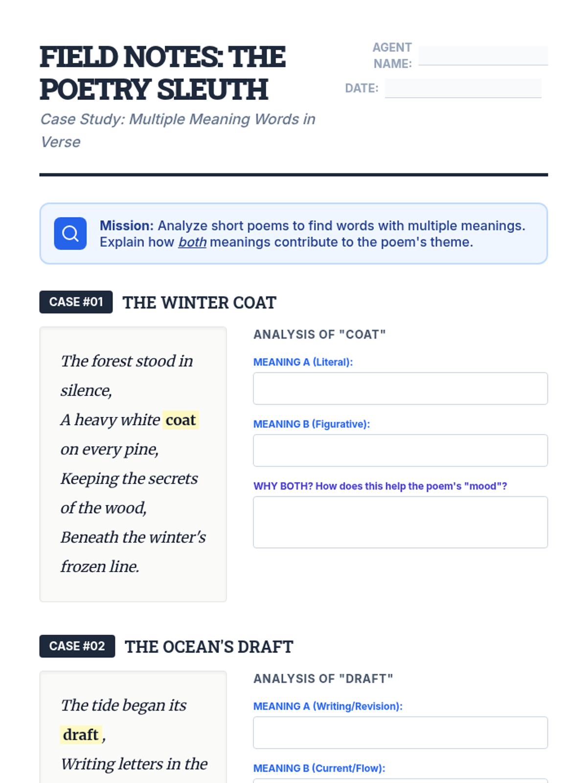 This lesson explores how poets use words with multiple meanings (polysemy) to create depth, irony, and ambiguity in their writing. Students will act as 'poetry sleuths' to uncover hidden layers in various verses.