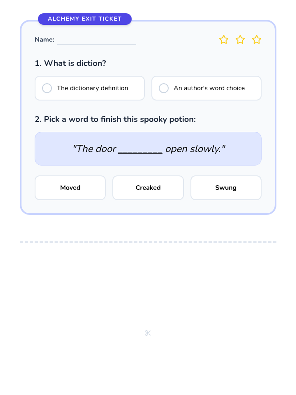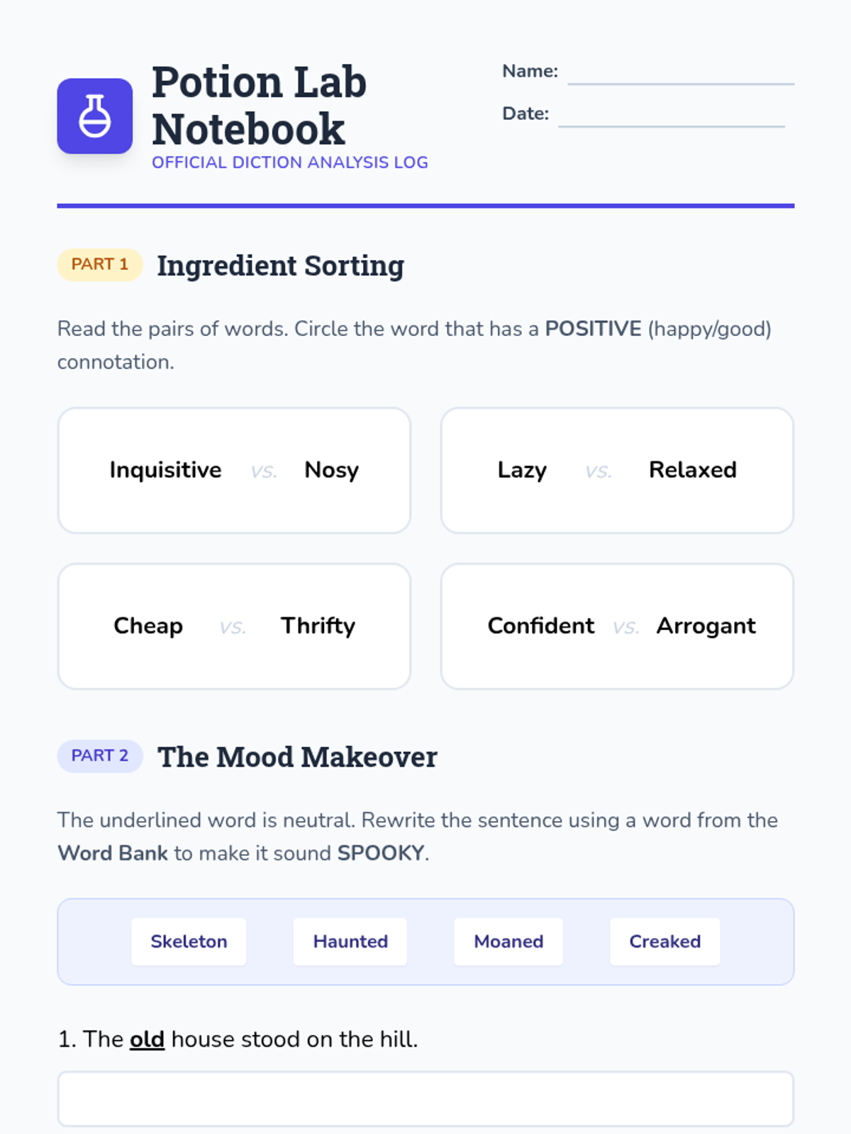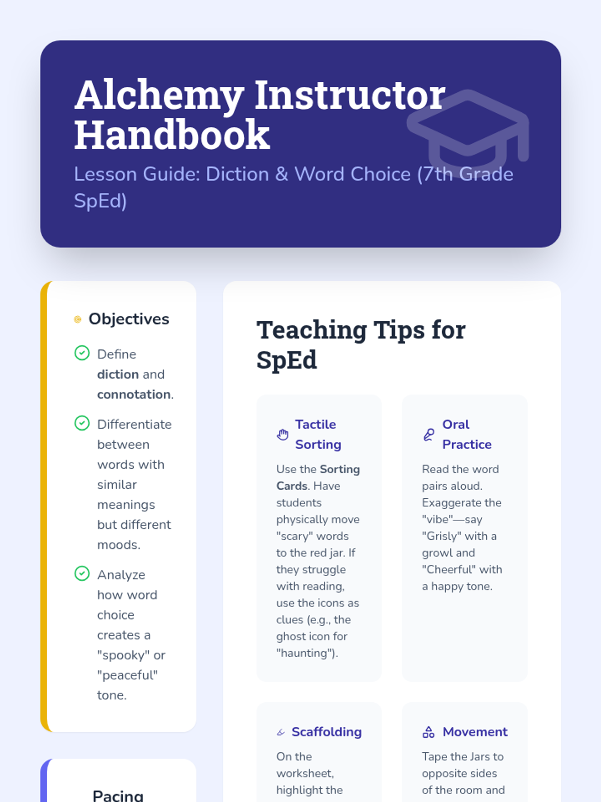 An engaging 40-minute lesson on diction analysis for 7th grade students, focusing on how word choice creates tone and mood using a 'Word Alchemy' theme.