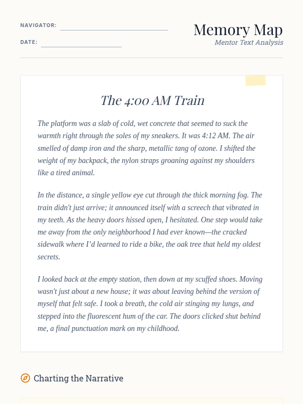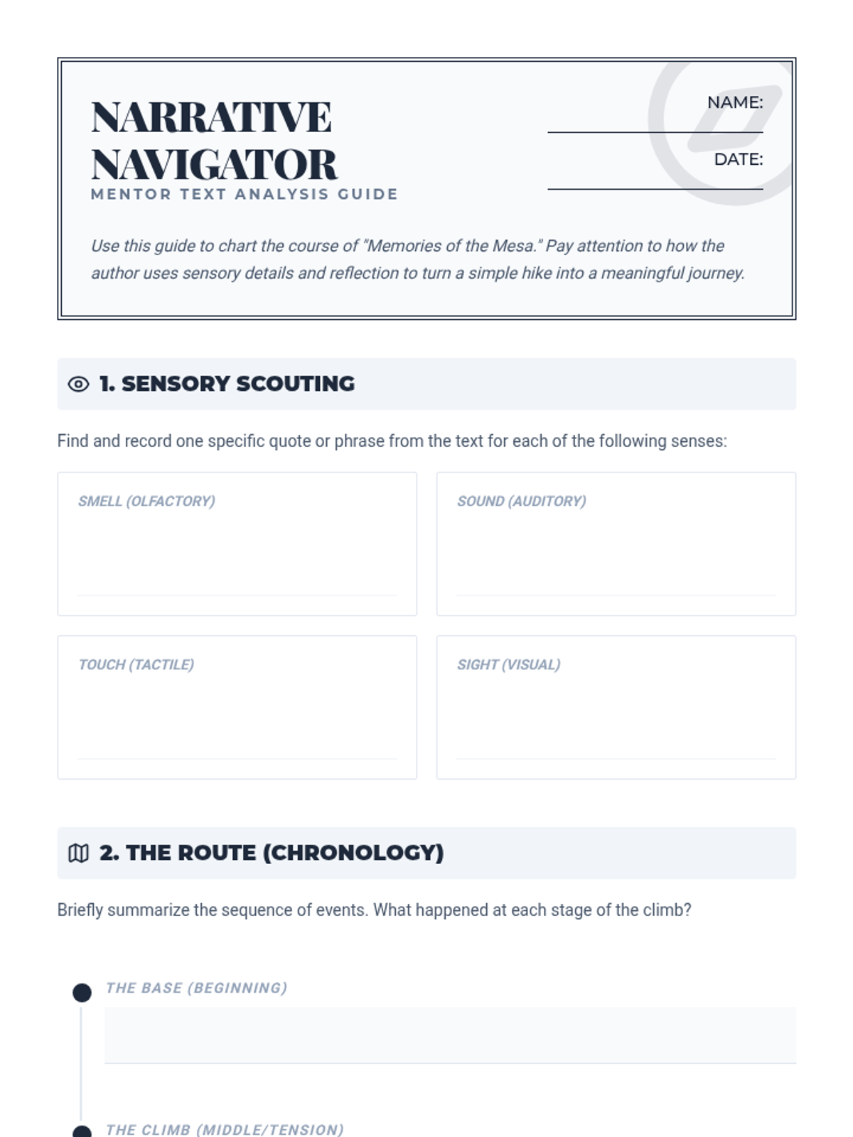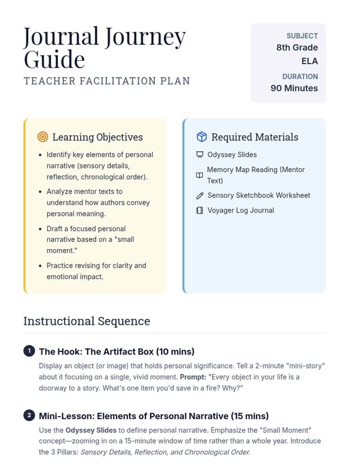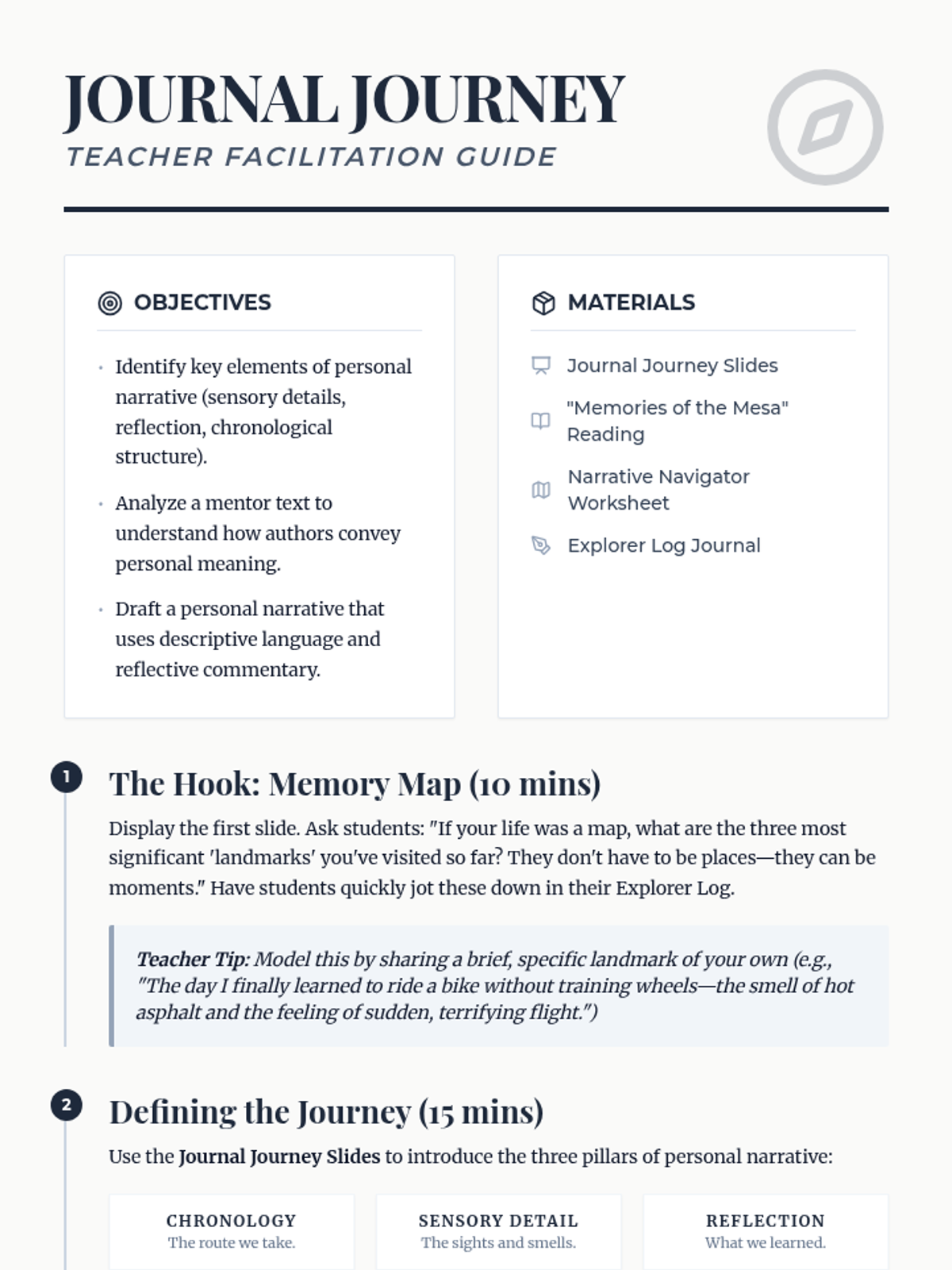 A comprehensive ELA lesson for 8th graders focusing on the craft of personal narrative. Students explore mentor texts, develop sensory writing skills, and draft reflective stories through a vintage explorer-themed 'Journal Journey.'
