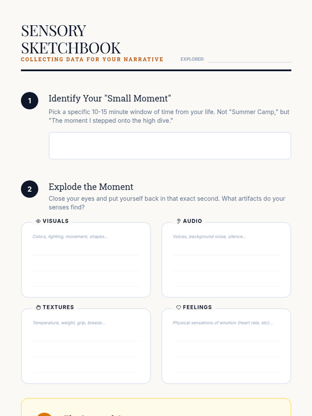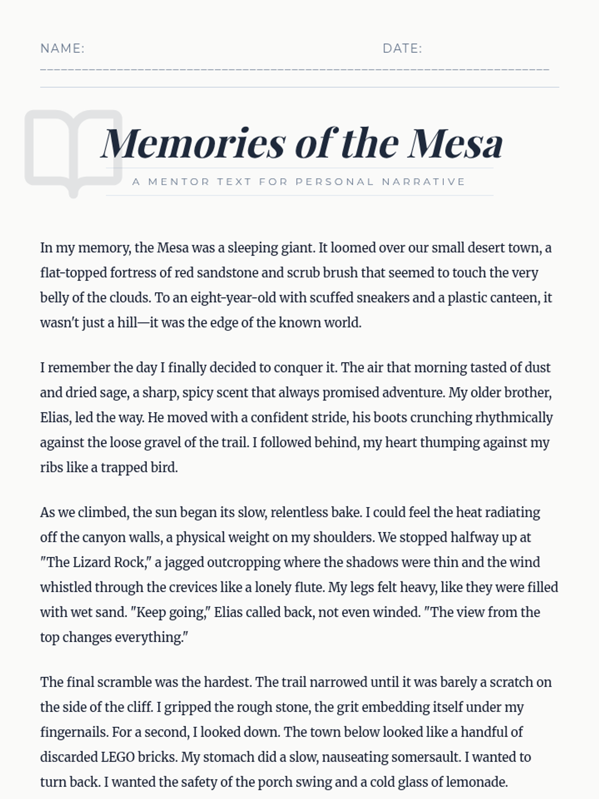 An 8th-grade ELA lesson on personal narratives, focusing on sensory details, reflection, and chronological order through mentor texts and guided drafting. Students will learn to turn personal memories into impactful stories.
