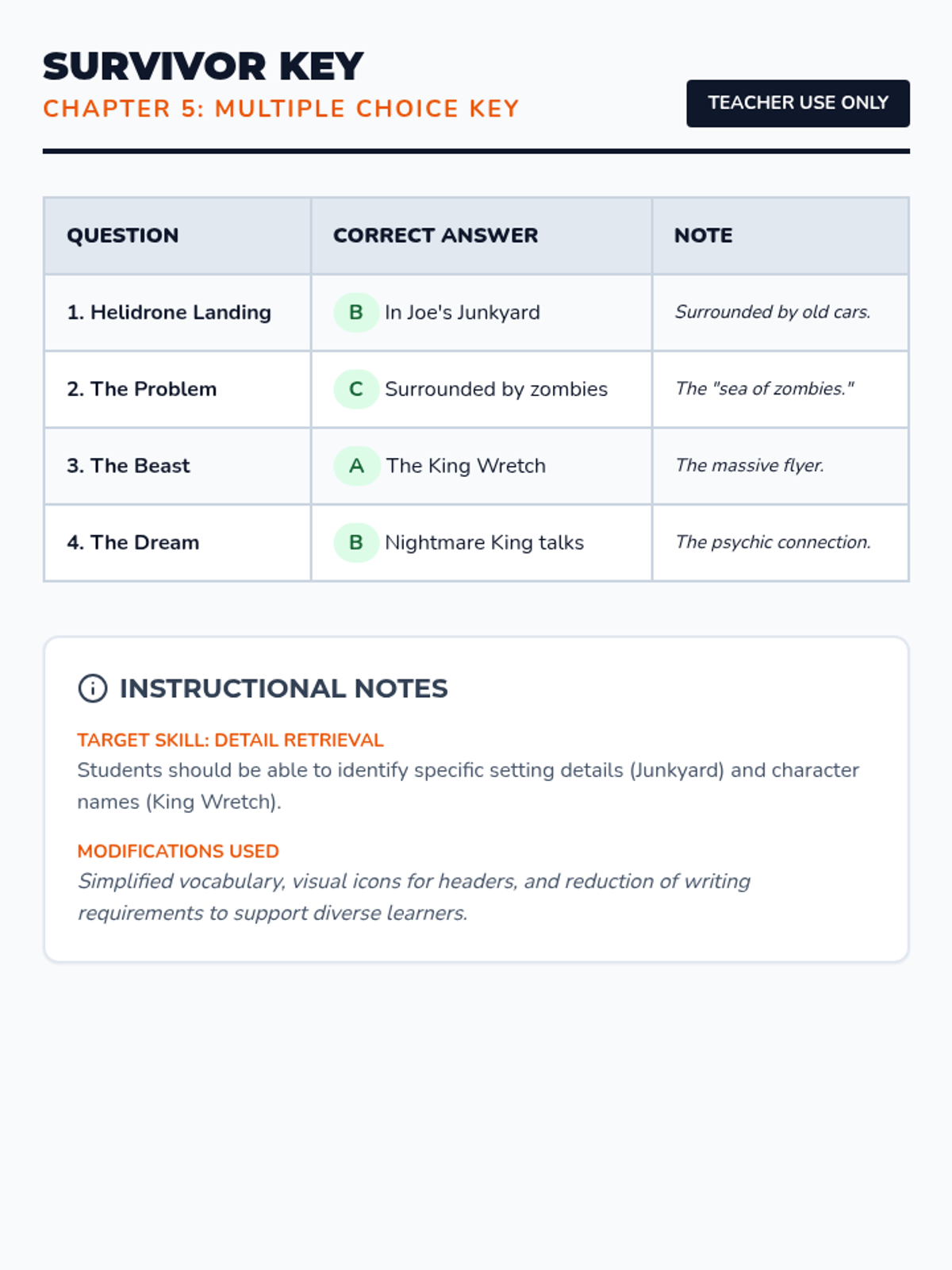 A reading comprehension lesson focused on Chapter 5 of "The Last Kids on Earth and the Nightmare King", using simplified language and visual aids to support diverse learners.