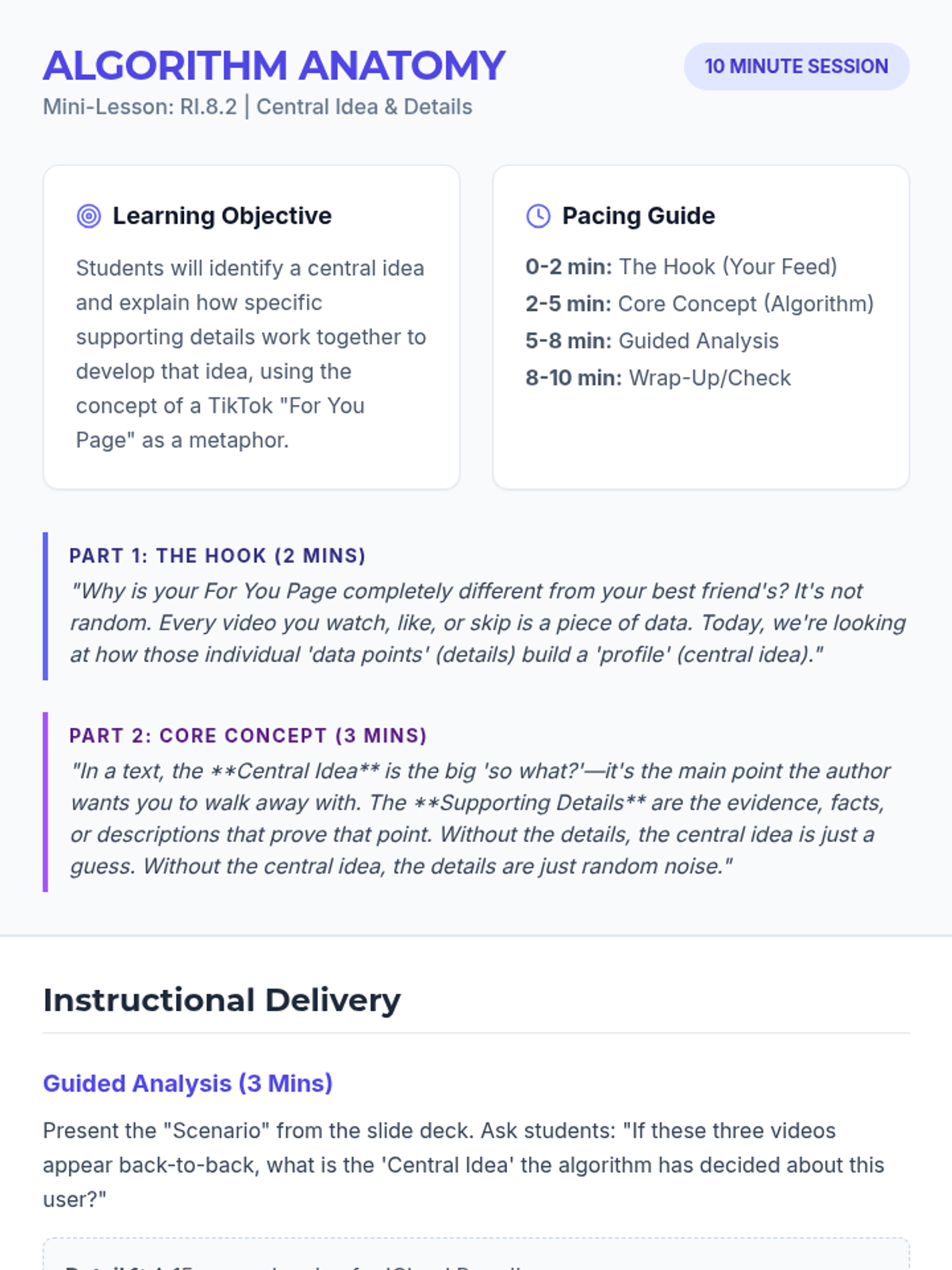 A 10-minute mini-lesson exploring the relationship between central ideas and supporting details using the relatable context of TikTok algorithms and social media feeds.
