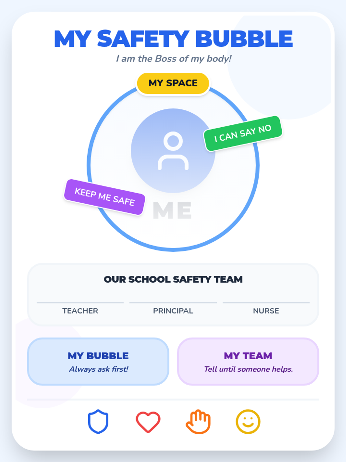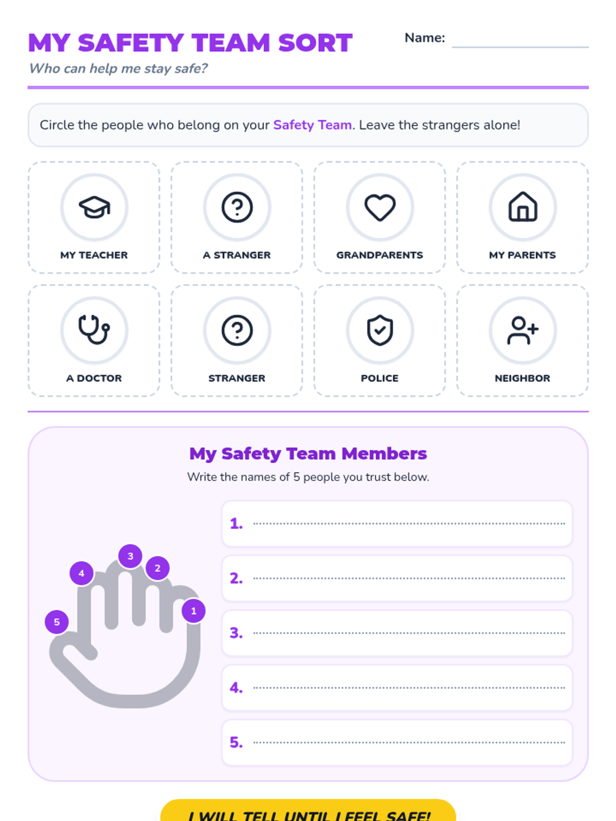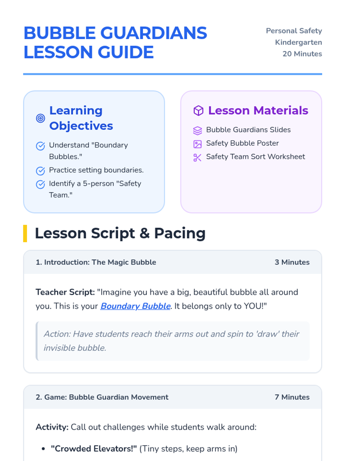 A gentle, 20-minute introduction to personal space and trusted adults for kindergarteners, featuring a movement game and a sorting activity to identify their 'Safety Team'.