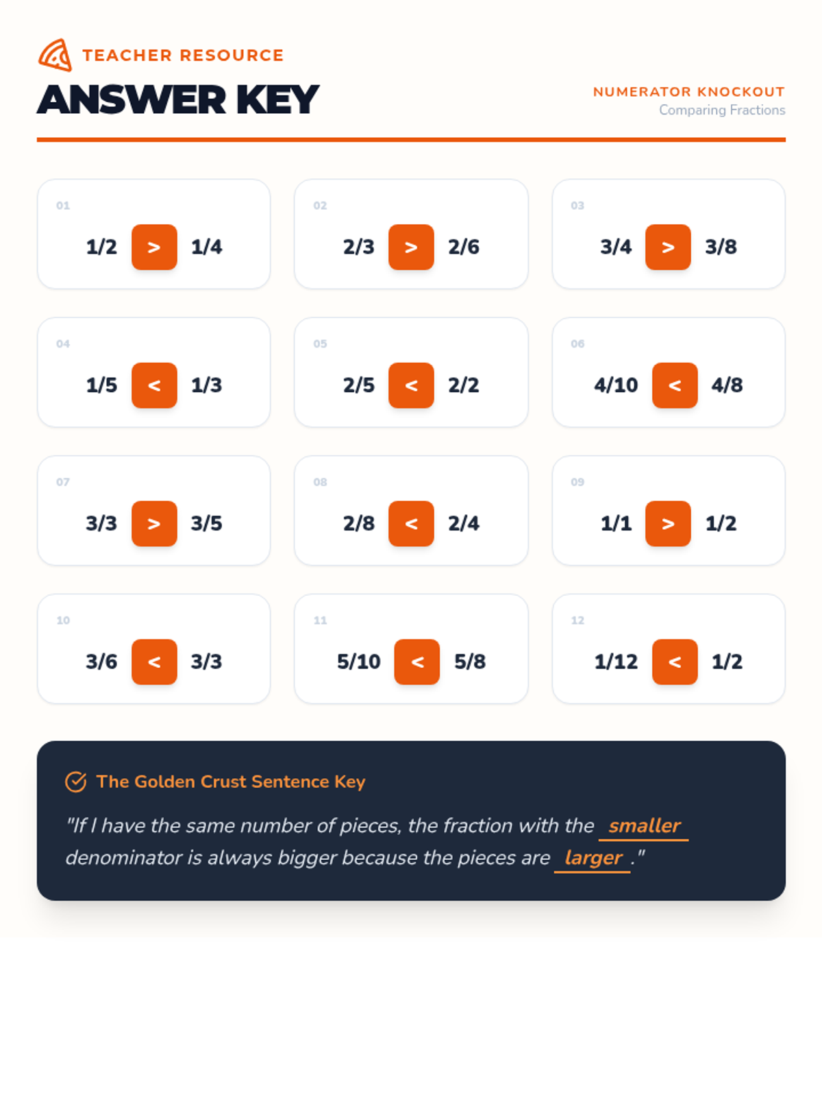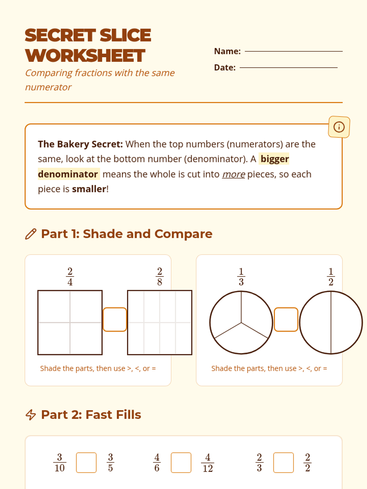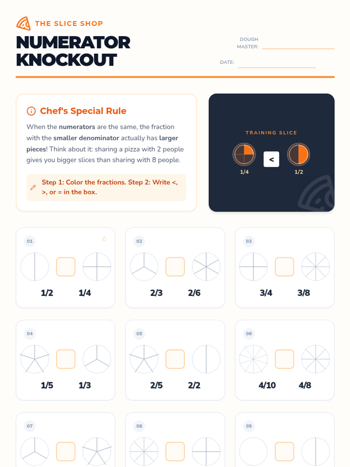 A fast-paced, collaborative lesson where students use a pizza parlor theme to master comparing fractions with either the same numerator or the same denominator. Students will visualize 'slices' to understand why a larger denominator actually means smaller pieces.