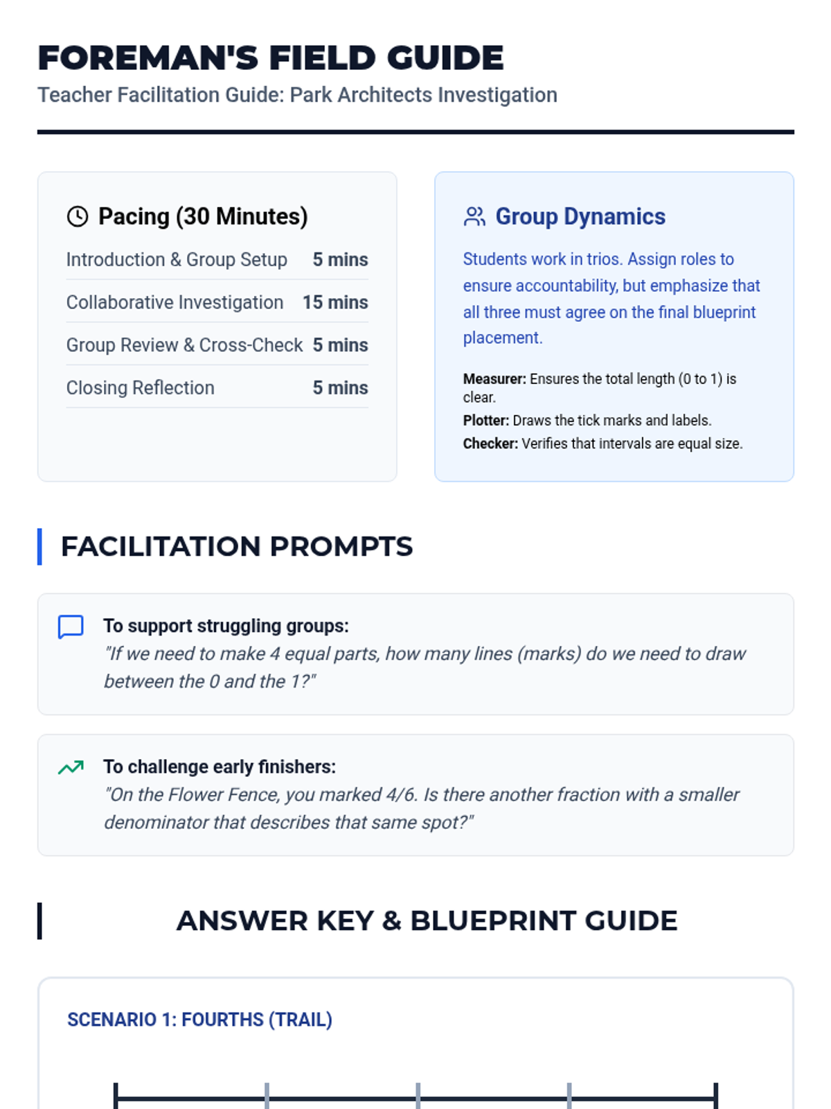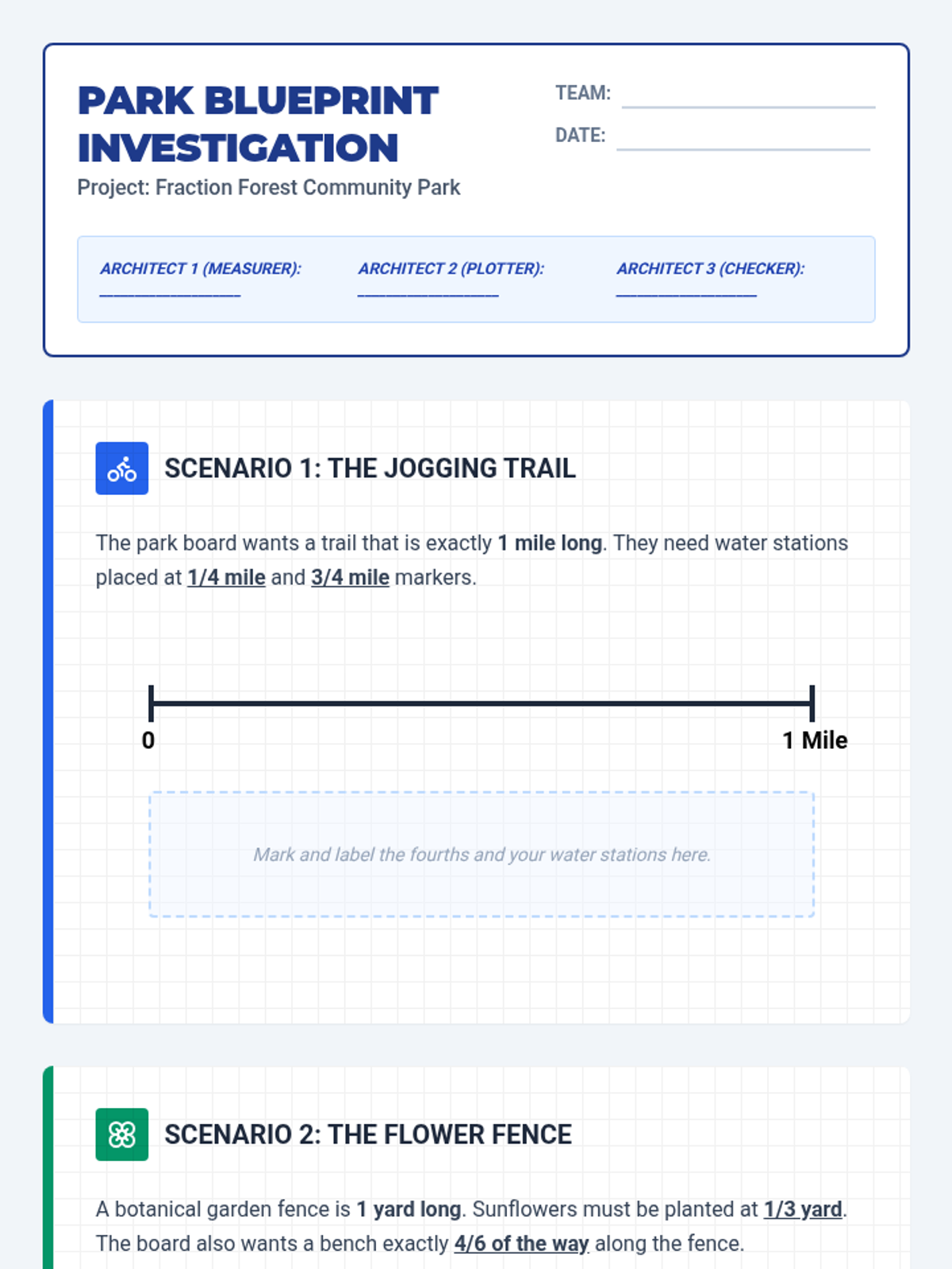In this collaborative 30-minute investigation, student 'architects' work in groups of three to design different features of a community park by representing fractions on number line diagrams. Students will master the concept of a fraction as a distance from zero on a number line across three unique scenarios involving halves, fourths, thirds, sixths, and eighths.