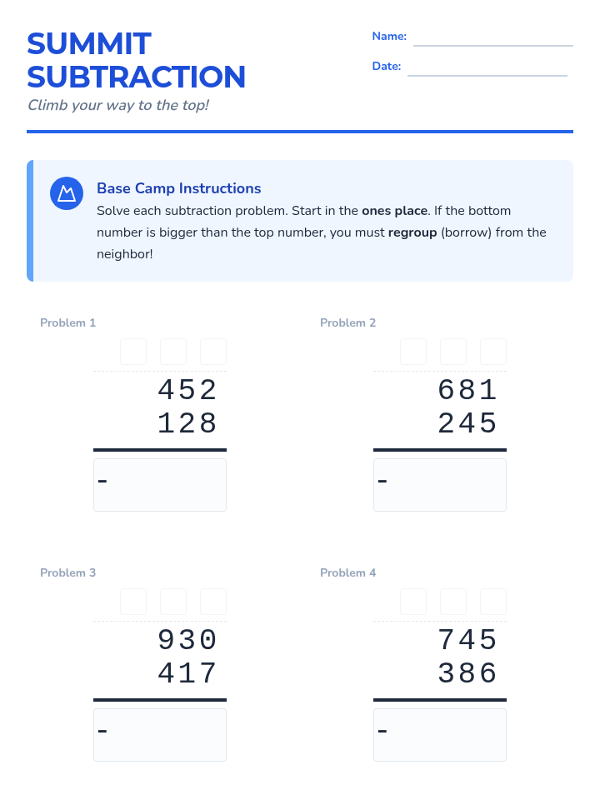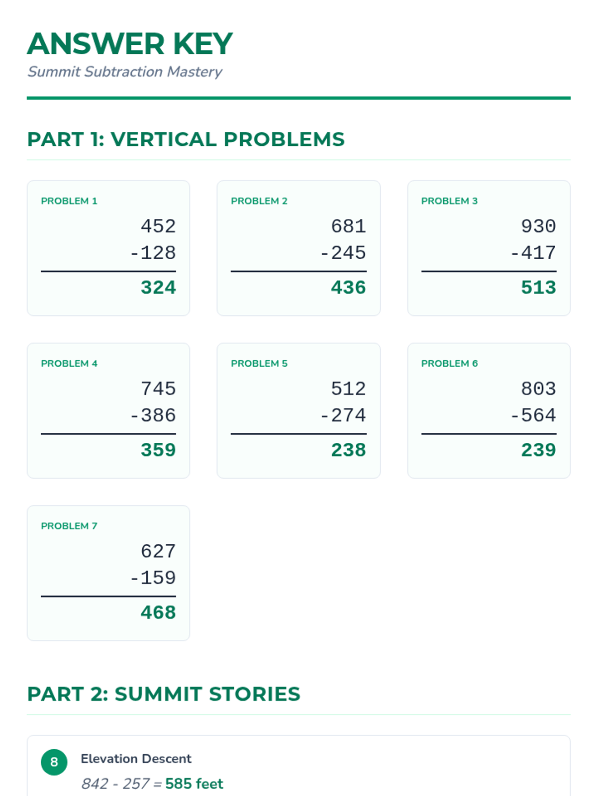 A lesson focused on mastering three-digit subtraction with regrouping through clear vertical alignment and real-world story problems.