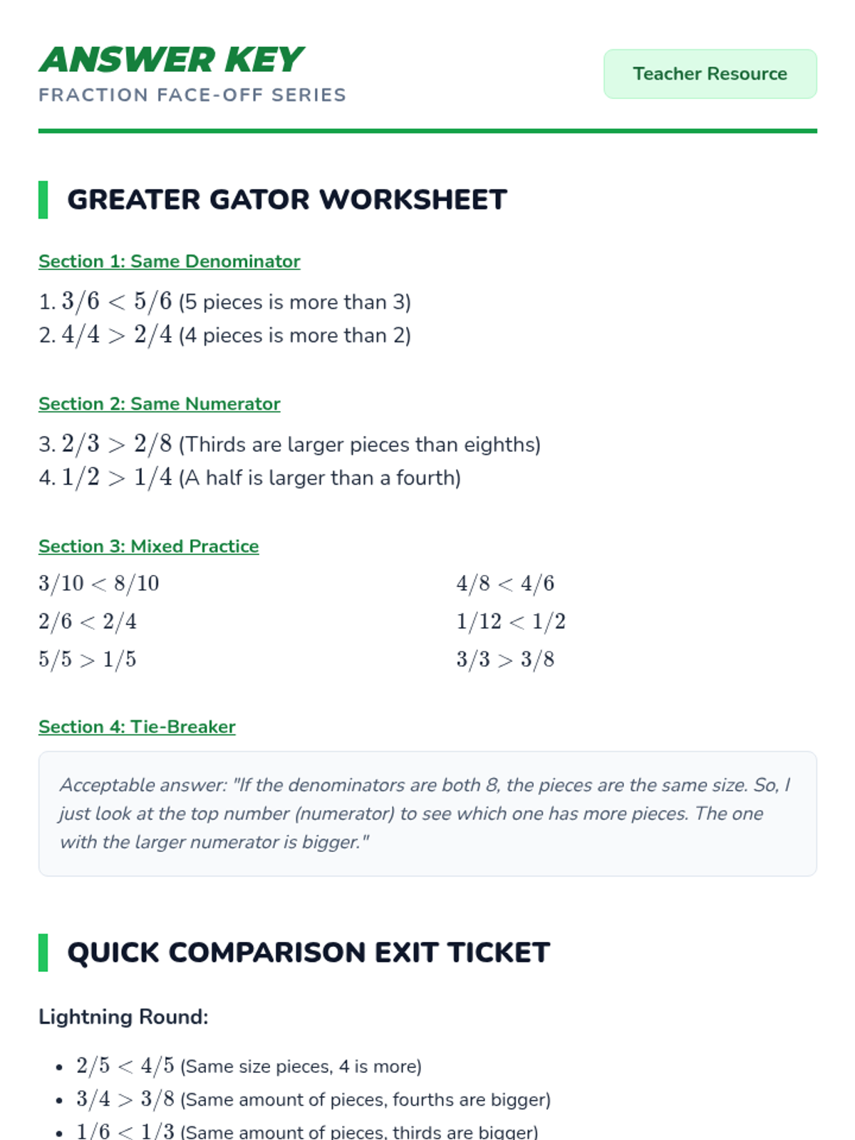 A 35-minute lesson focused on comparing fractions with like numerators or like denominators using visual models and logic. Students will learn the 'more pieces' vs. 'bigger pieces' strategy to quickly determine which fraction is greater.