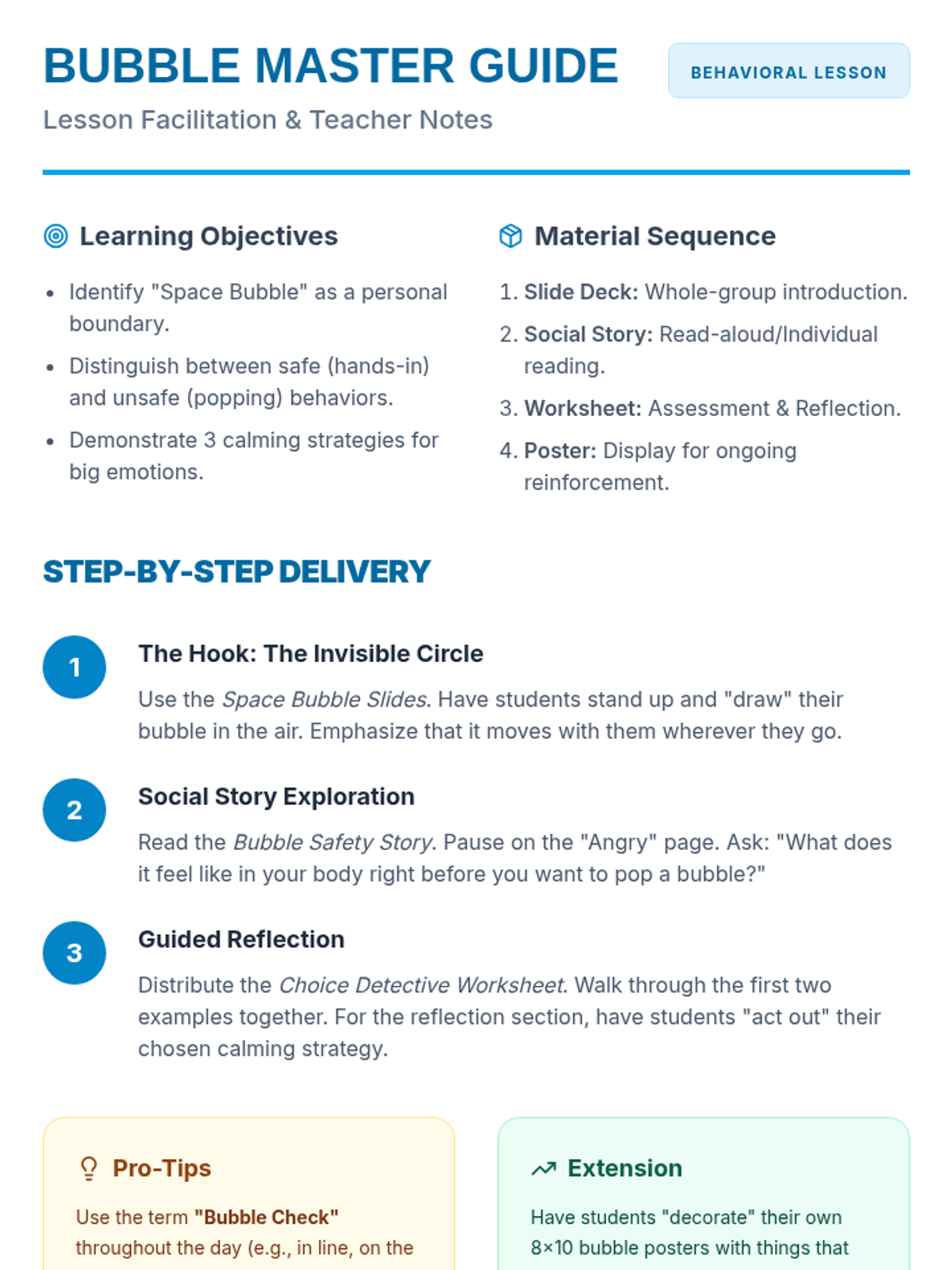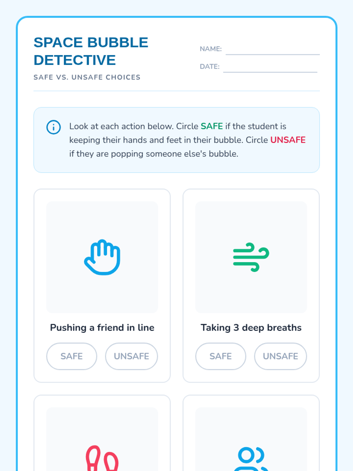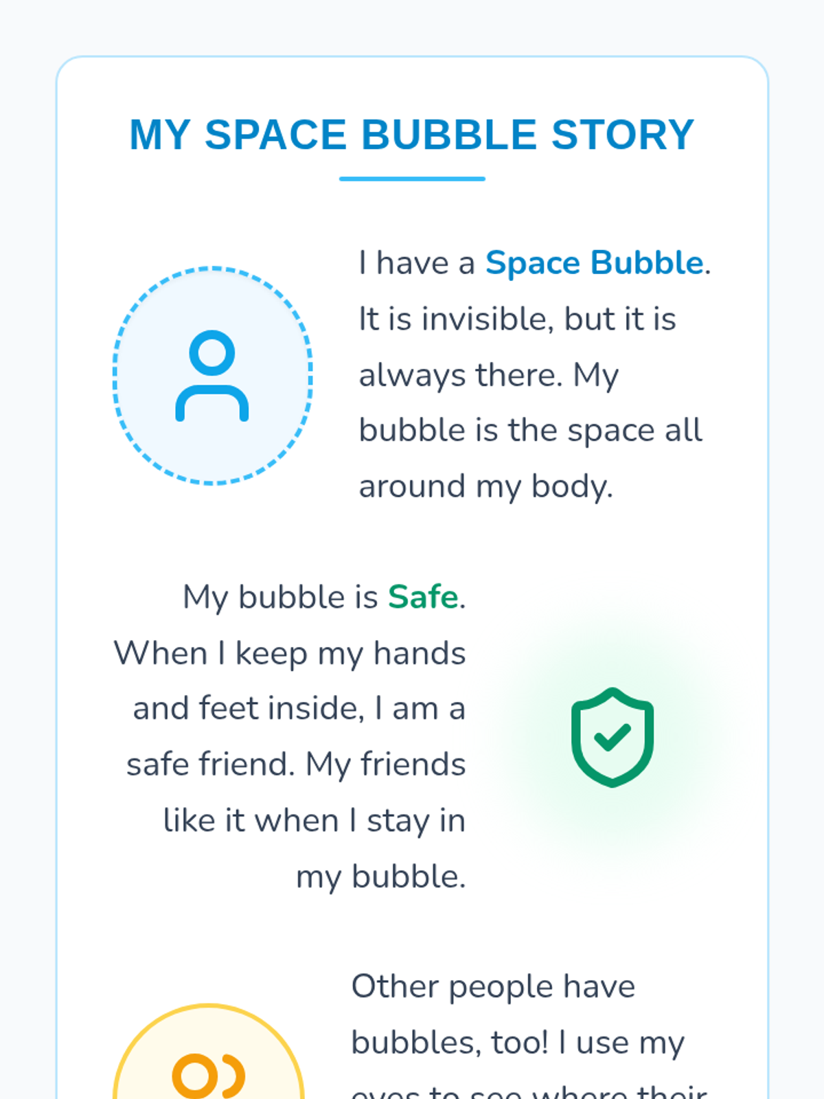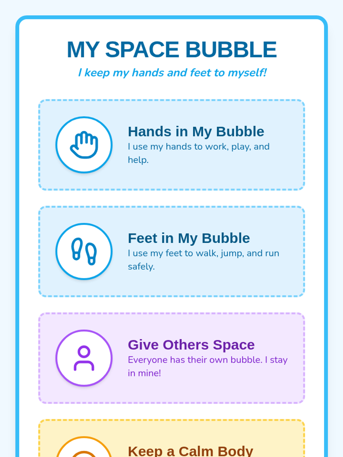 A lesson focused on teaching children the importance of personal space and keeping hands and feet to themselves through the metaphor of a 'Space Bubble'. It includes visual rules, a social story, and choice-making activities.