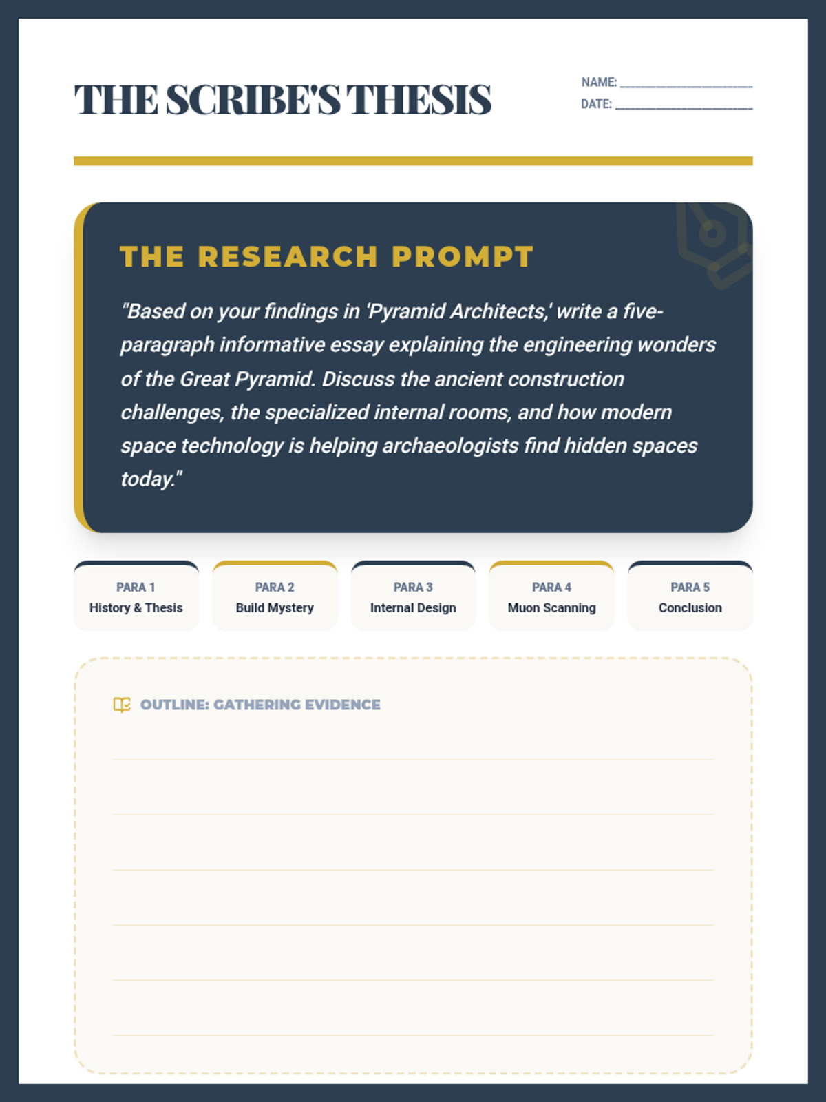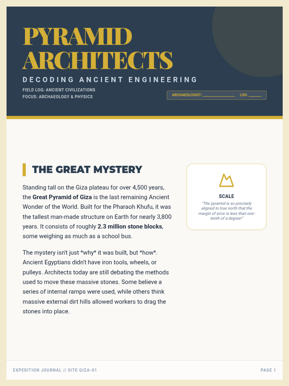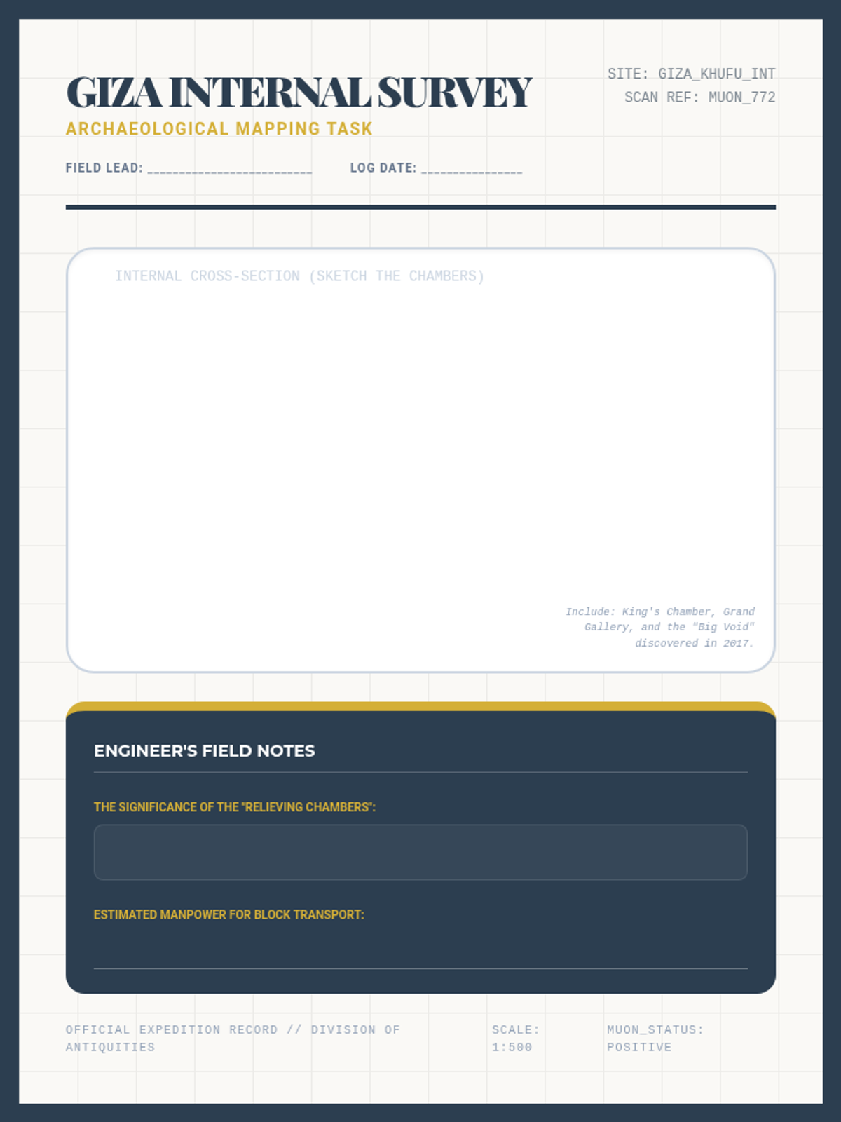 An informative lesson for 5th graders exploring the engineering mysteries and archaeological discoveries of the Great Pyramid of Giza, featuring modern scanning technology and ancient construction theories.