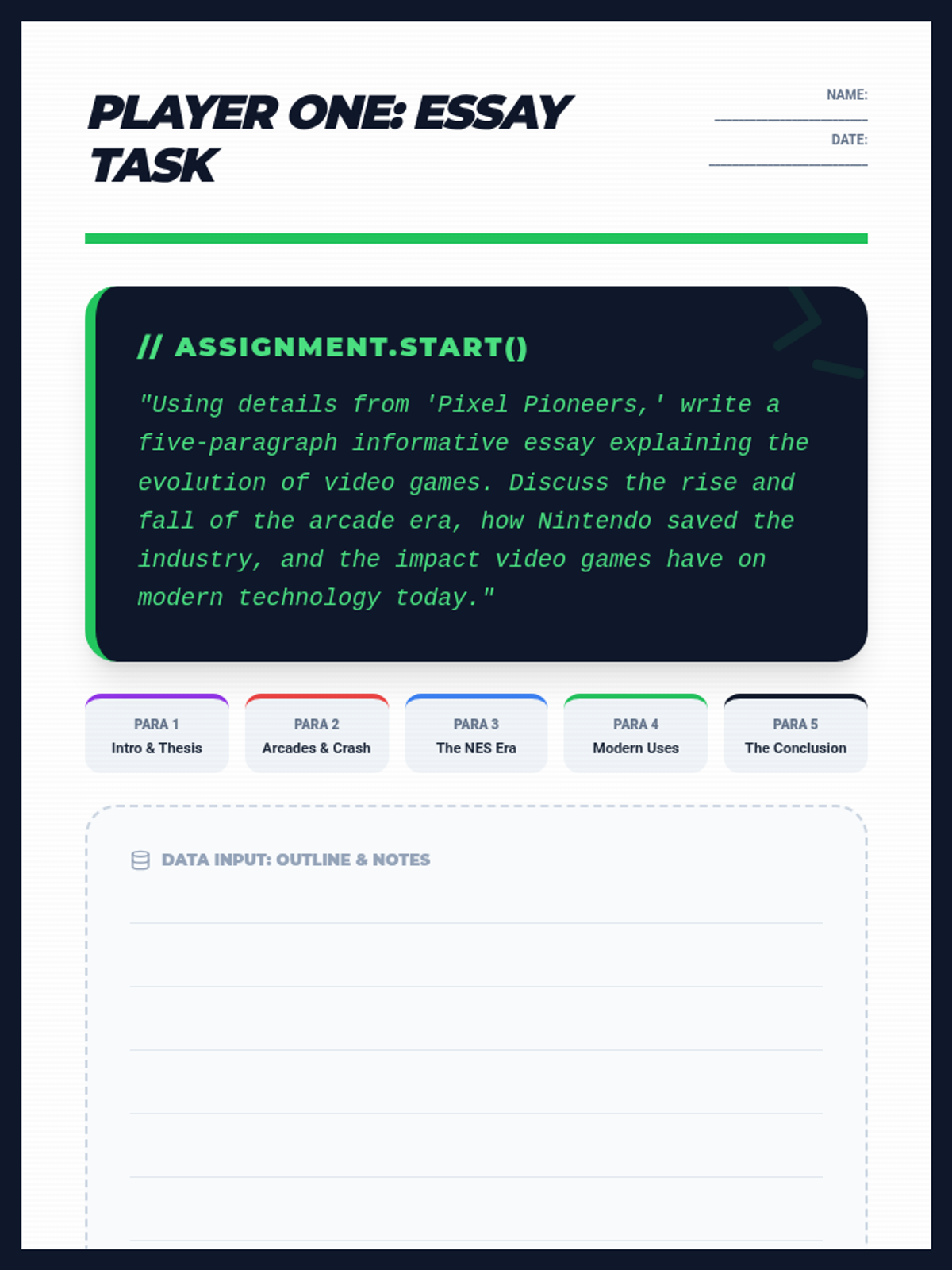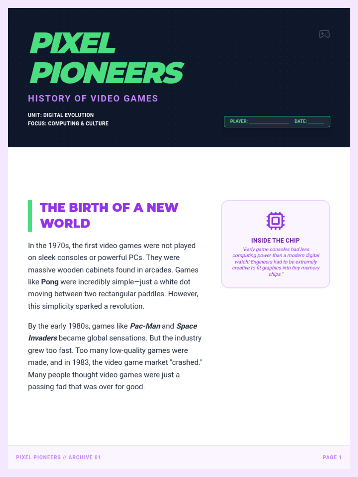 An informative unit for 5th graders tracing the history of video games from simple arcade pixels to immersive modern worlds, with a focus on technical innovation and cultural impact.