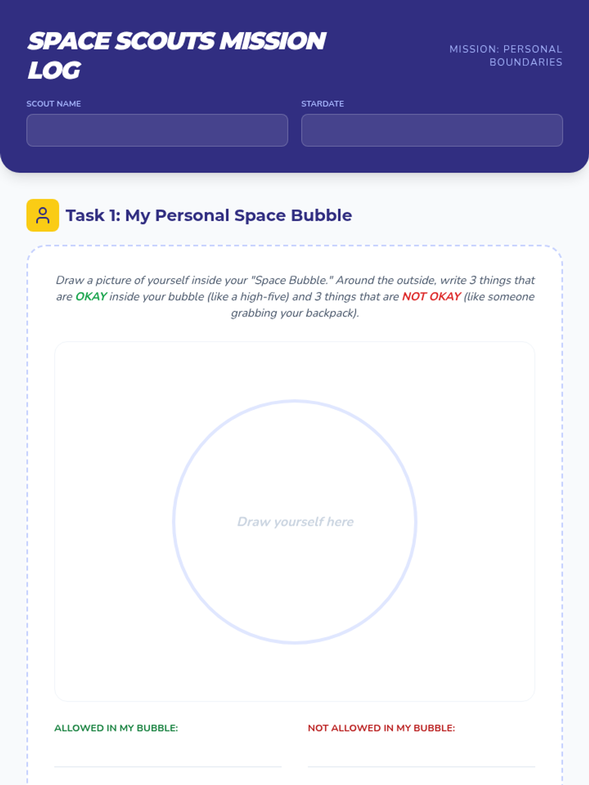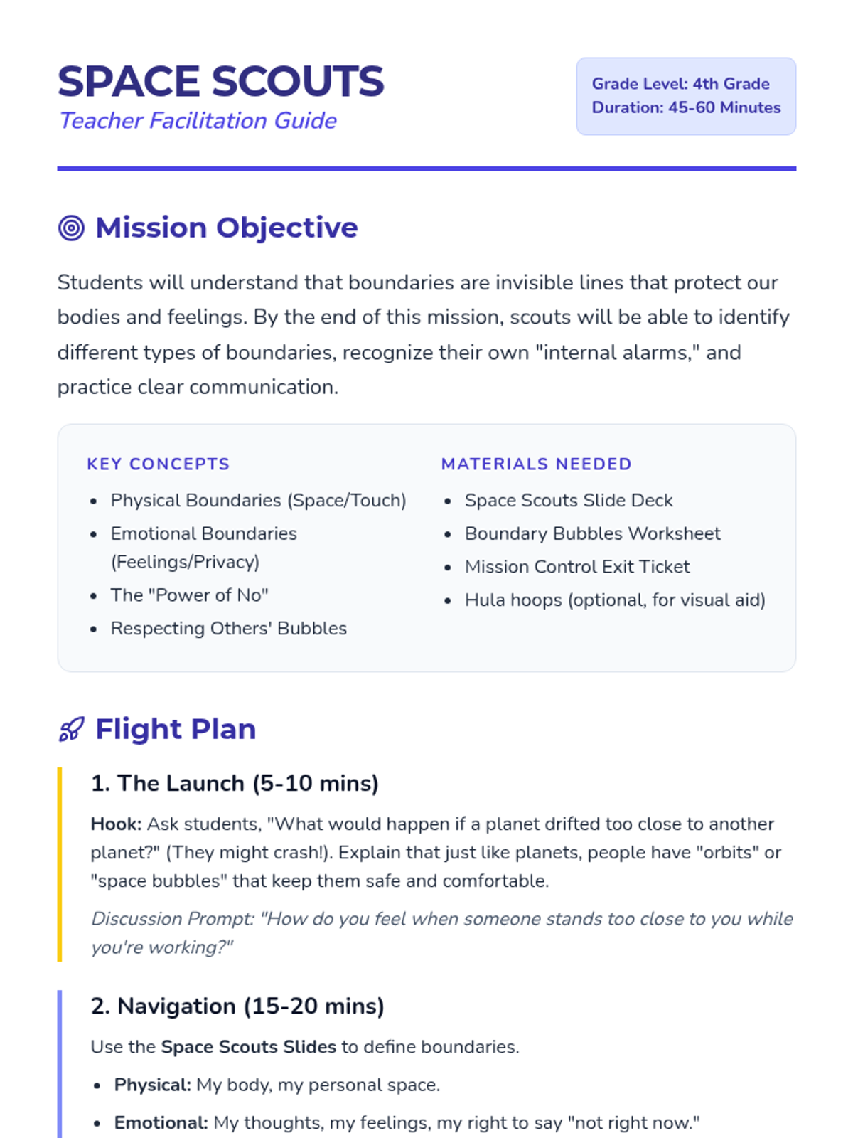 A comprehensive lesson for 4th graders on identifying, communicating, and respecting physical and emotional boundaries using a 'Space Scouts' metaphor.