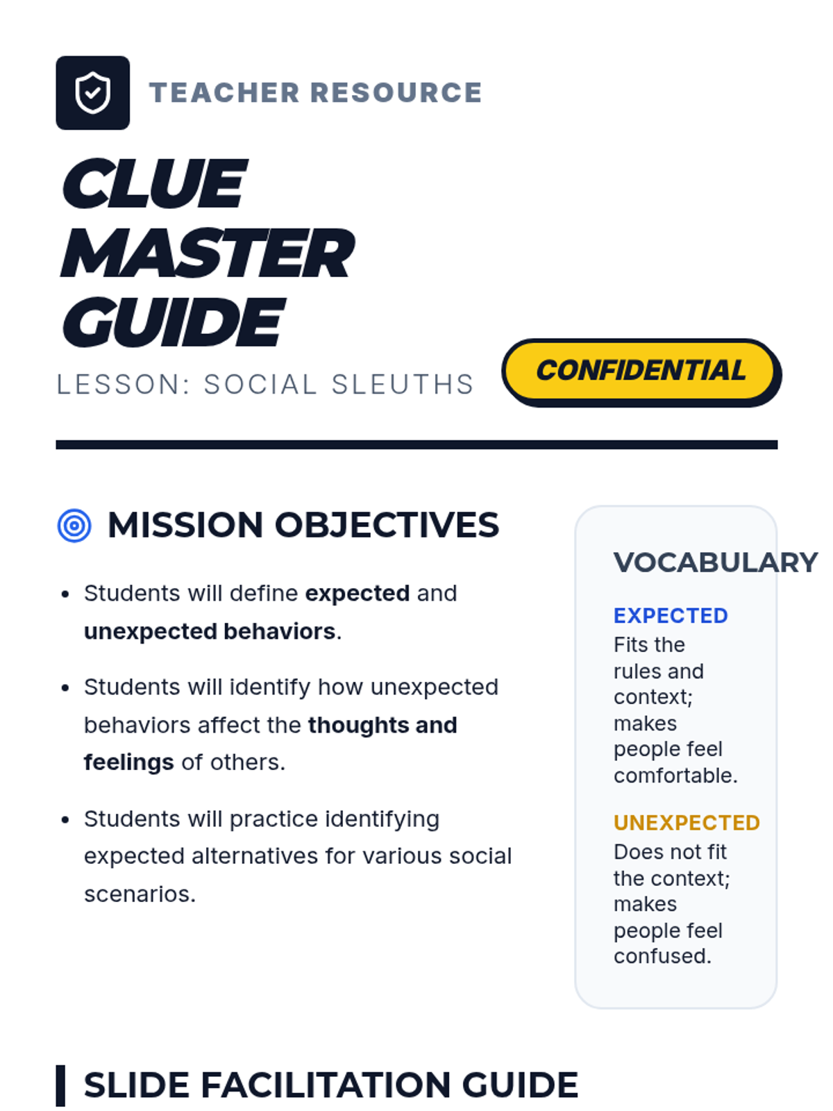 A social-emotional learning lesson that teaches elementary students to identify 'unexpected behaviors' across different settings using a detective-themed investigation. Students learn how their actions affect the thoughts and feelings of those around them.