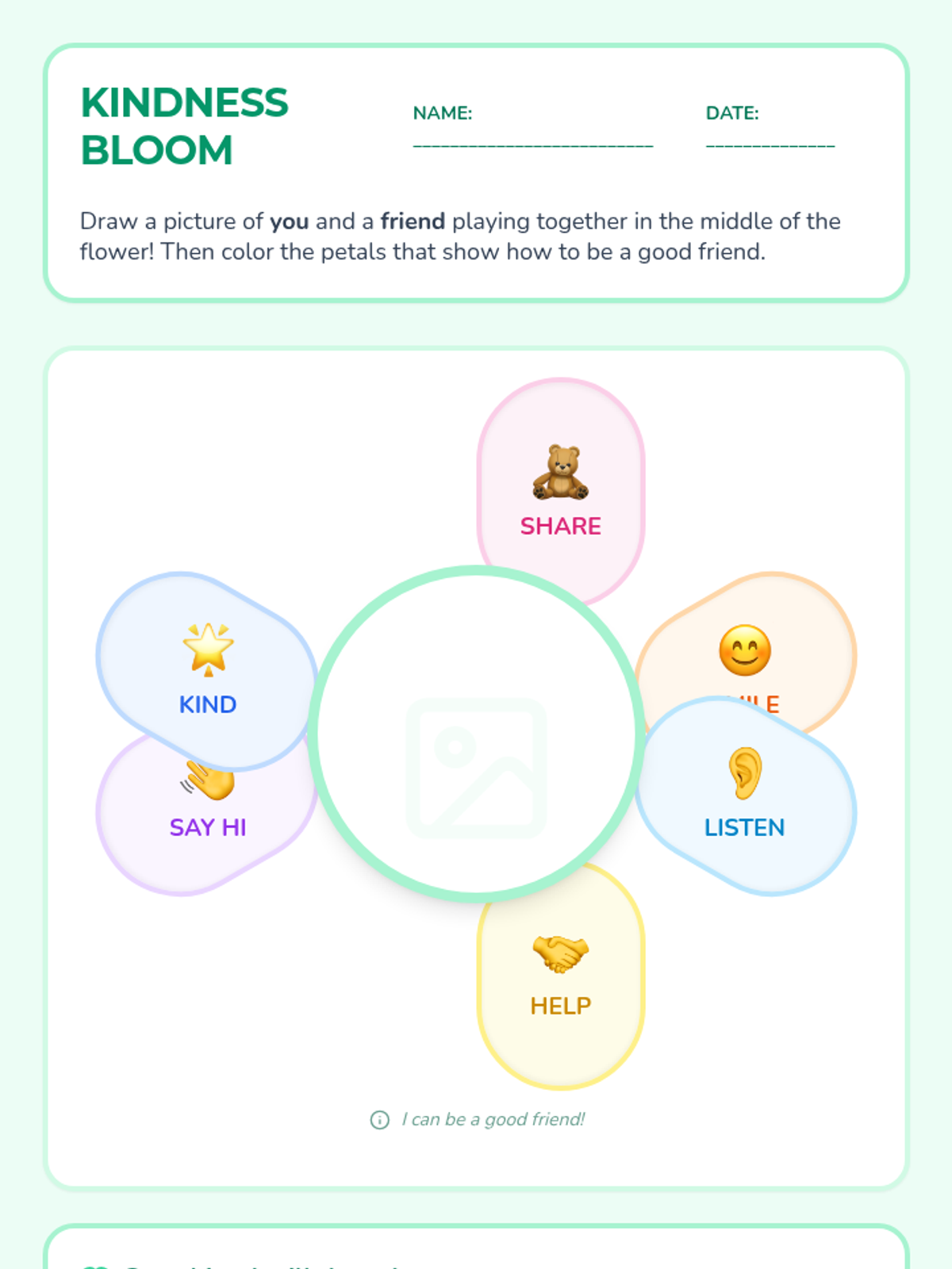 A foundational lesson on personal space and cooperative play. Students learn to use the 'Friendship Bubble' metaphor to respect boundaries and practice the 'Two-Way Ask' when starting games.