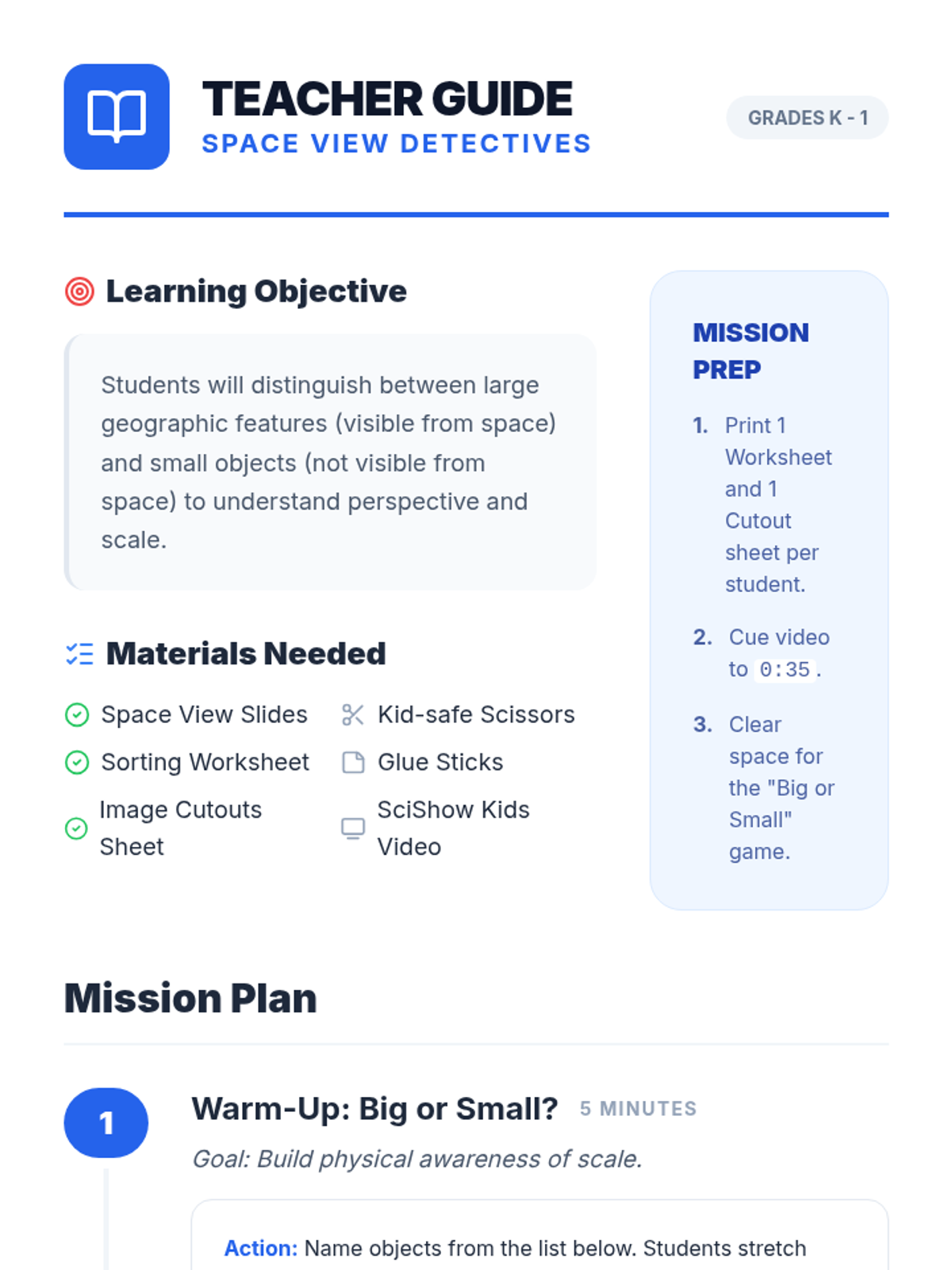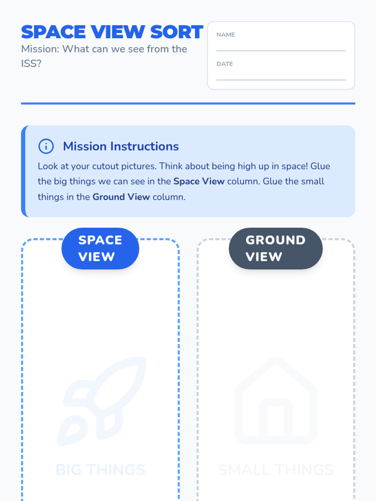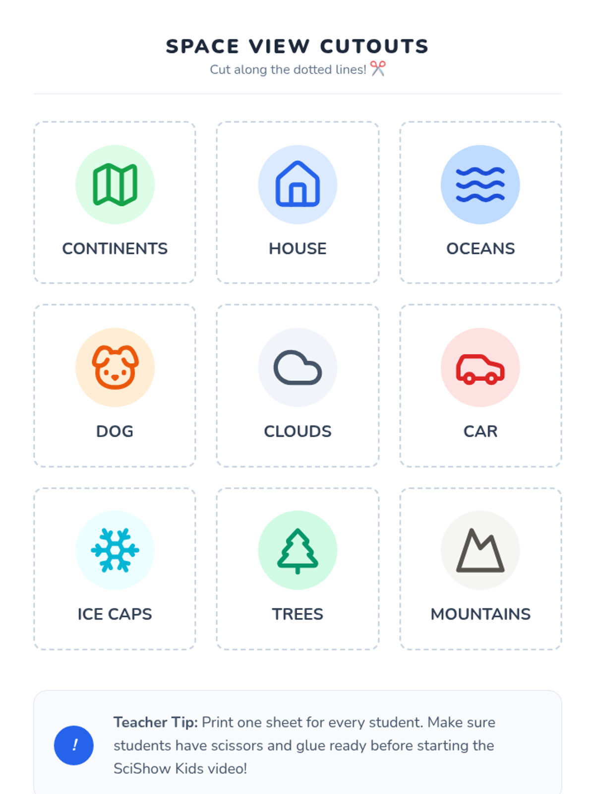Students explore the concept of perspective and scale by distinguishing between large geographic features visible from space and small objects that are not. The lesson uses a SciShow Kids video to illustrate what astronauts see from the International Space Station versus what we see on the ground.