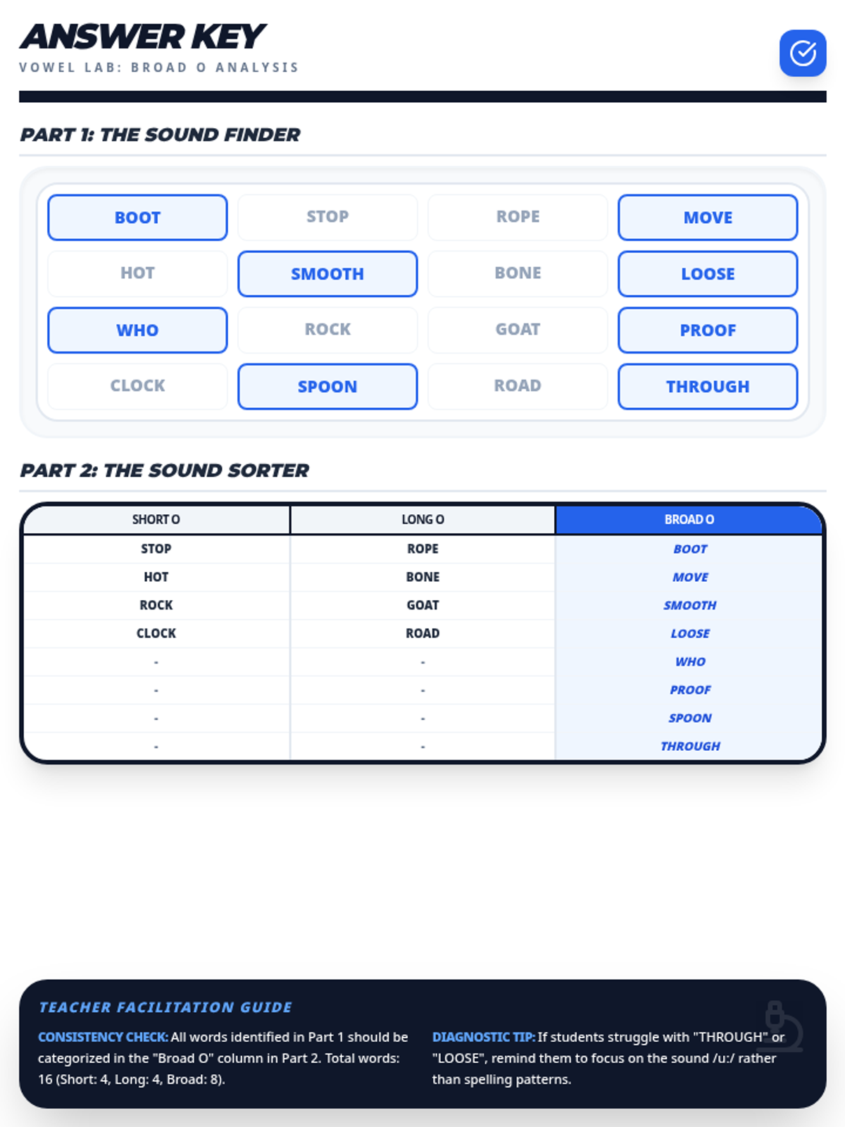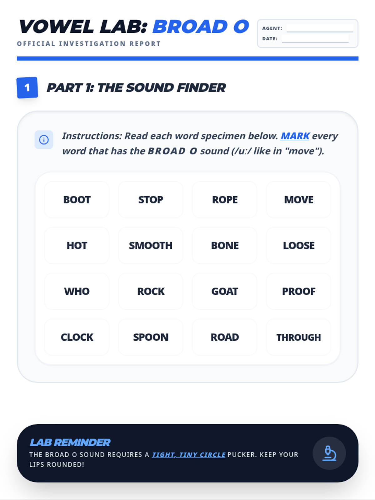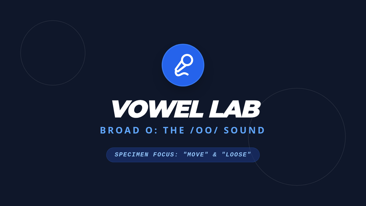 A lesson focusing on the pronunciation, mouth mechanics, and identification of the broad vowel sound O (/uː/), including comparisons with short and long O sounds.