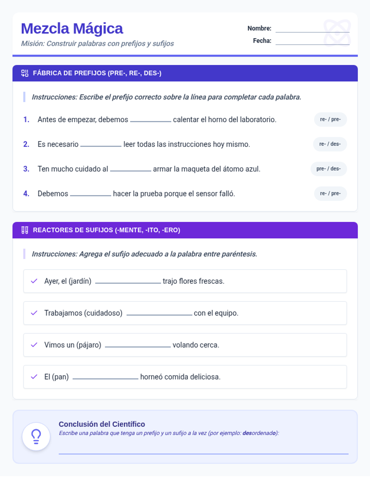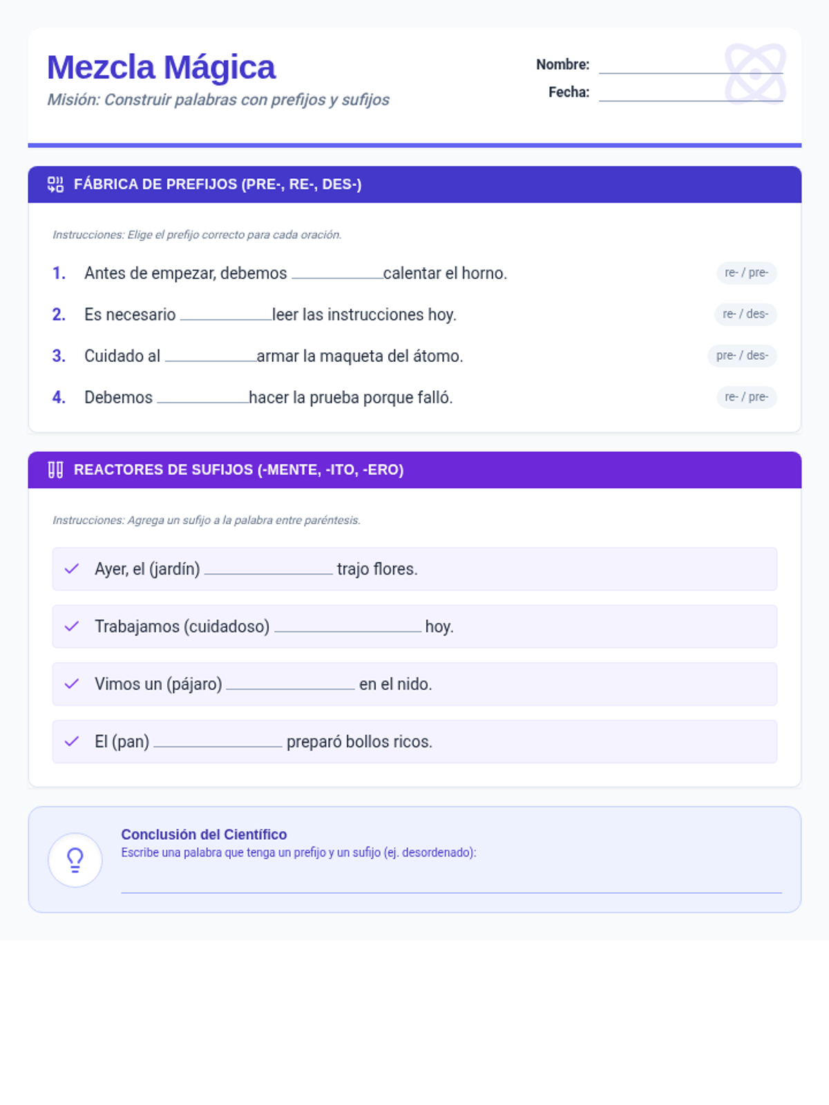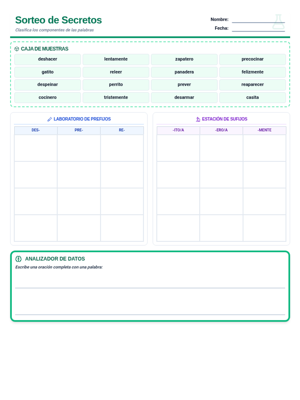 Una serie de actividades interactivas para centros de aprendizaje enfocadas en el dominio de prefijos, sufijos y palabras de alta frecuencia en español.
