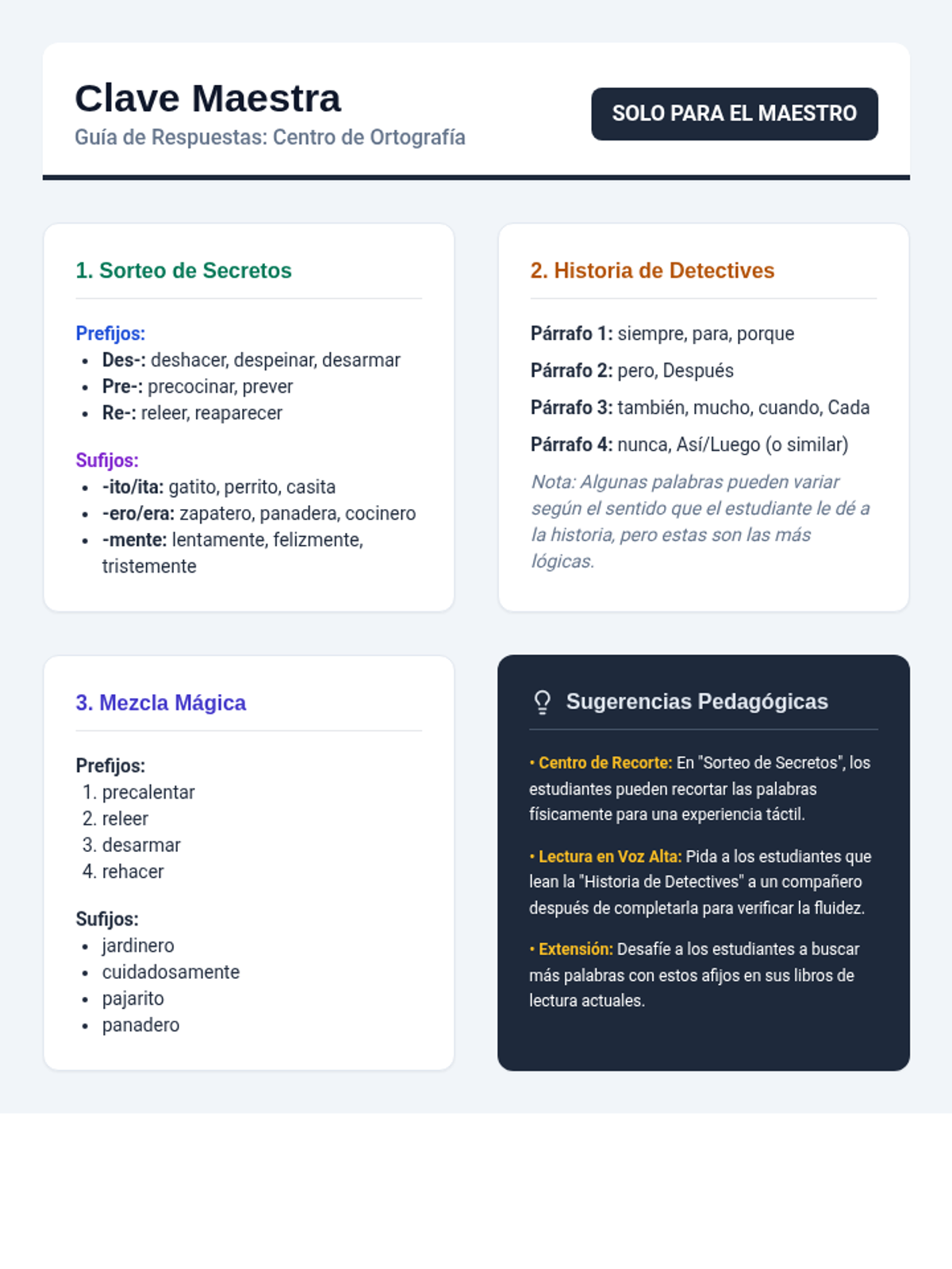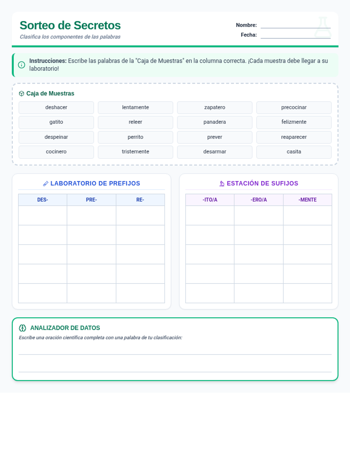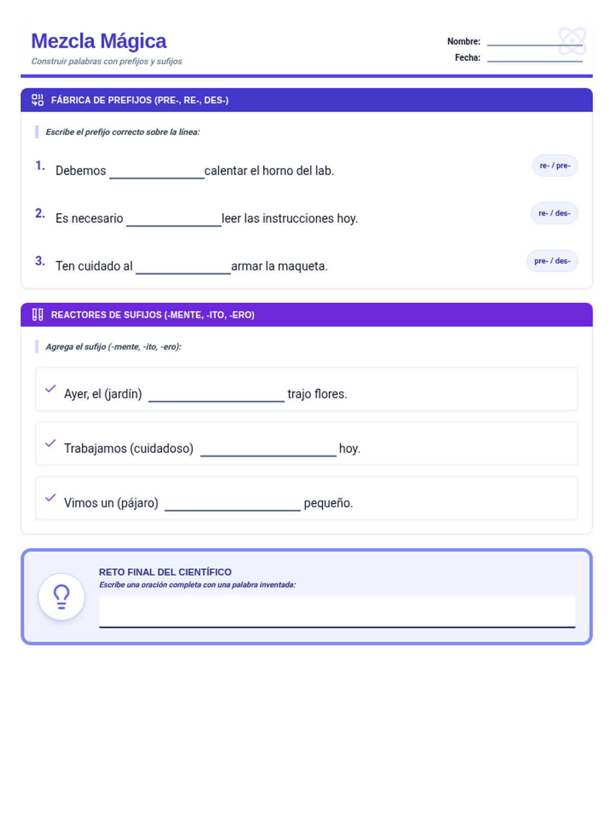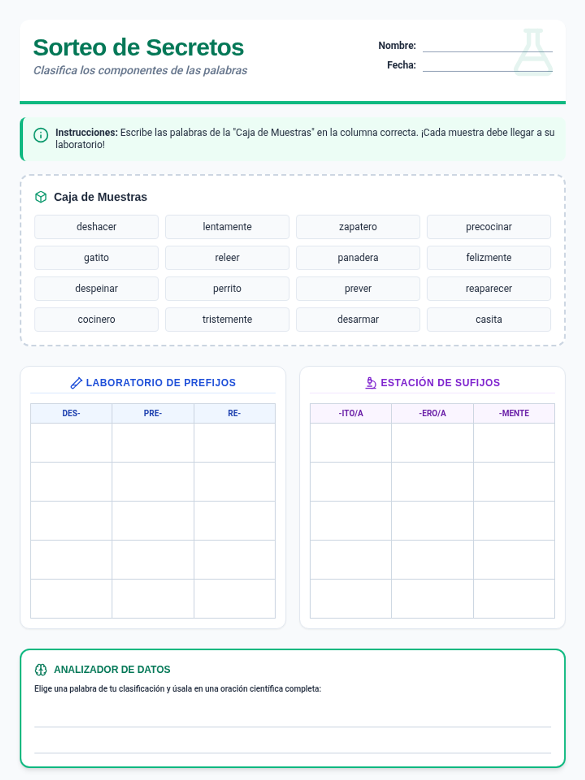 Una serie de actividades interactivas para centros de aprendizaje enfocadas en el dominio de prefijos, sufijos y palabras de alta frecuencia en español.