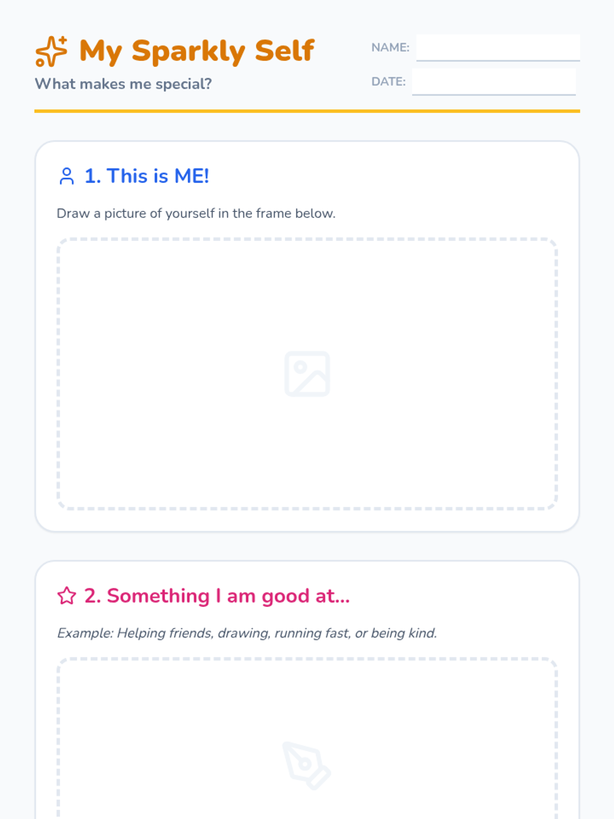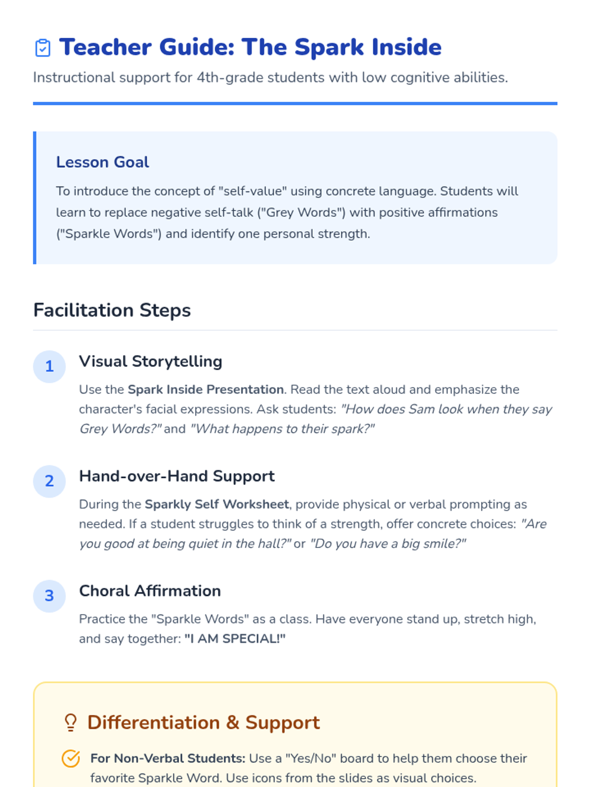 A gentle lesson designed for 4th-grade students with low cognitive abilities to foster self-value through simple social narratives and creative drawing activities. Students will explore positive self-talk ('Sparkle Words') and identify personal strengths in a highly visual, supportive format.