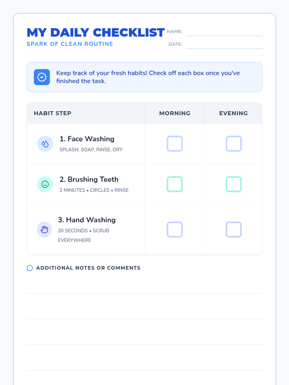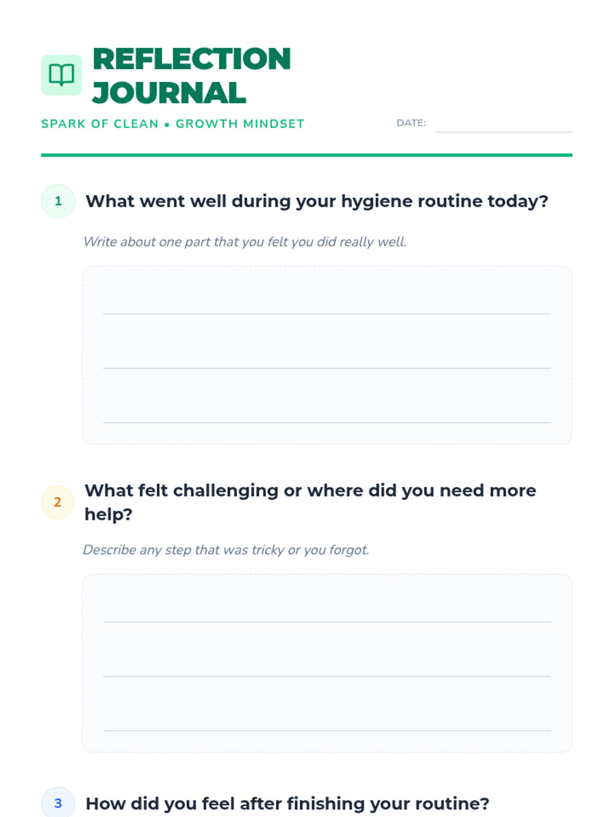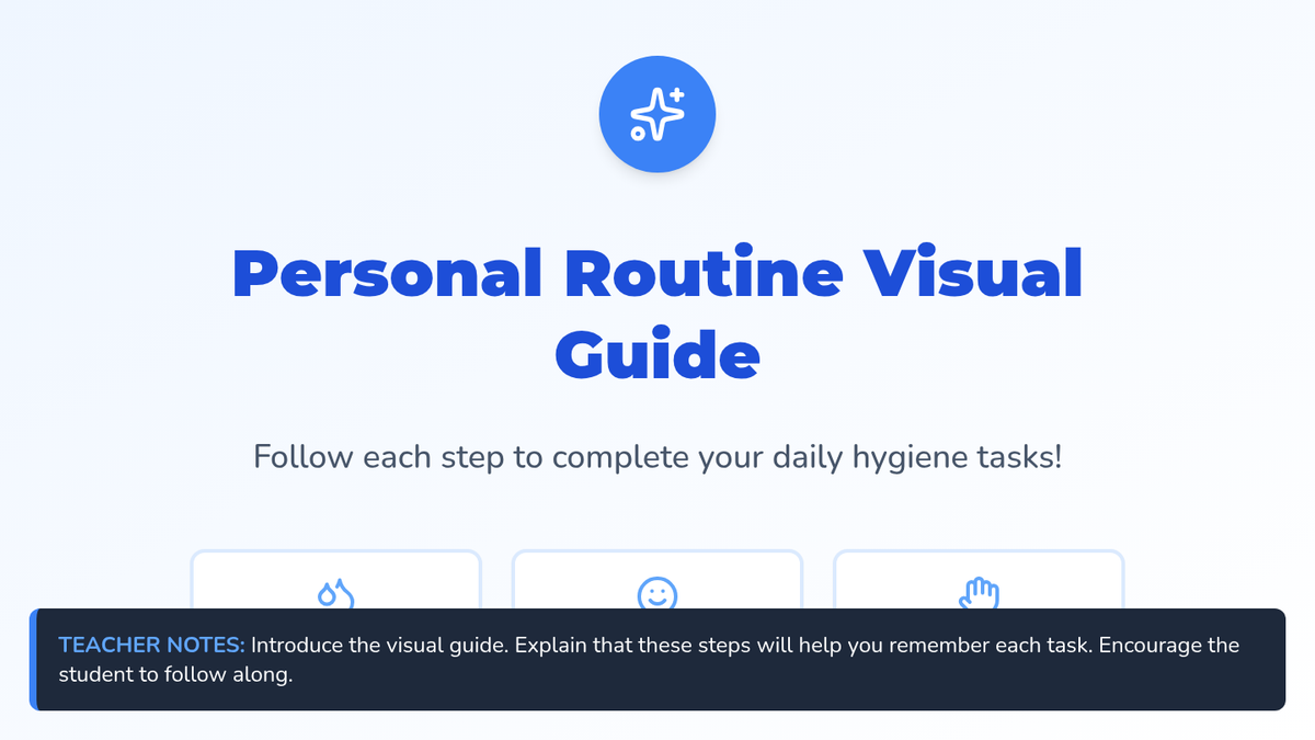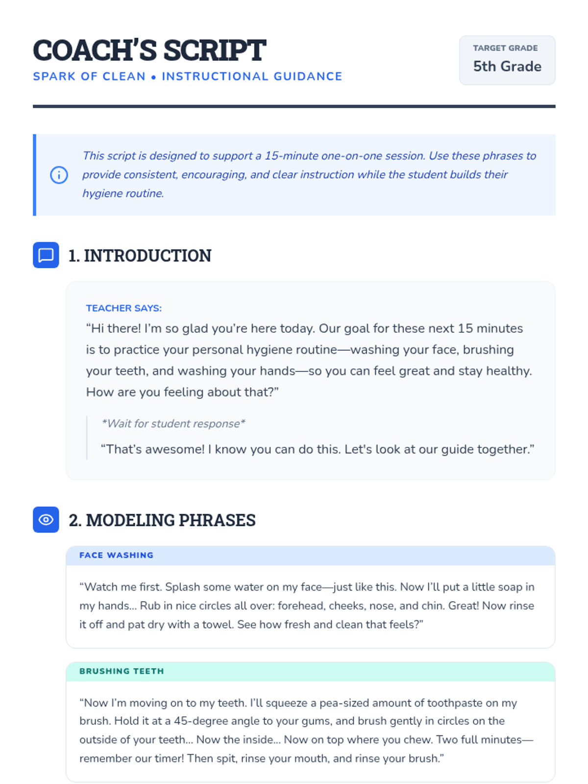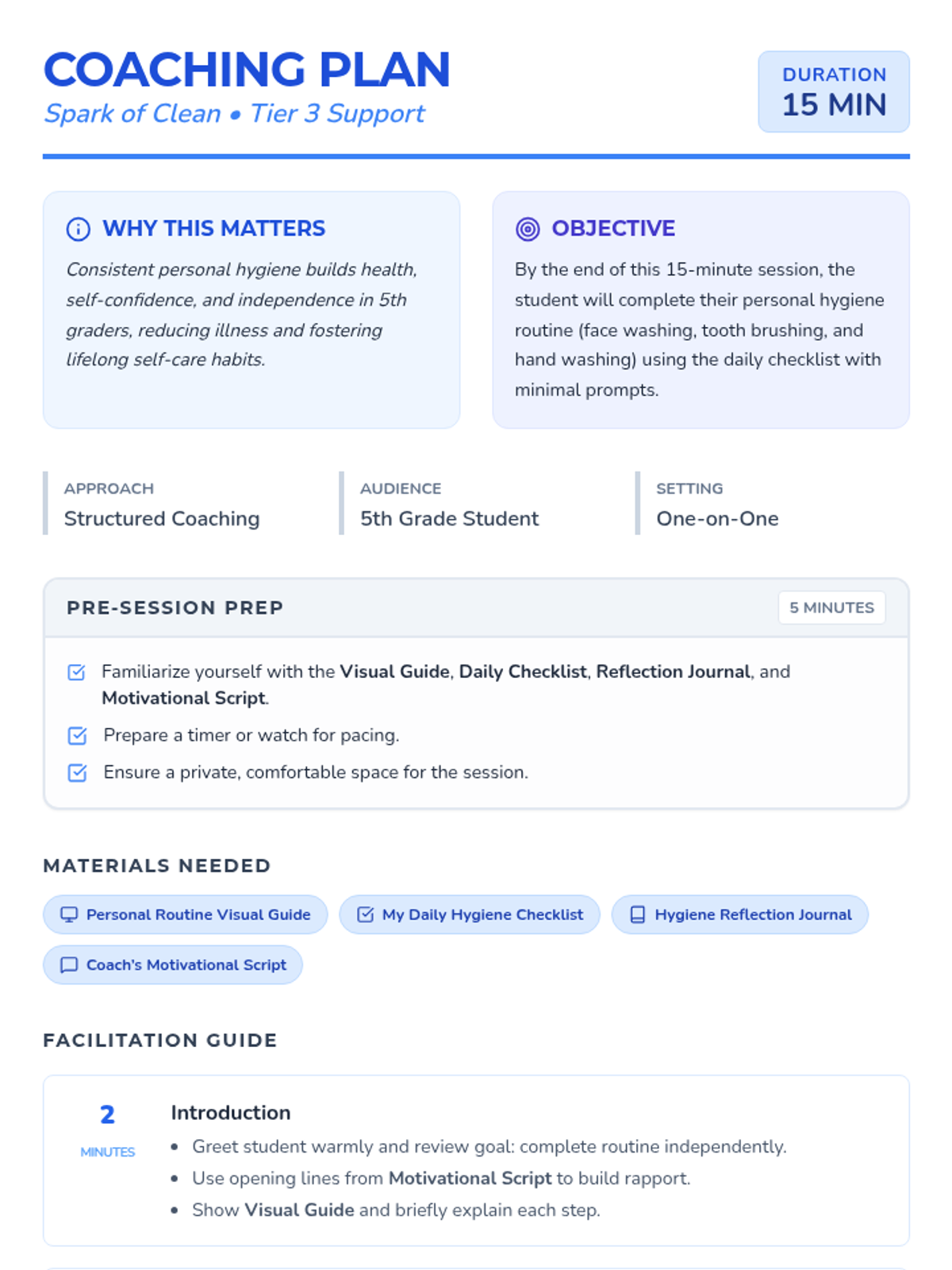 An individualized coaching session designed to support 5th-grade students in building consistent personal hygiene habits through guided practice and visual supports.