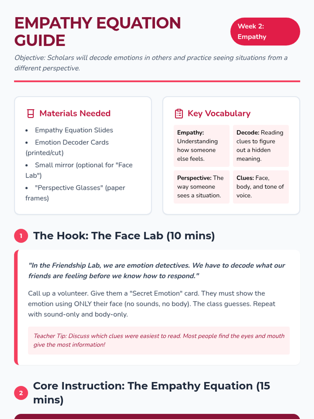 A social-emotional learning lesson designed for 3rd-5th graders to develop empathy and perspective-taking skills through immersive scenarios and role-playing. Students will learn to 'walk in someone else's shoes' using a field-guide inspired approach to human emotions.