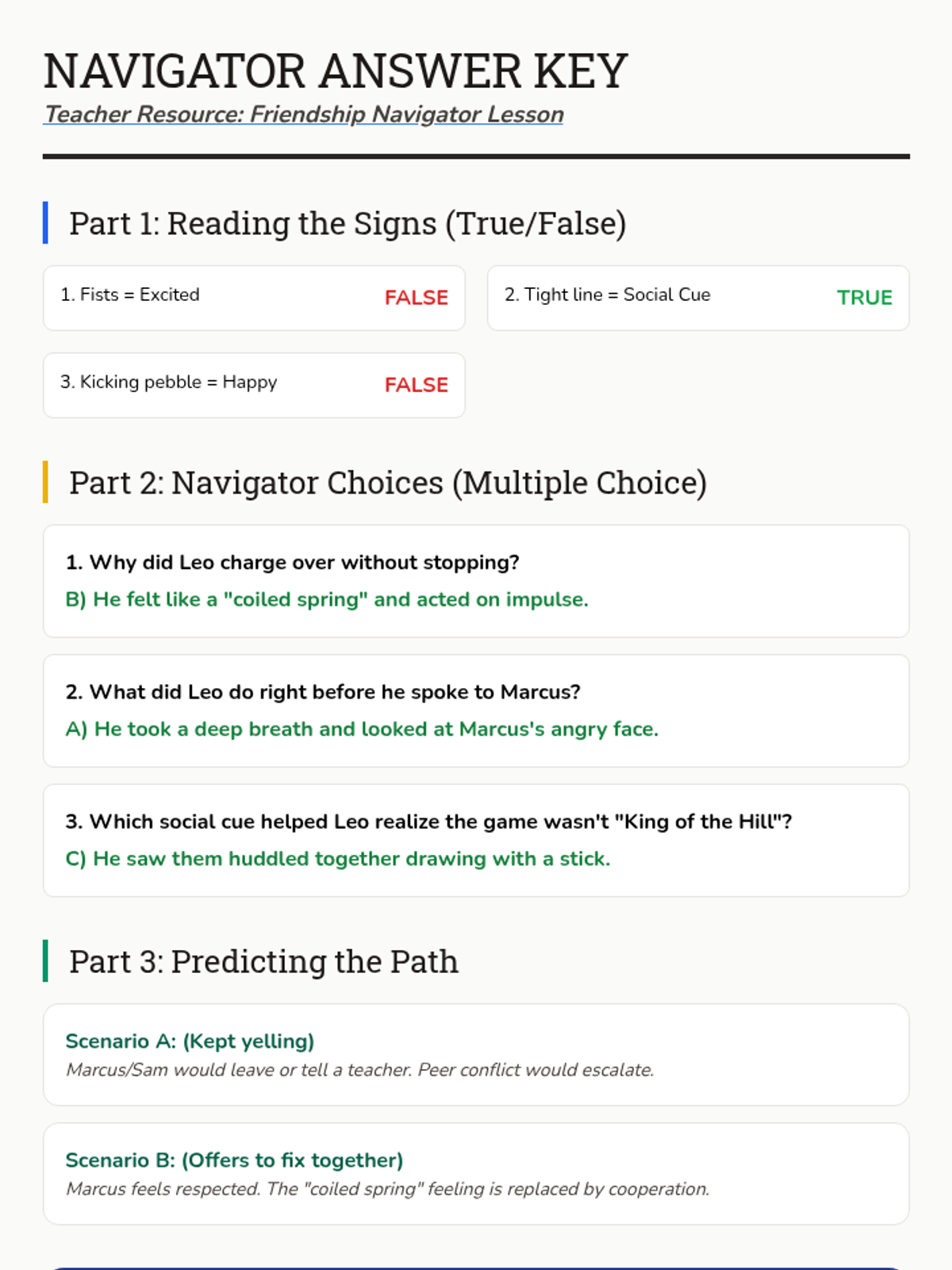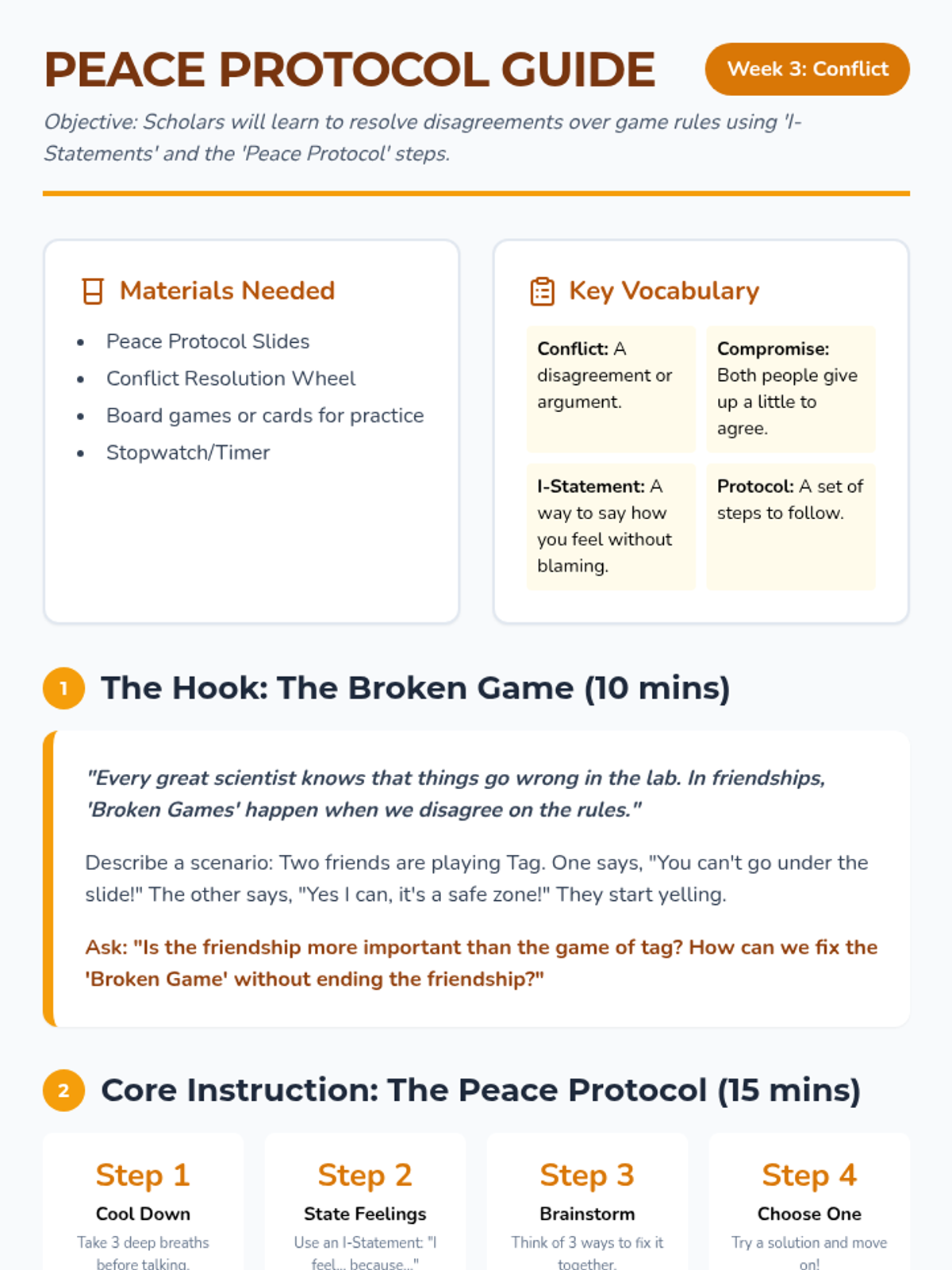Provides practical strategies for resolving conflicts, specifically targeting disagreements over game rules. Students practice using I-statements and finding compromises.