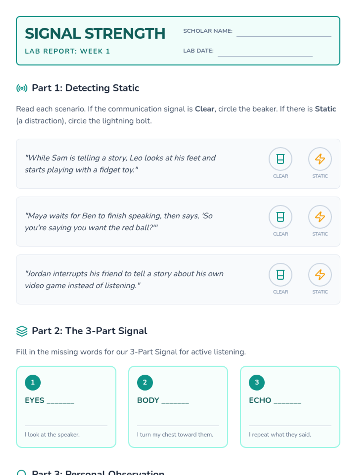 Focuses on the fundamentals of communication, emphasizing active listening and clear expression. Students learn that 'good signals' are essential for strong peer connections.
