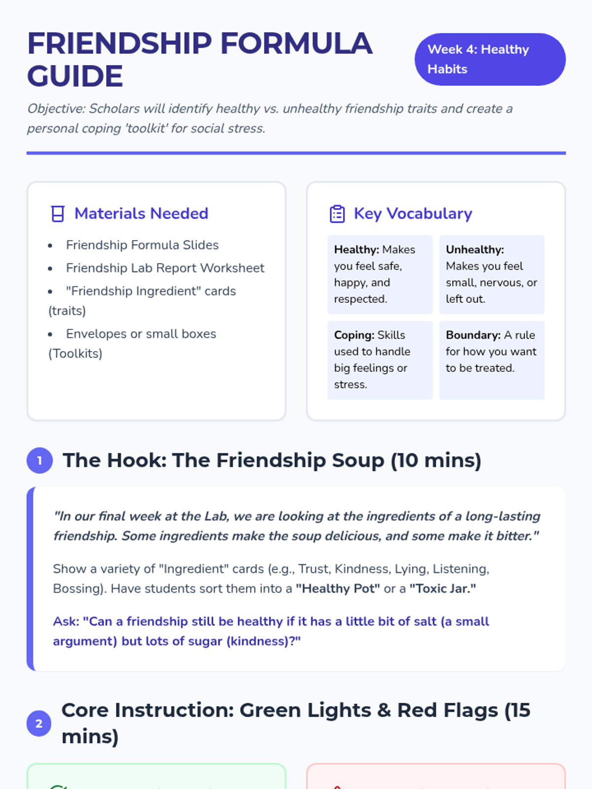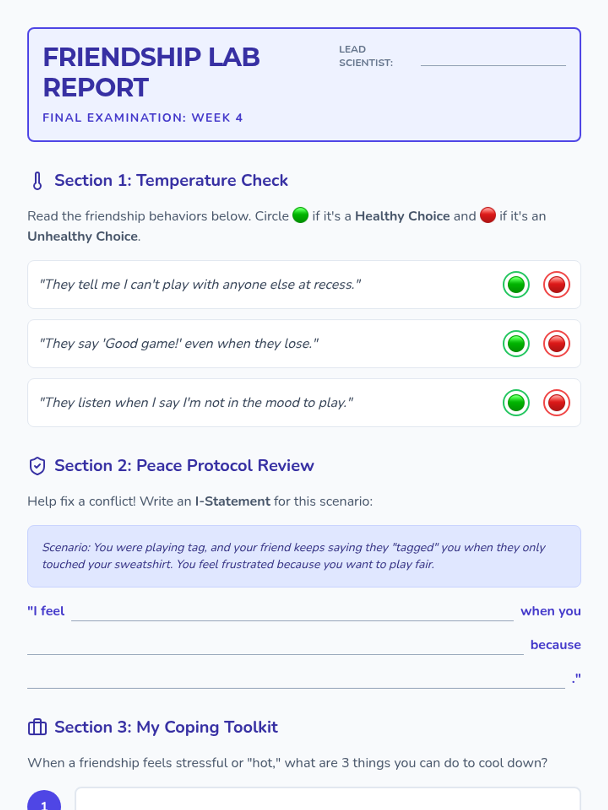 Consolidates learning by identifying traits of healthy vs. unhealthy friendships and teaching coping strategies for social stress. Students complete a final 'Lab Report' reflection.