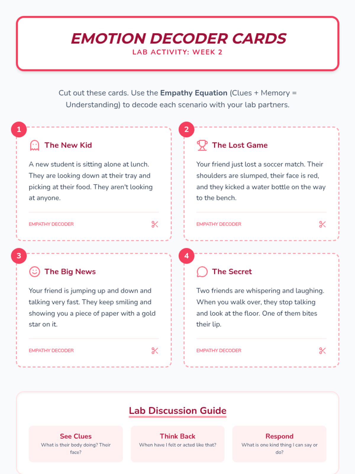 Explores the role of emotions in relationships and the importance of empathy. Students learn to decode others' feelings and see situations from different perspectives.