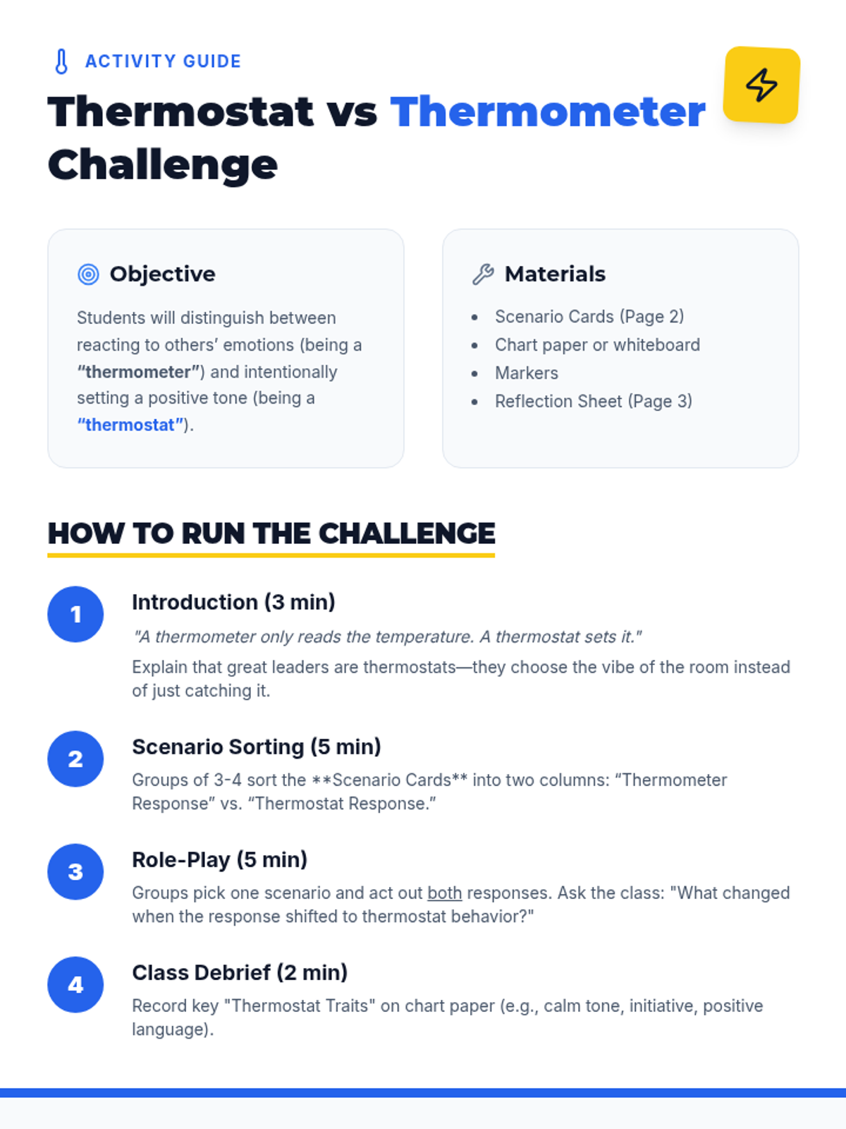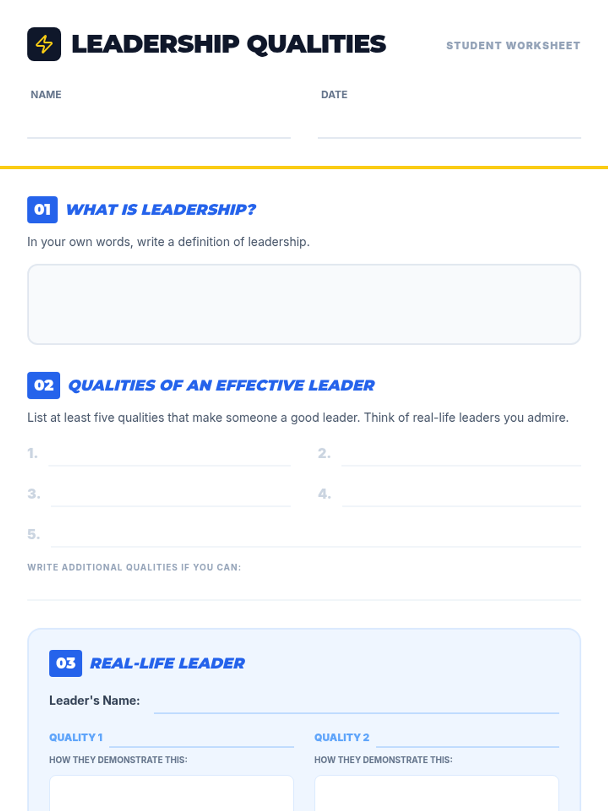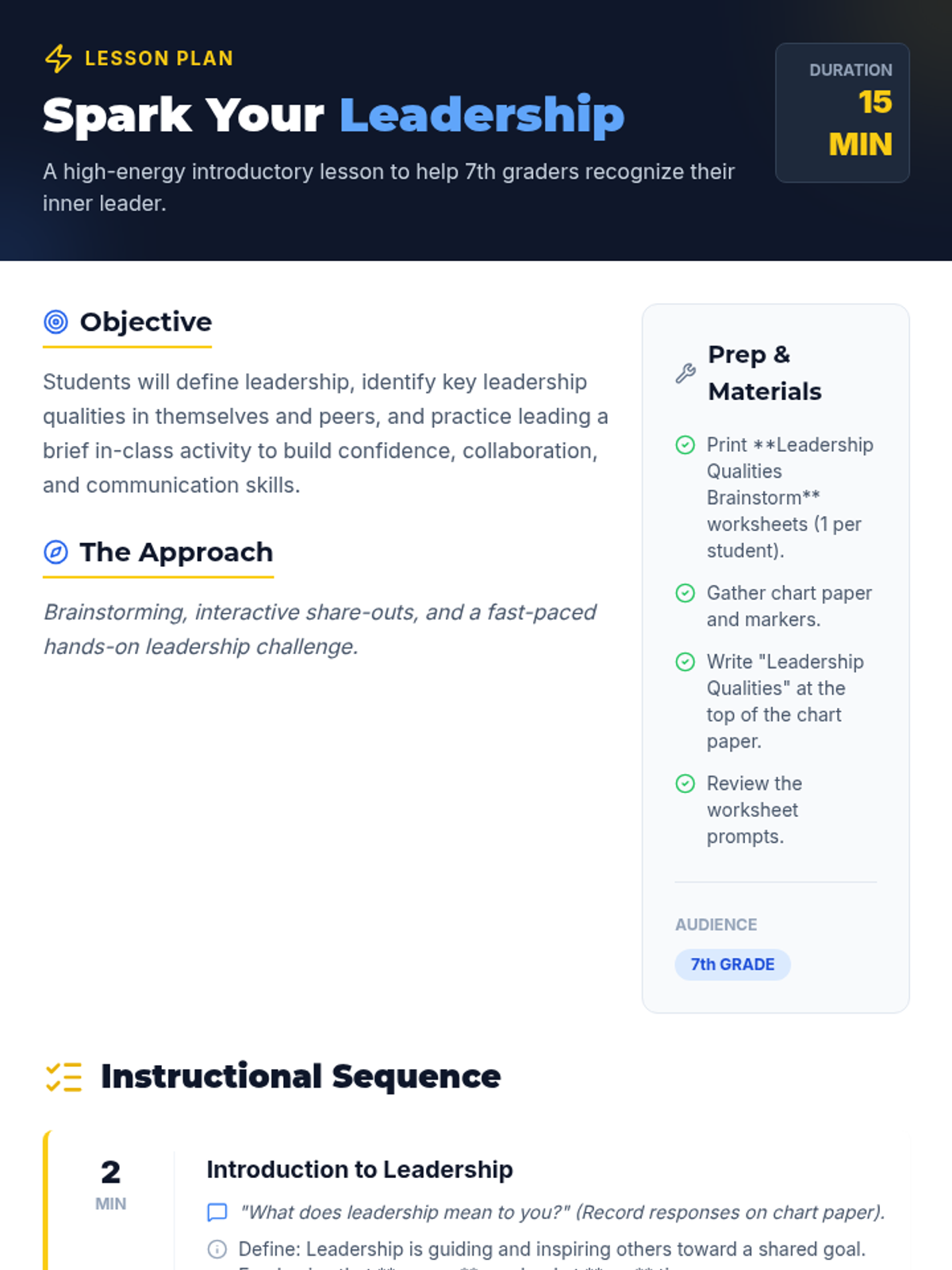 A high-energy 15-minute introductory lesson for 7th graders to define leadership, identify personal leadership traits, and practice leading through collaborative activities.