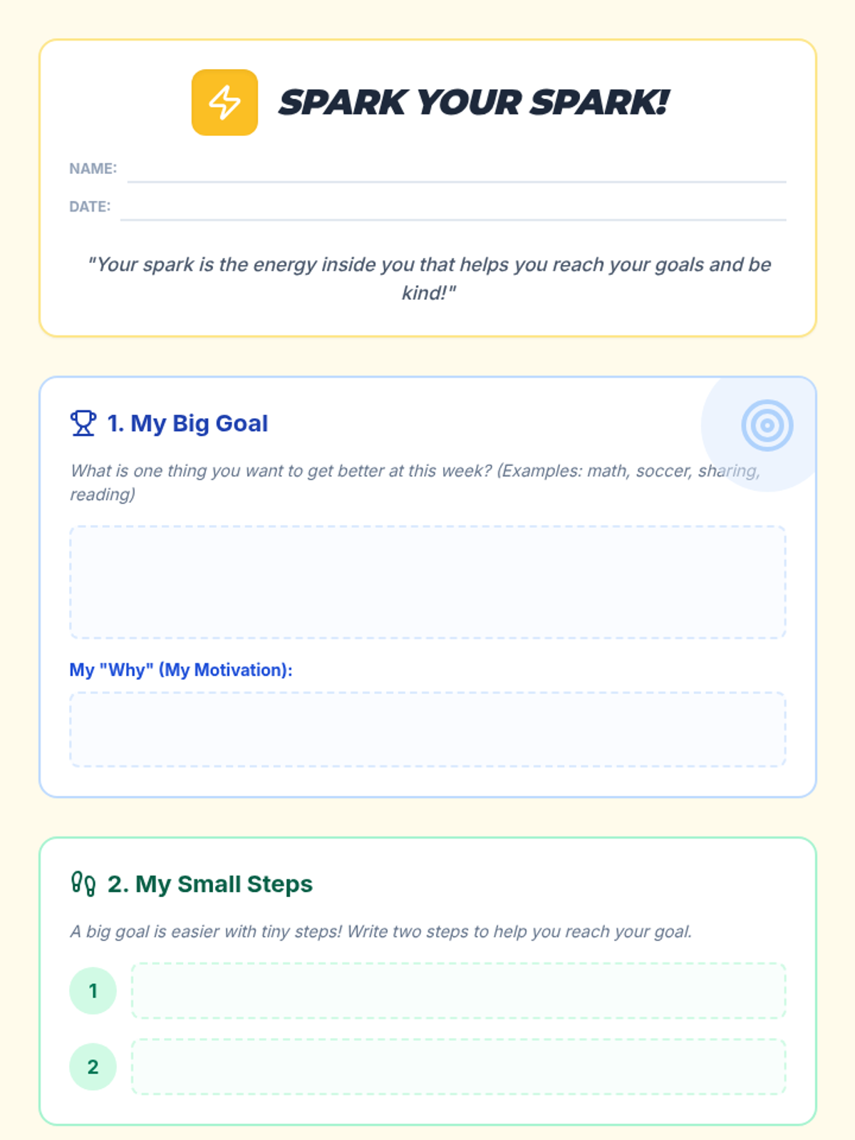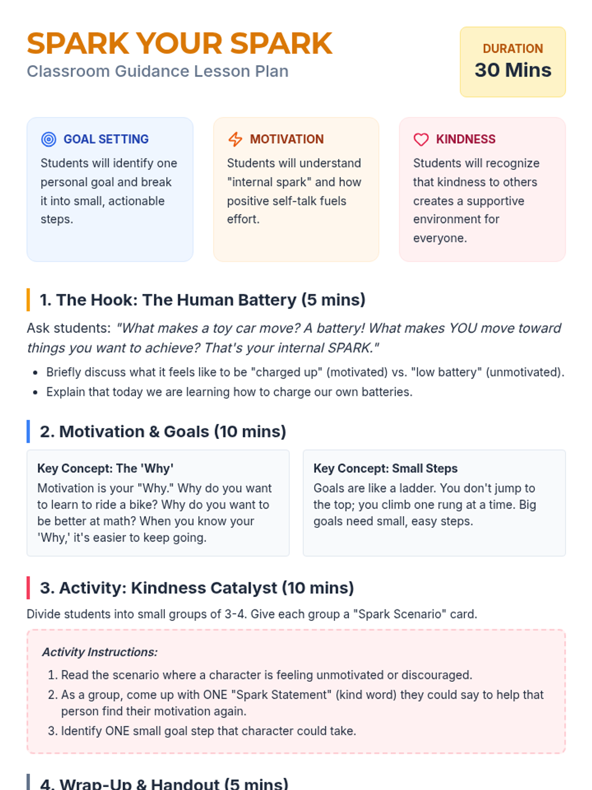A 30-minute school counseling lesson for elementary students focused on building self-motivation, setting achievable goals, and practicing kindness towards others and oneself.
