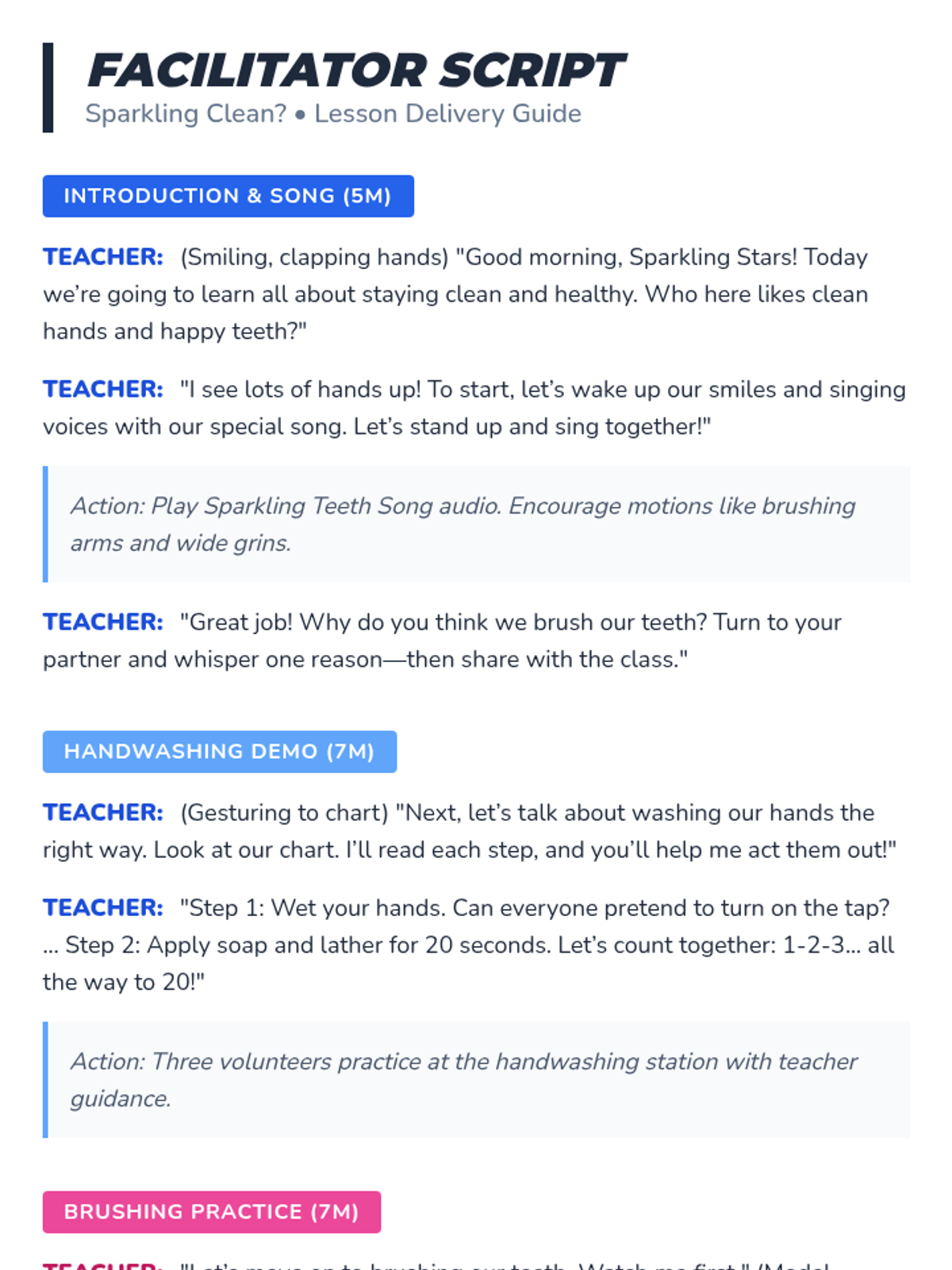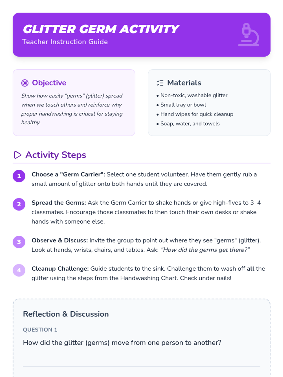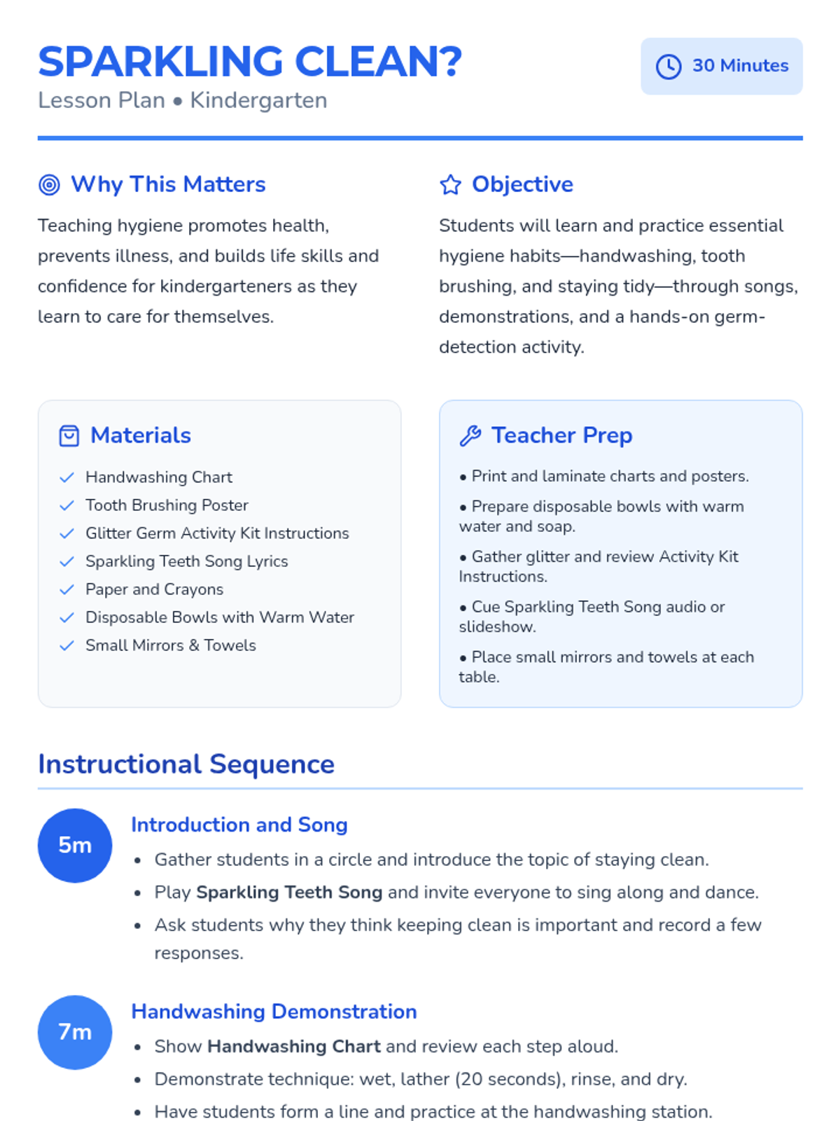 A 30-minute kindergarten lesson teaching handwashing, tooth brushing, and germ awareness through songs, demonstrations, and a hands-on glitter activity.