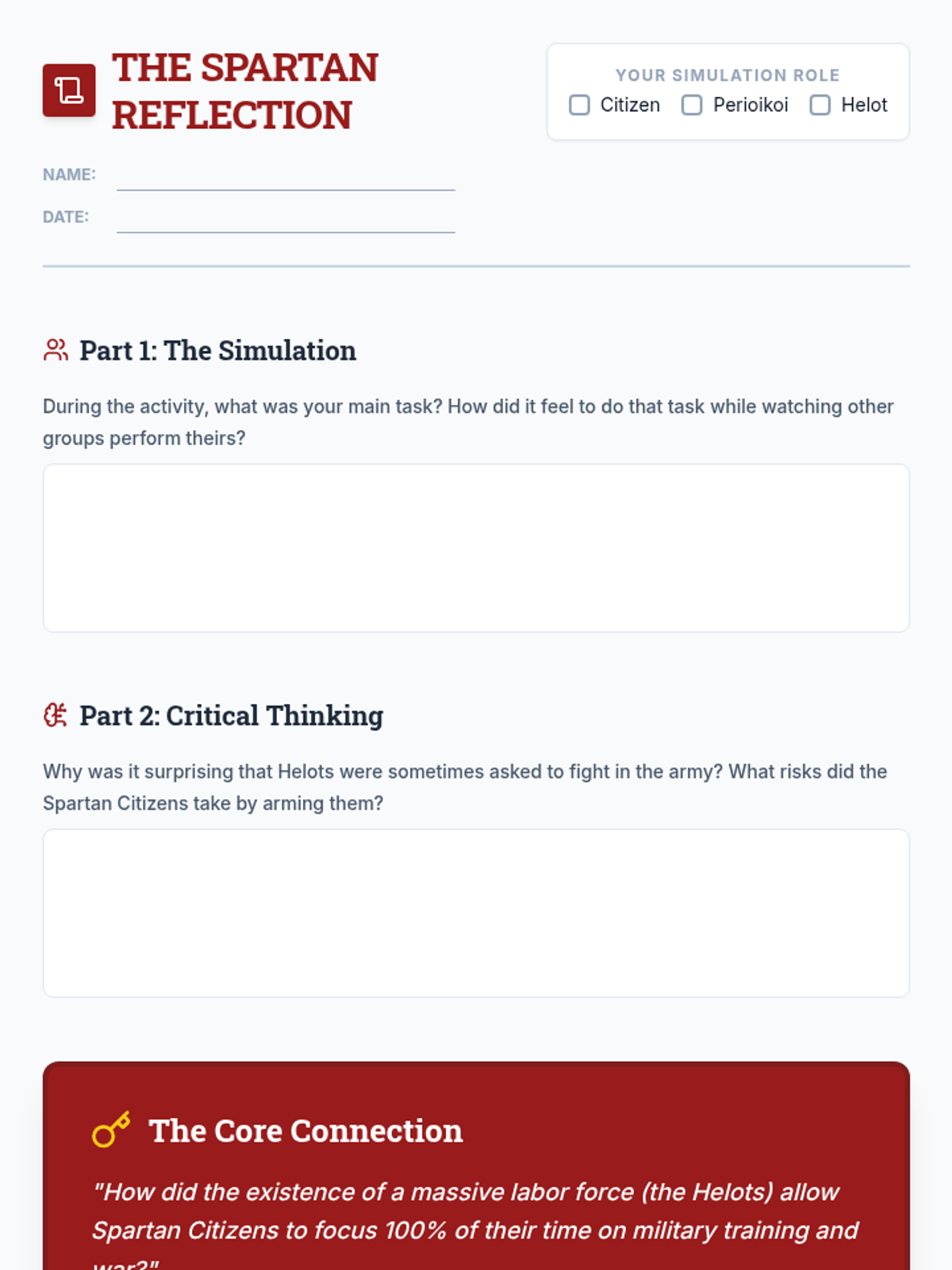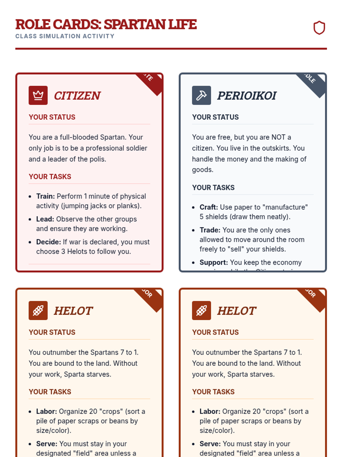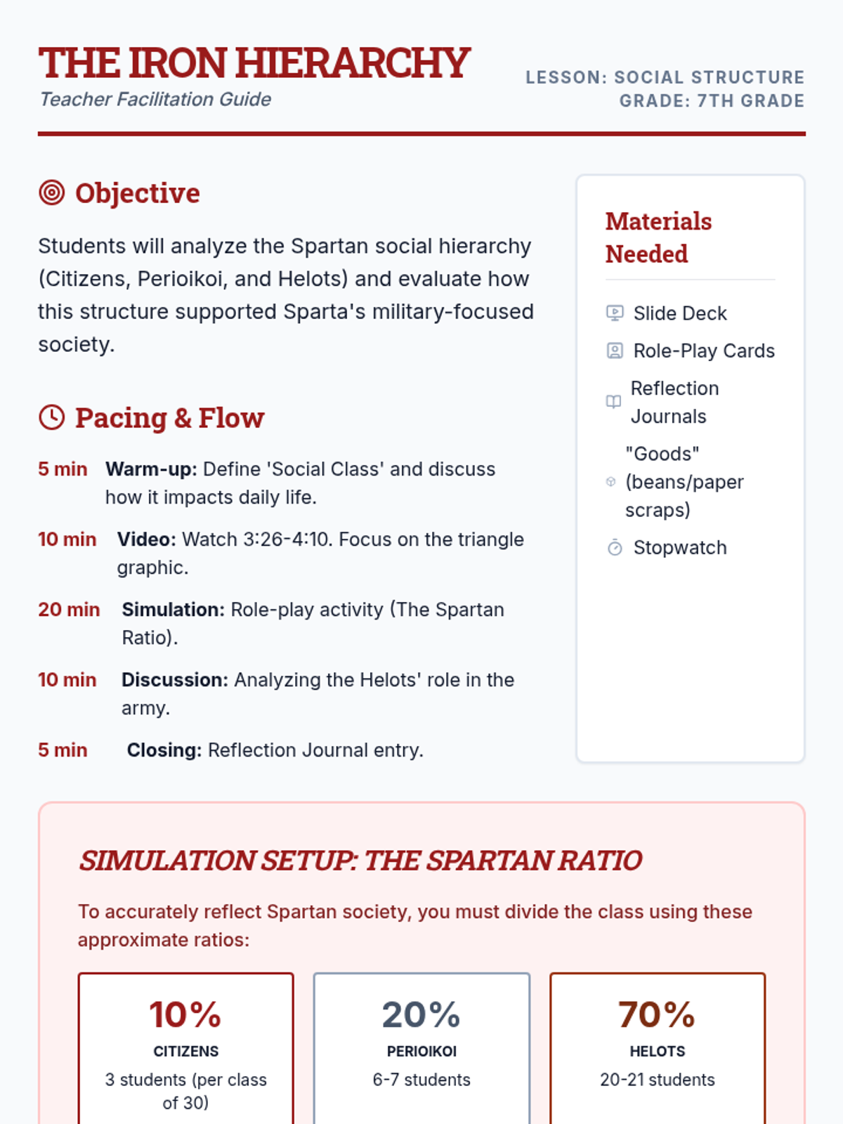 A lesson exploring the rigid social structure of Ancient Sparta, focusing on the roles of Citizens, Perioikoi, and Helots through a classroom simulation.