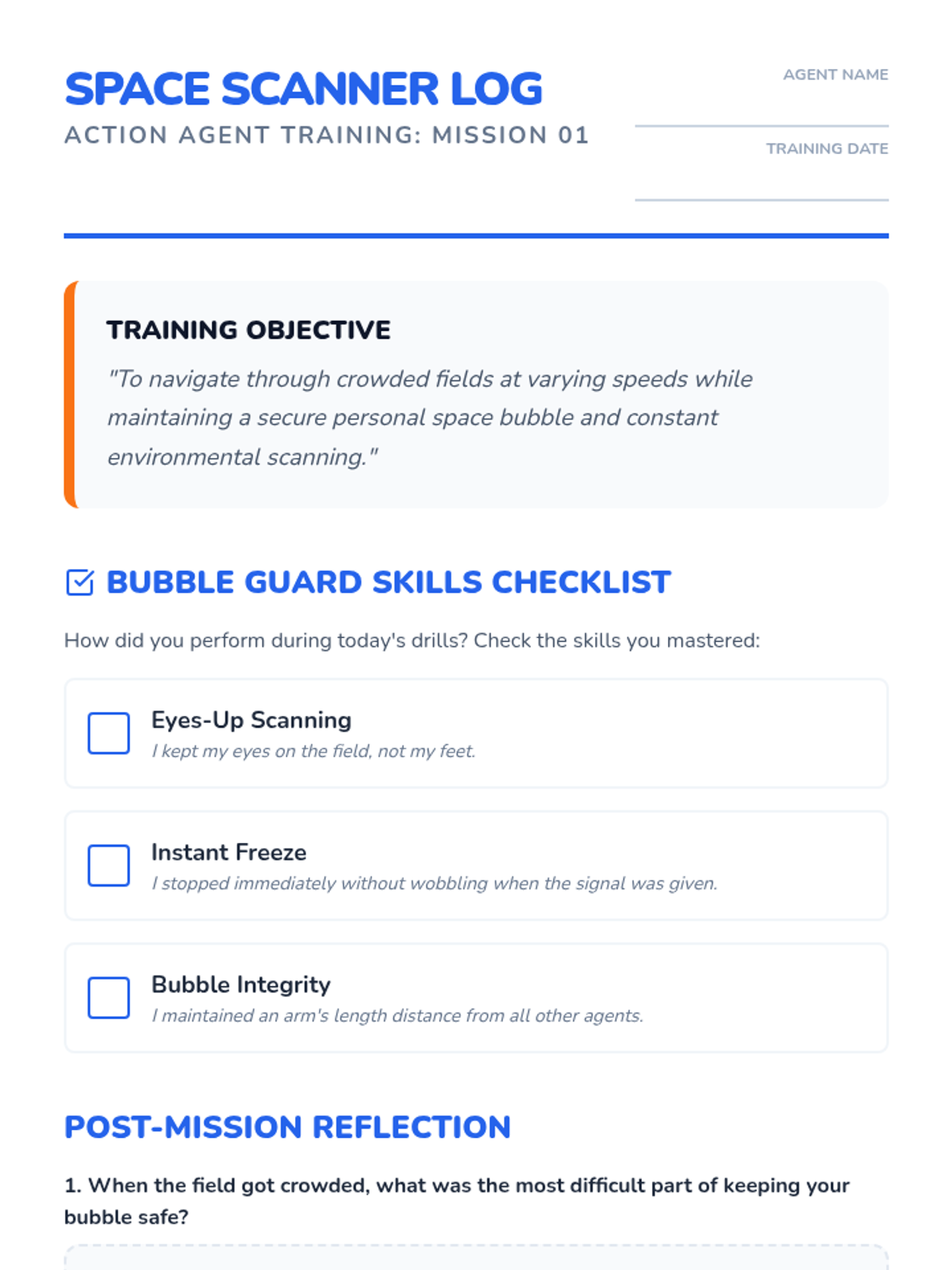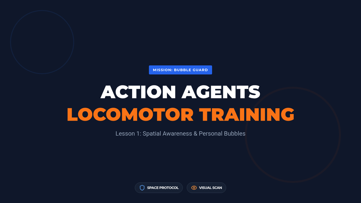 Students practice moving through space safely, focusing on the concept of 'personal space bubbles' and visual scanning during walking and running.