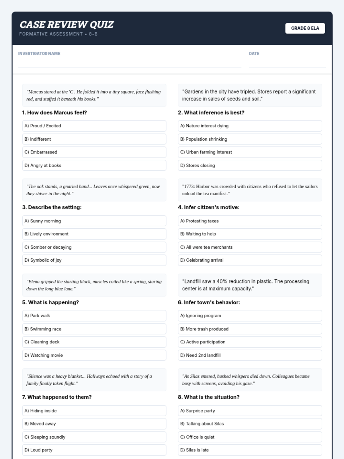 A comprehensive Grade 8 ELA lesson focused on mastering logical inferences across mixed genres, utilizing a 'detective' theme to engage students in close reading and evidence-based reasoning.