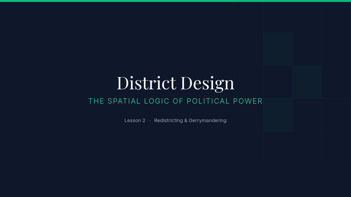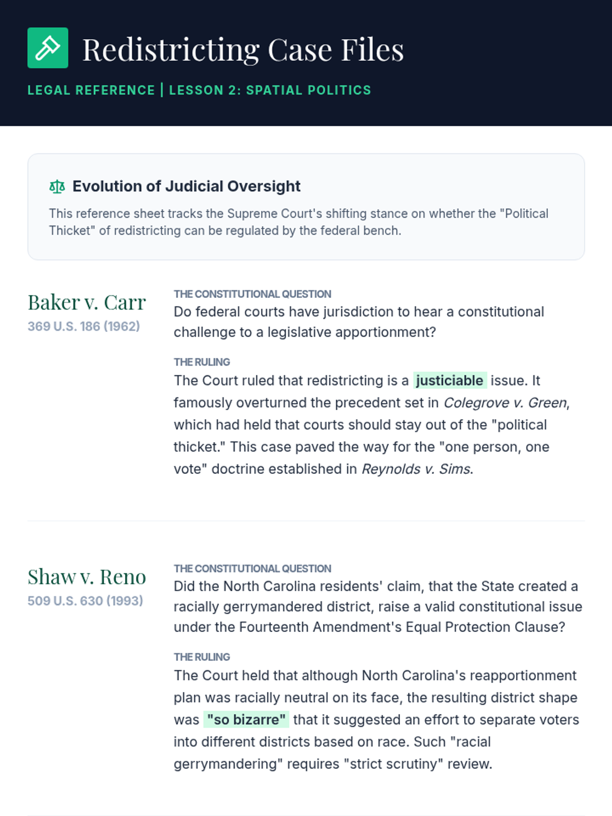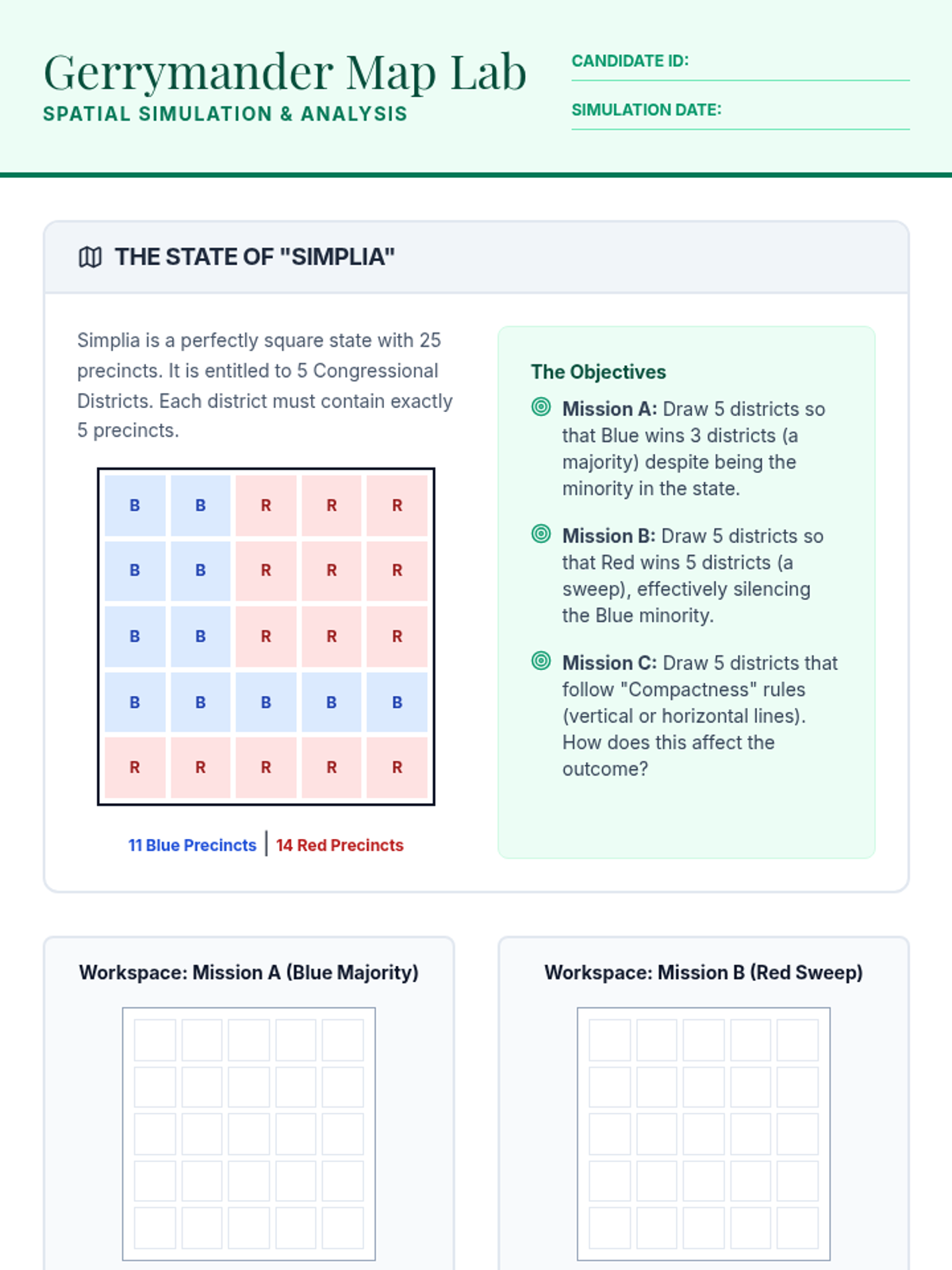 Students examine the spatial logic of redistricting, simulating gerrymandering techniques and analyzing key Supreme Court cases on representation.