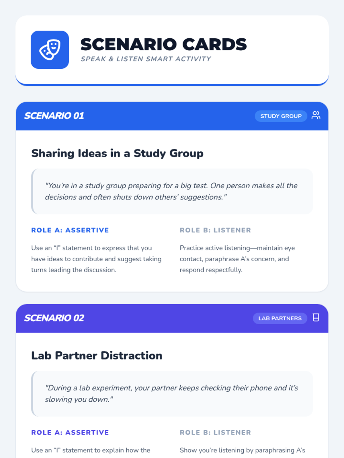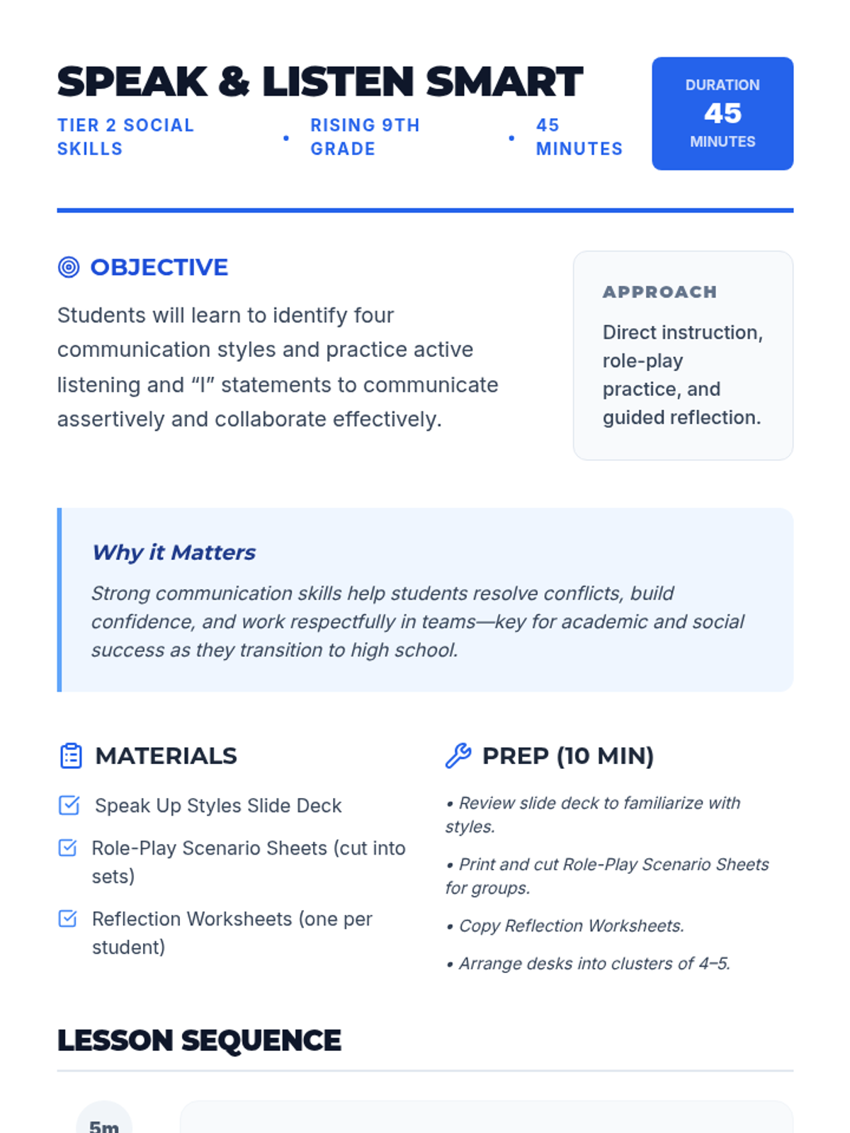 A 45-minute Tier 2 social-emotional learning session for rising 9th graders focused on identifying communication styles, practicing active listening, and using 'I' statements.